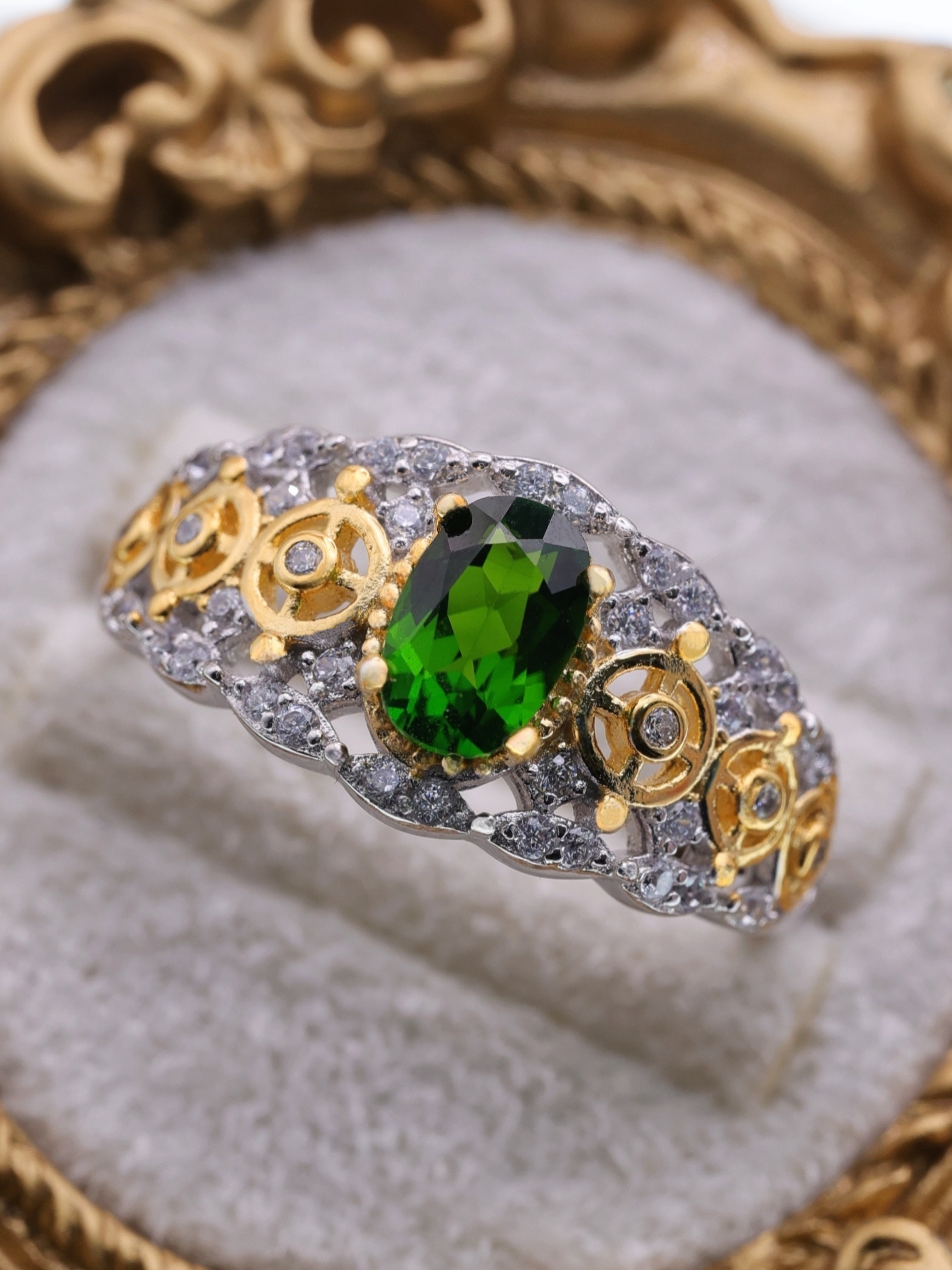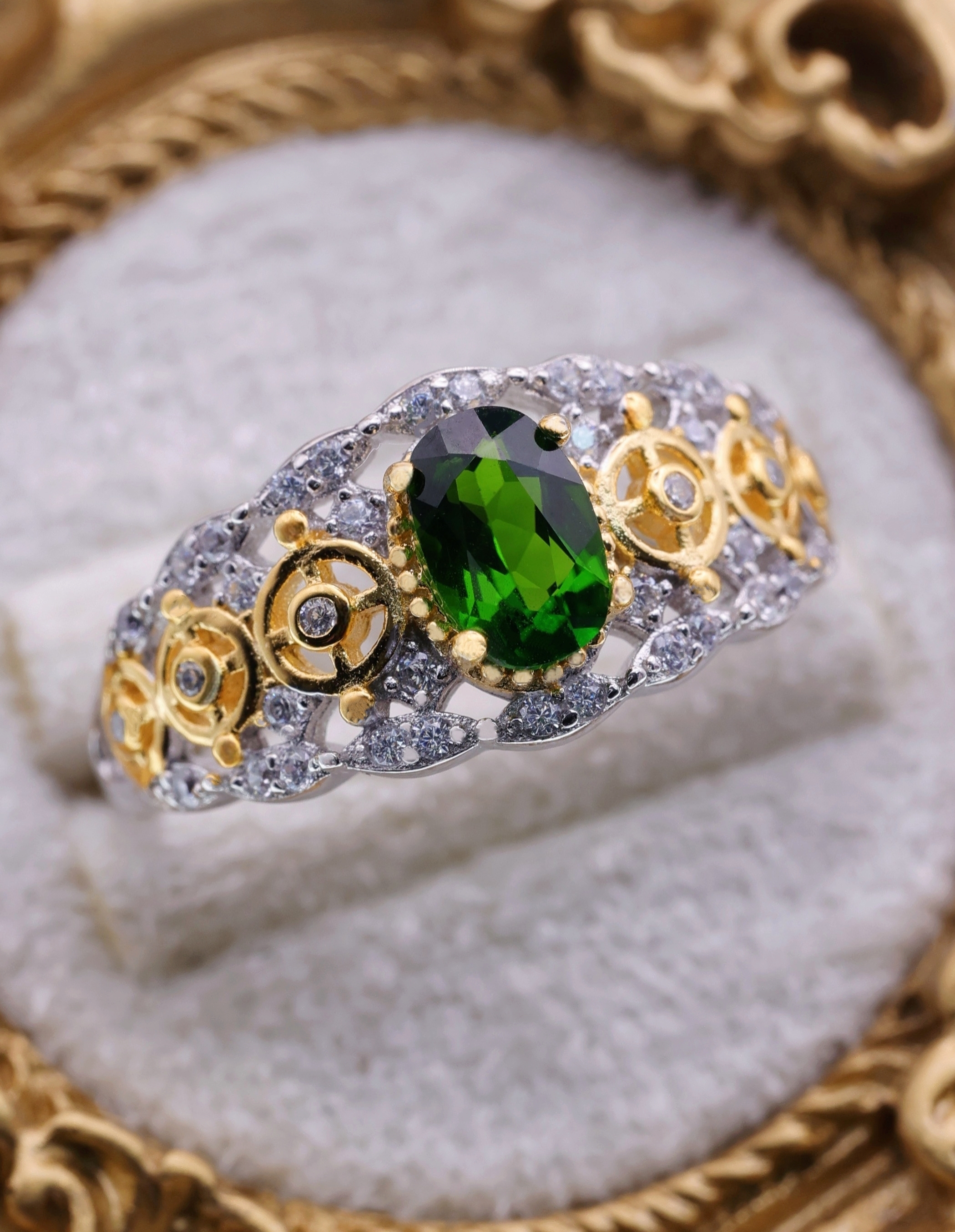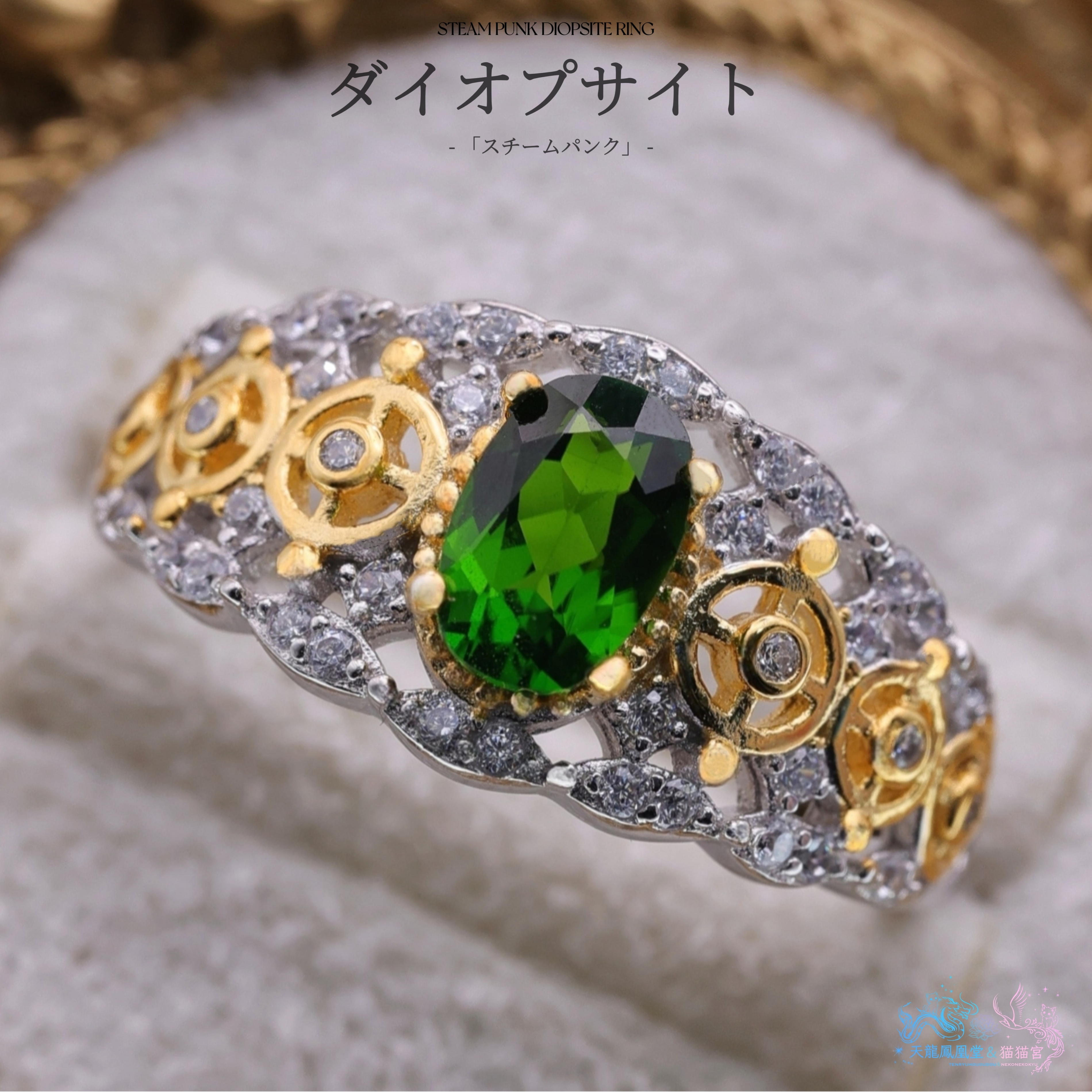 深い森を思わせる鮮烈なグリーンを放つダイオプサイトをセンターに据え、両サイドには精巧な歯車モチーフを配したデザインリング。透明感のあるグリーンとゴールドの機械装飾が織りなすコントラストは、まるで自然と機械文明が交錯するかのような幻想的な世界観を映し出します。