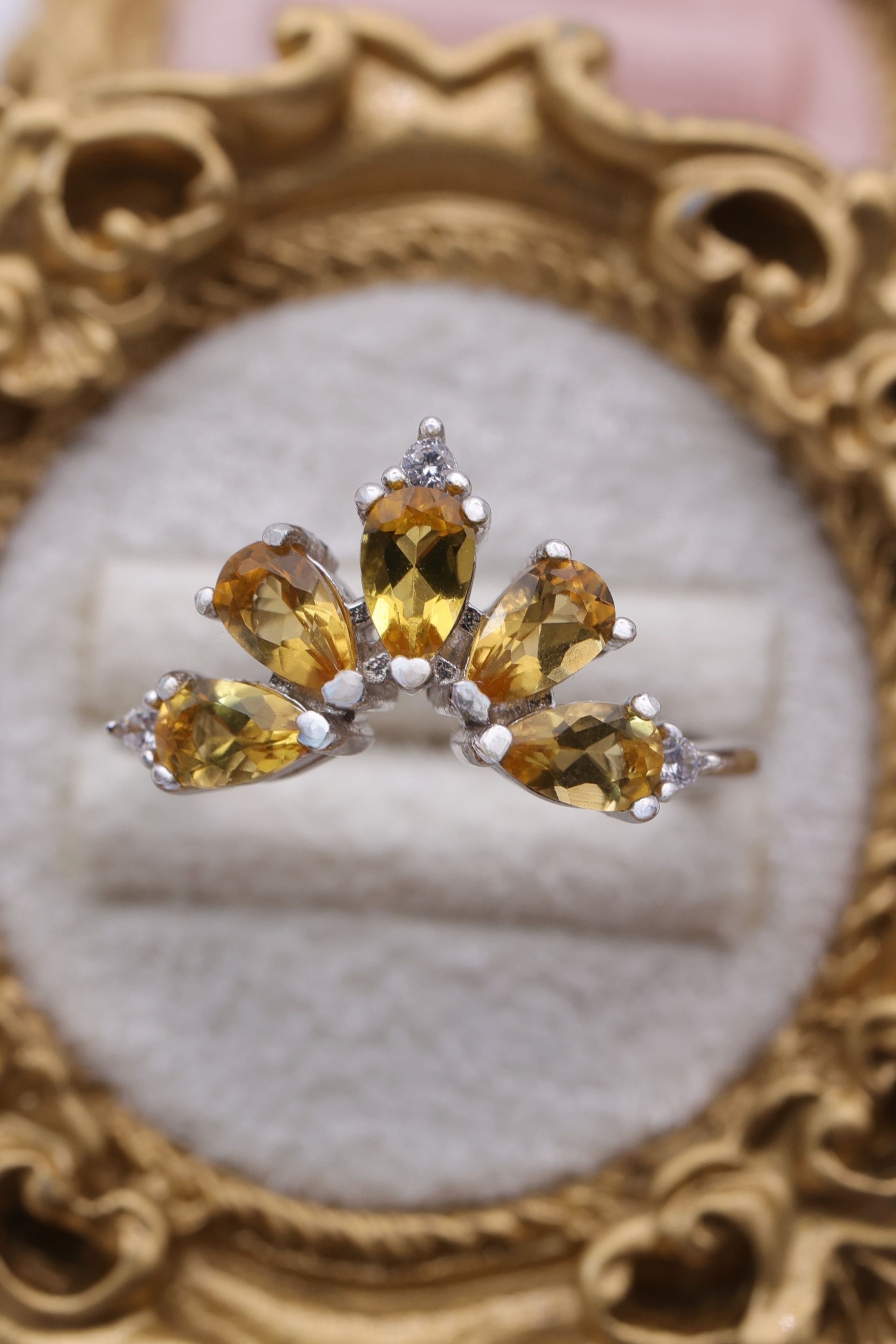 ペアシェイプにカットされた石を王冠のように配することで、光を受けるたびに花びらのように広がる輝きを描き出し、気品と華やぎを指先に添えます。シルバーカラーの地金が黄金の輝きを際立たせ、まるで朝日がきらめく王冠のような佇まいに。