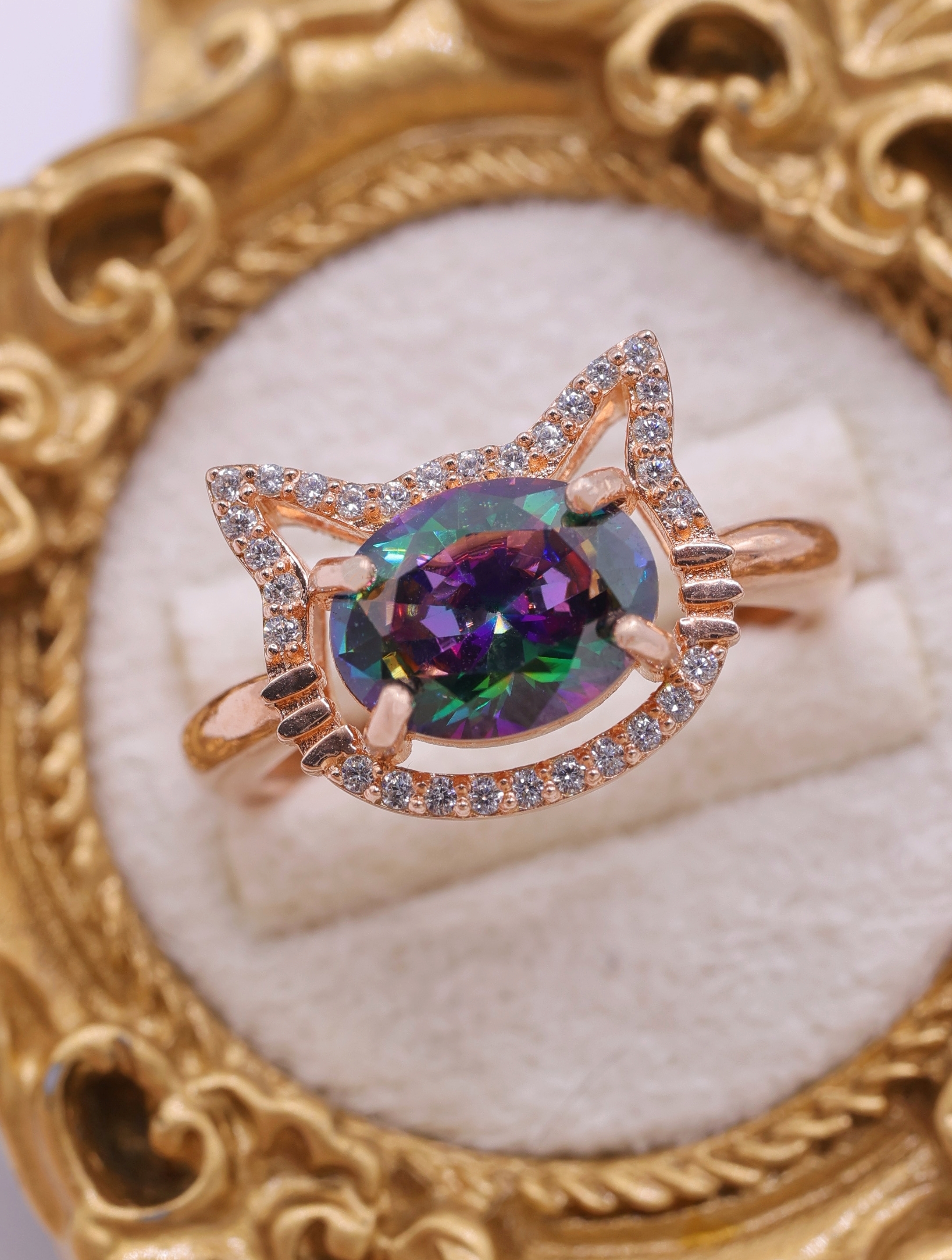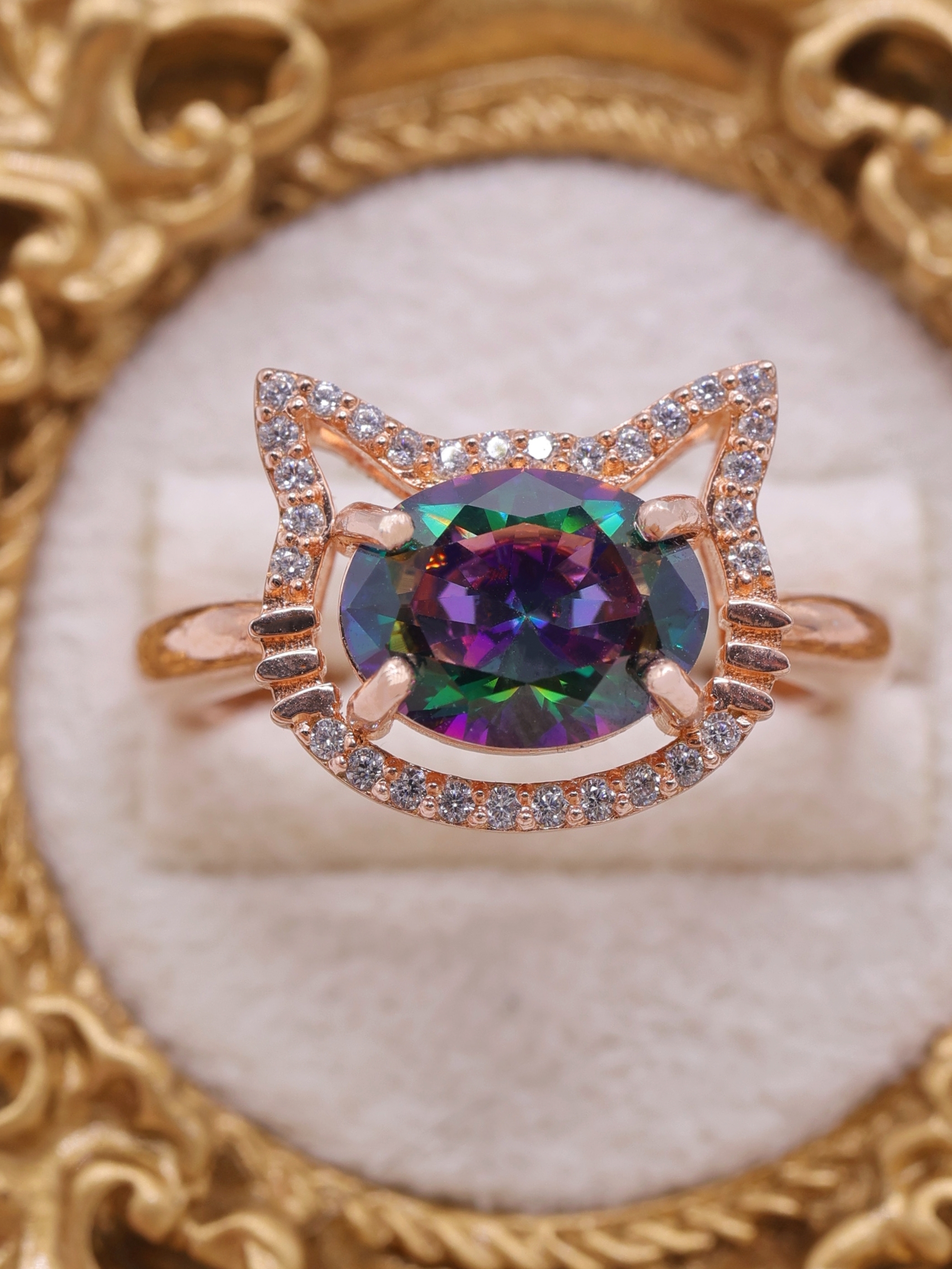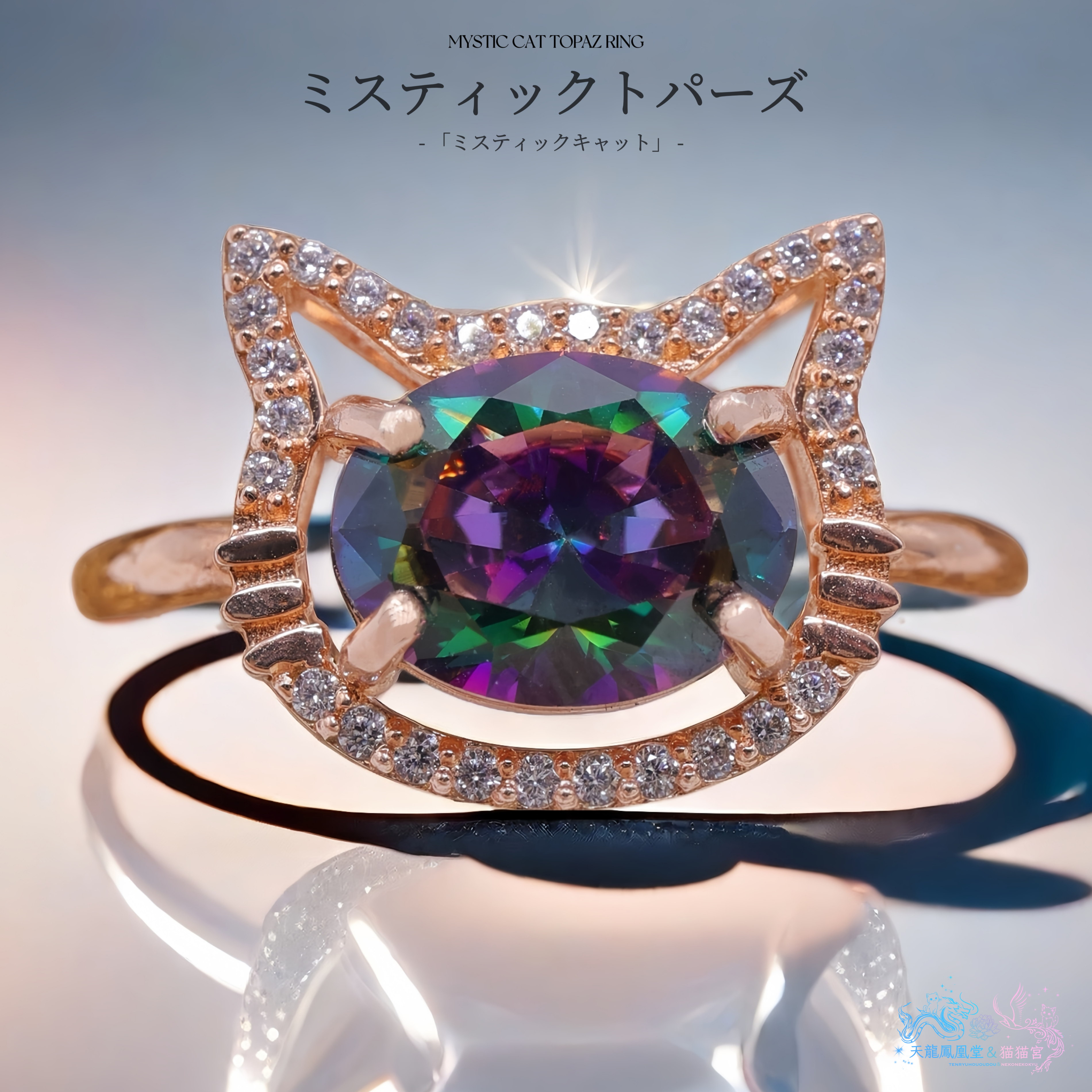 こちらのリングは、愛らしい猫の形をした枠に、熟練の職人によって輝くミスティックトパーズがセッティングされています。