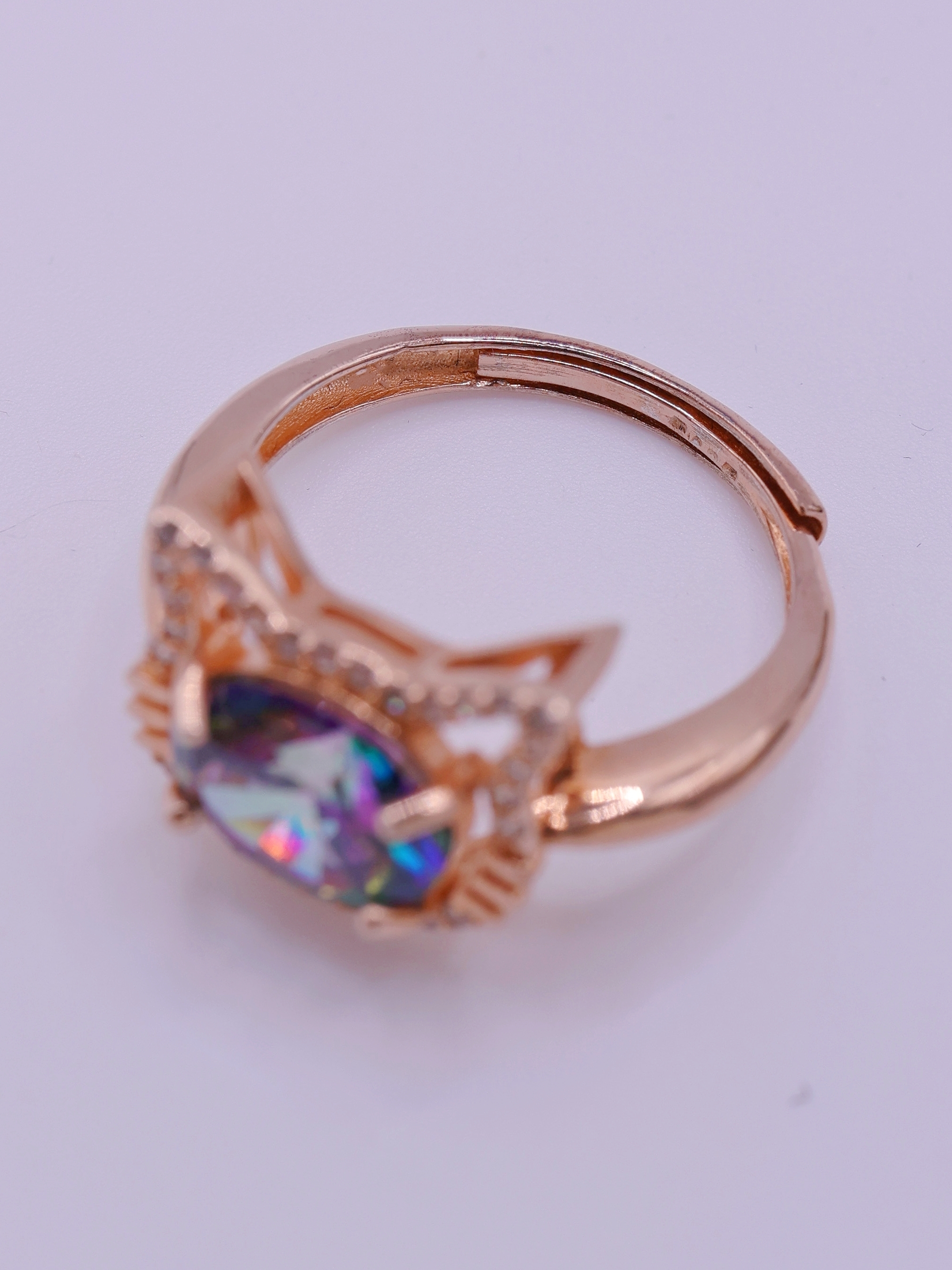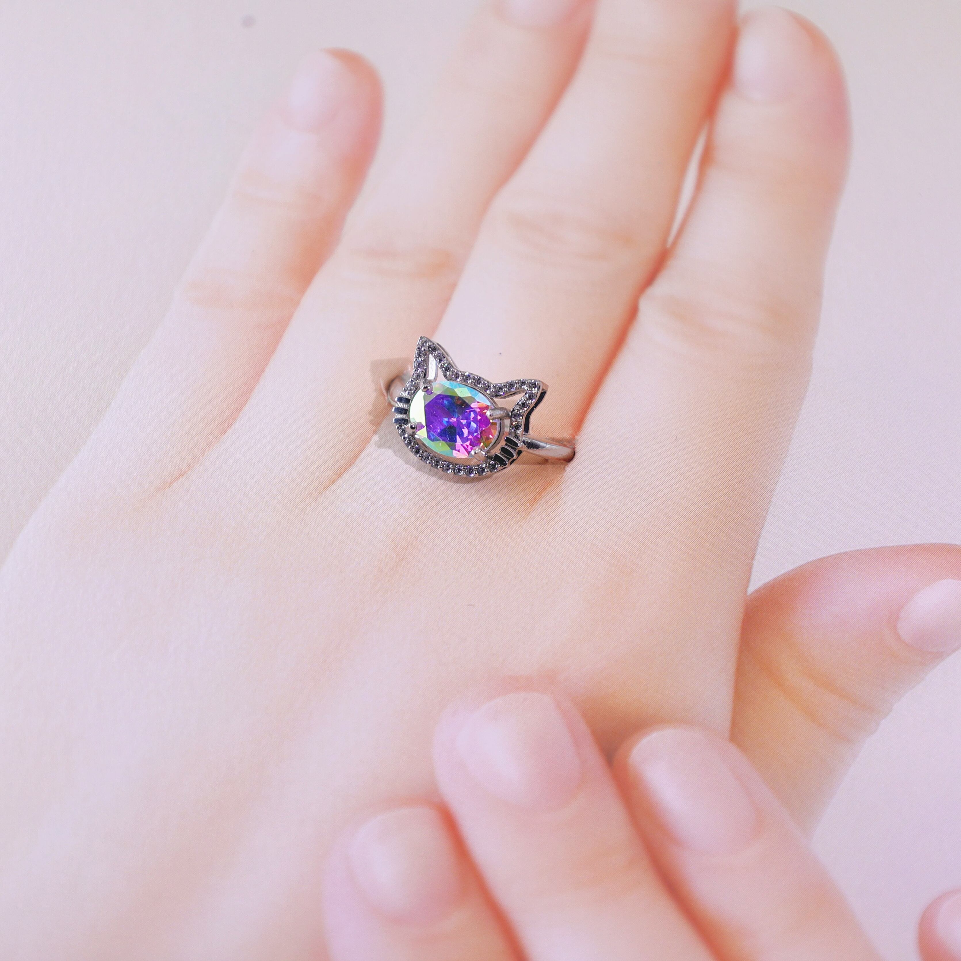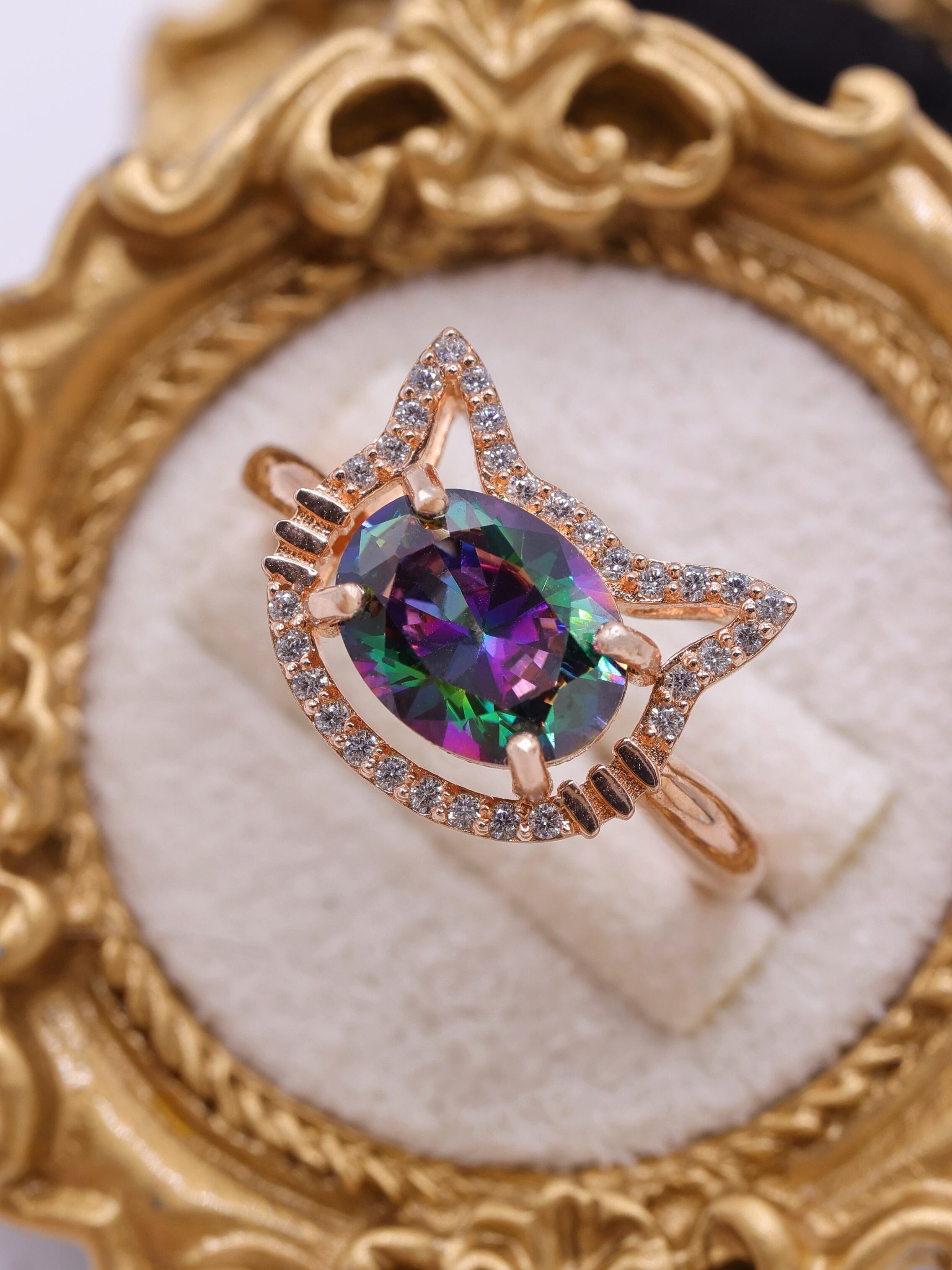 こちらのリングは、愛らしい猫の形をした枠に、熟練の職人によって輝くミスティックトパーズがセッティングされています。