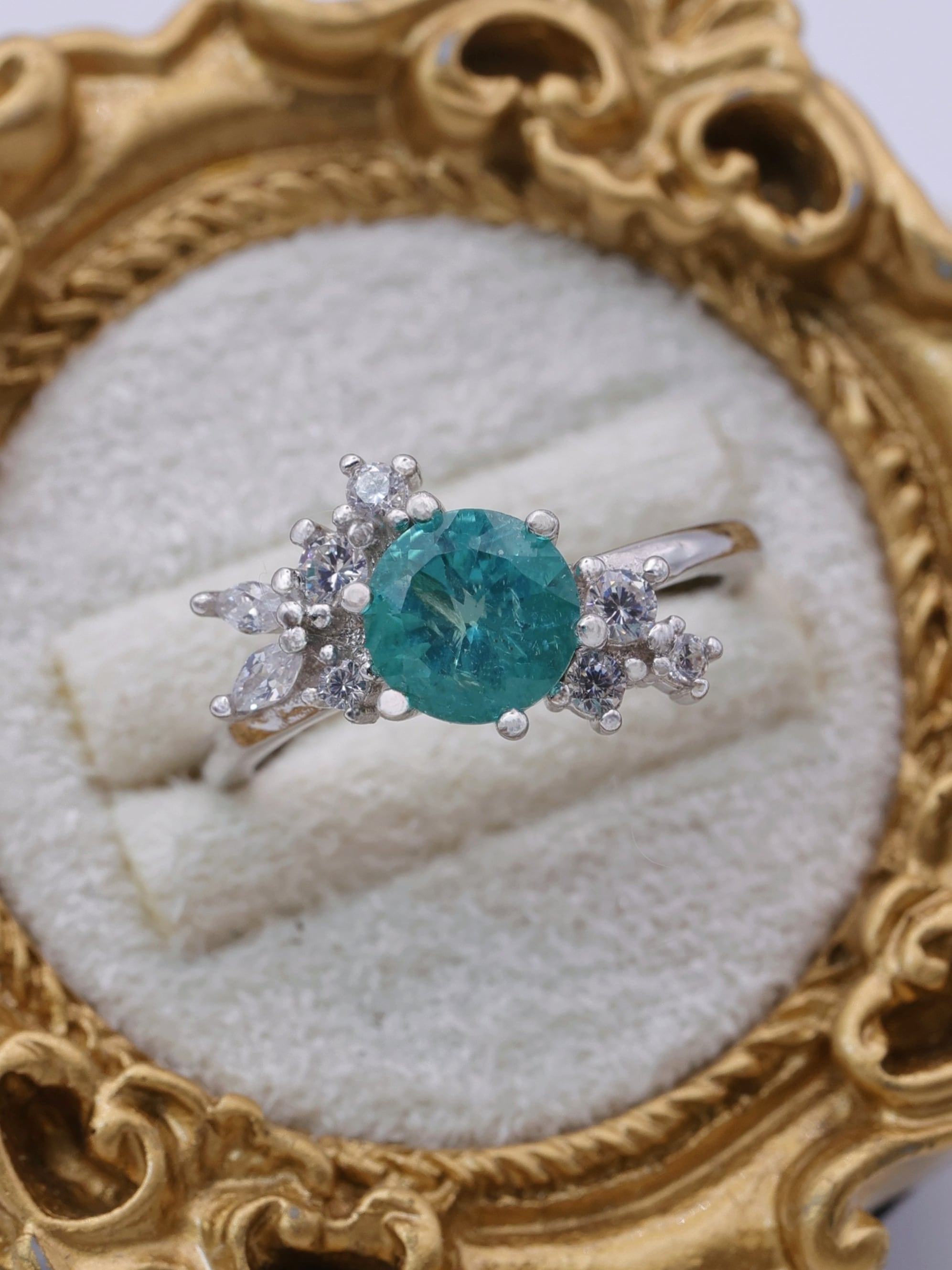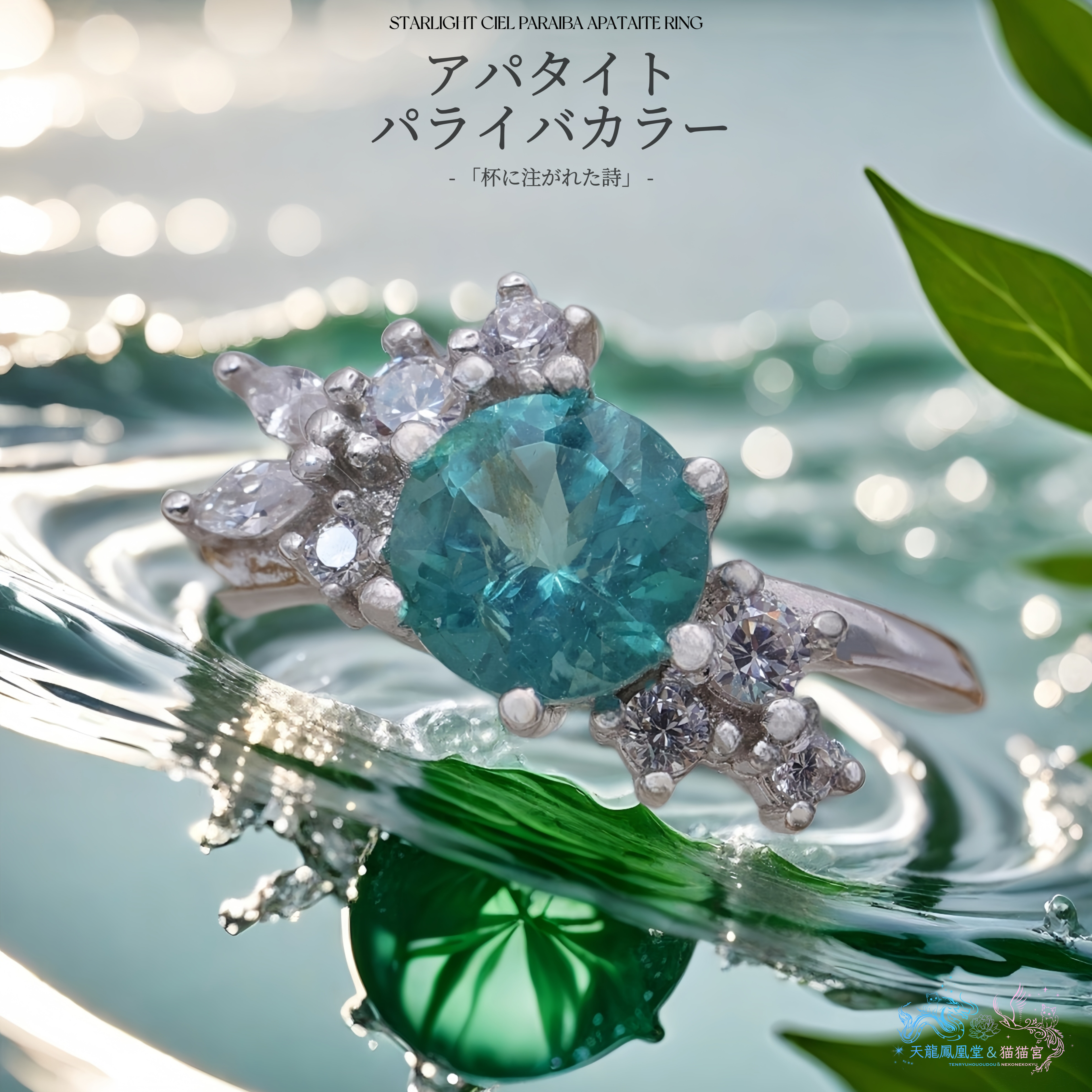 メインストーンには、南国の海を思わせるパライバカラーのアパタイトを使用。