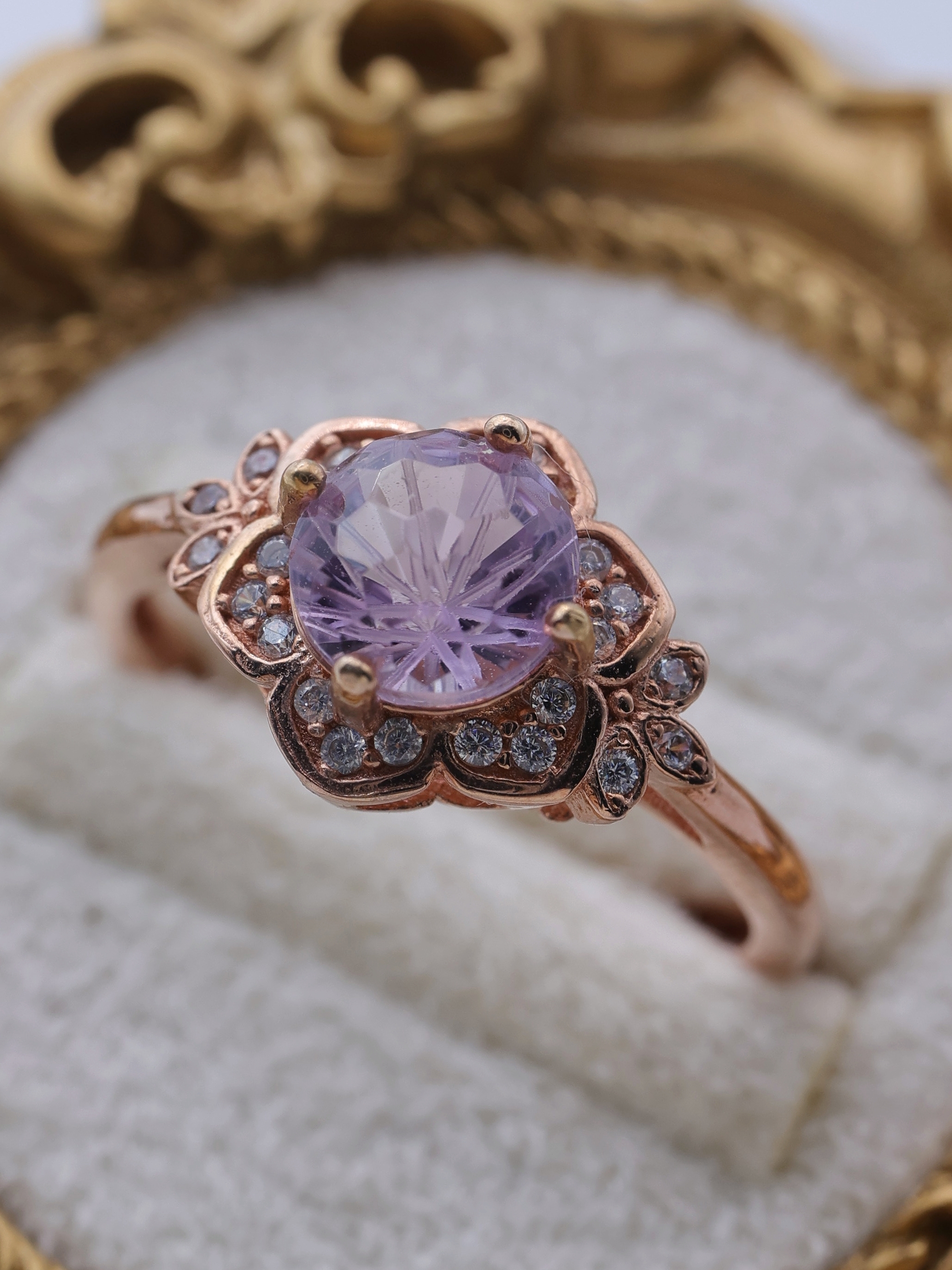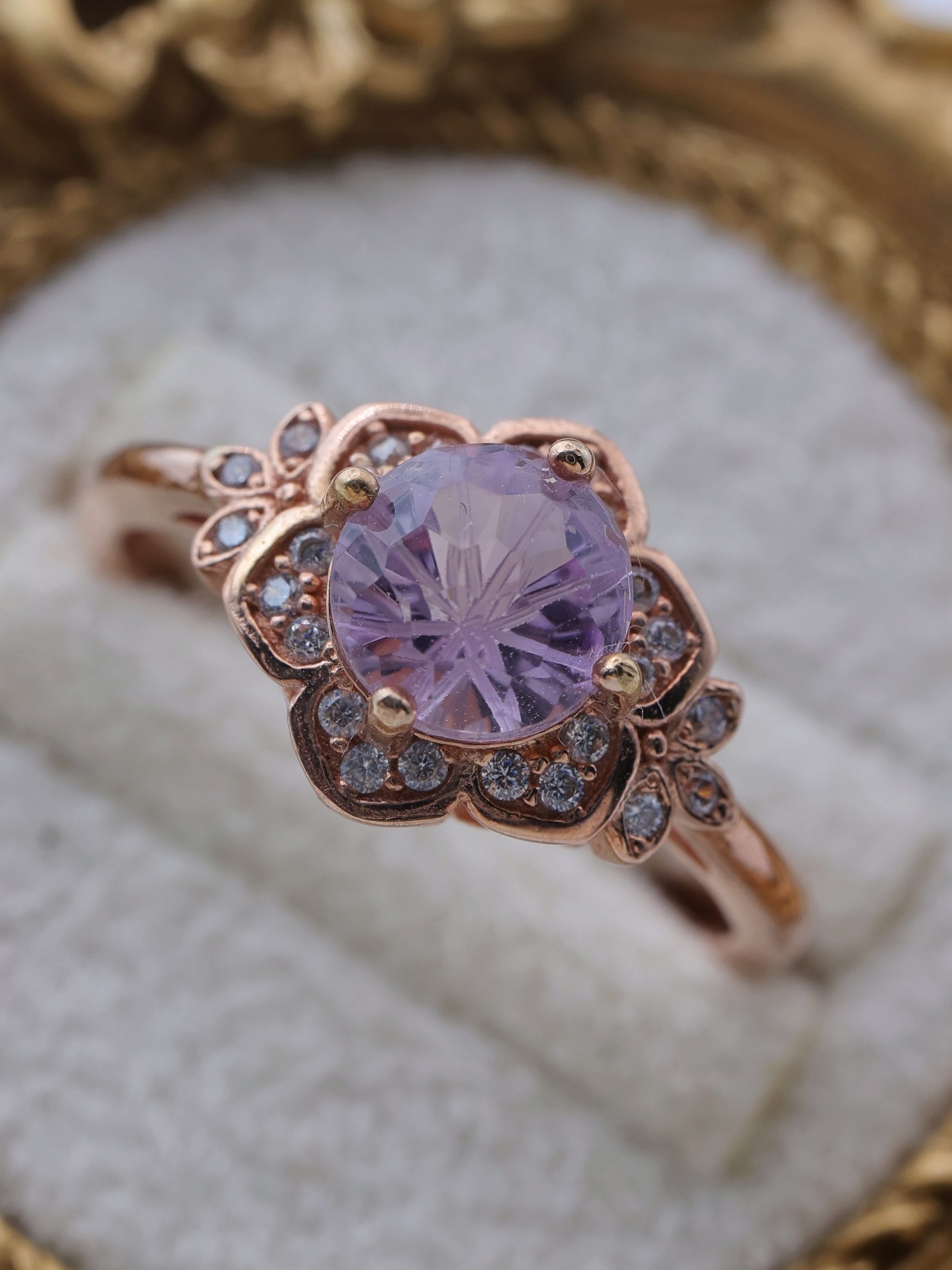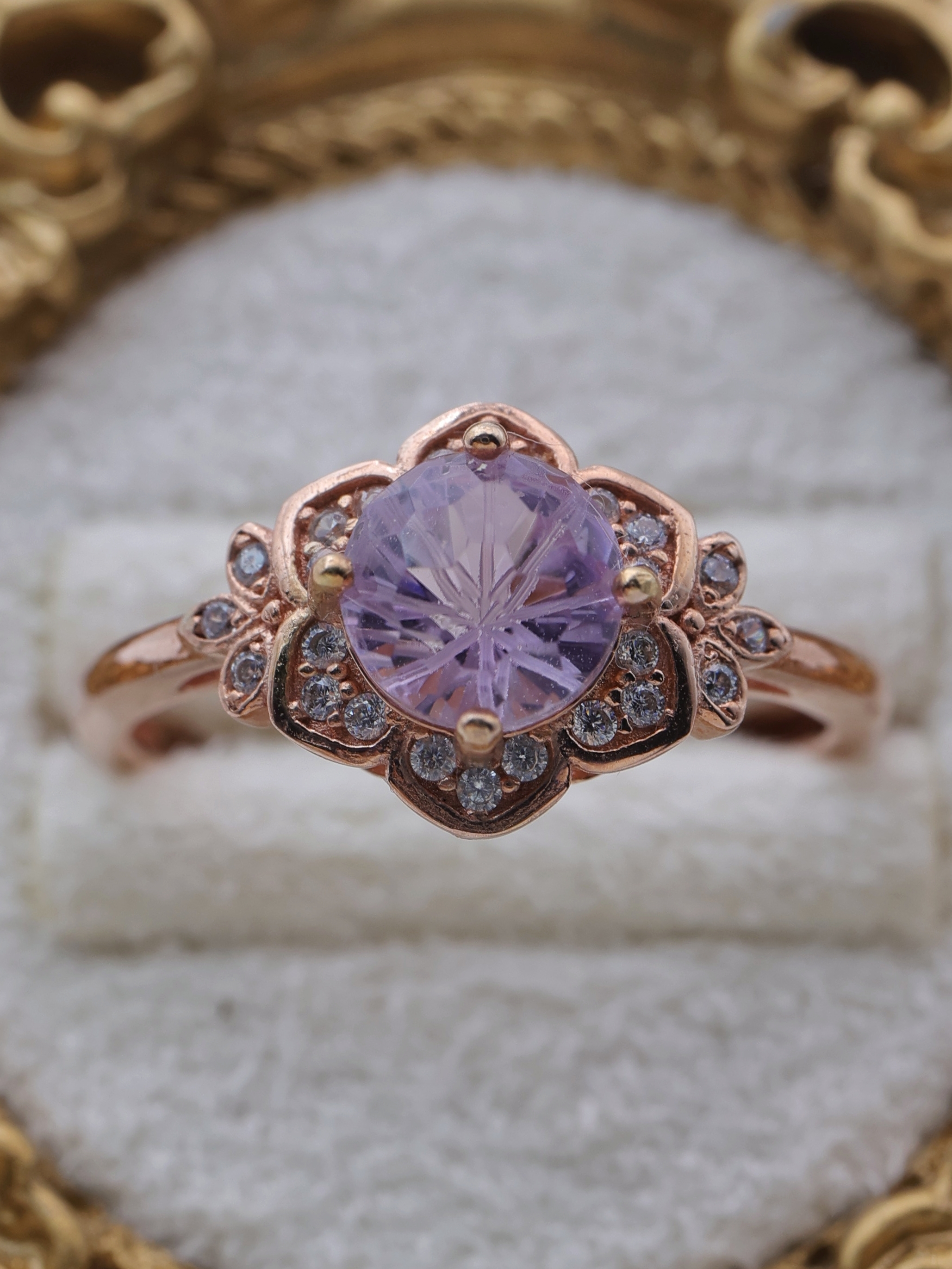 夜空に広がる花火のような、煌めきと神秘を纏ったこのリングは、まるで星々が手を取り合うかのような存在感を放ちます。鮮やかな紫色のアメジストが、贅沢に施された花火カットによって、光を浴びるたびに情熱的な輝きを放ちます。