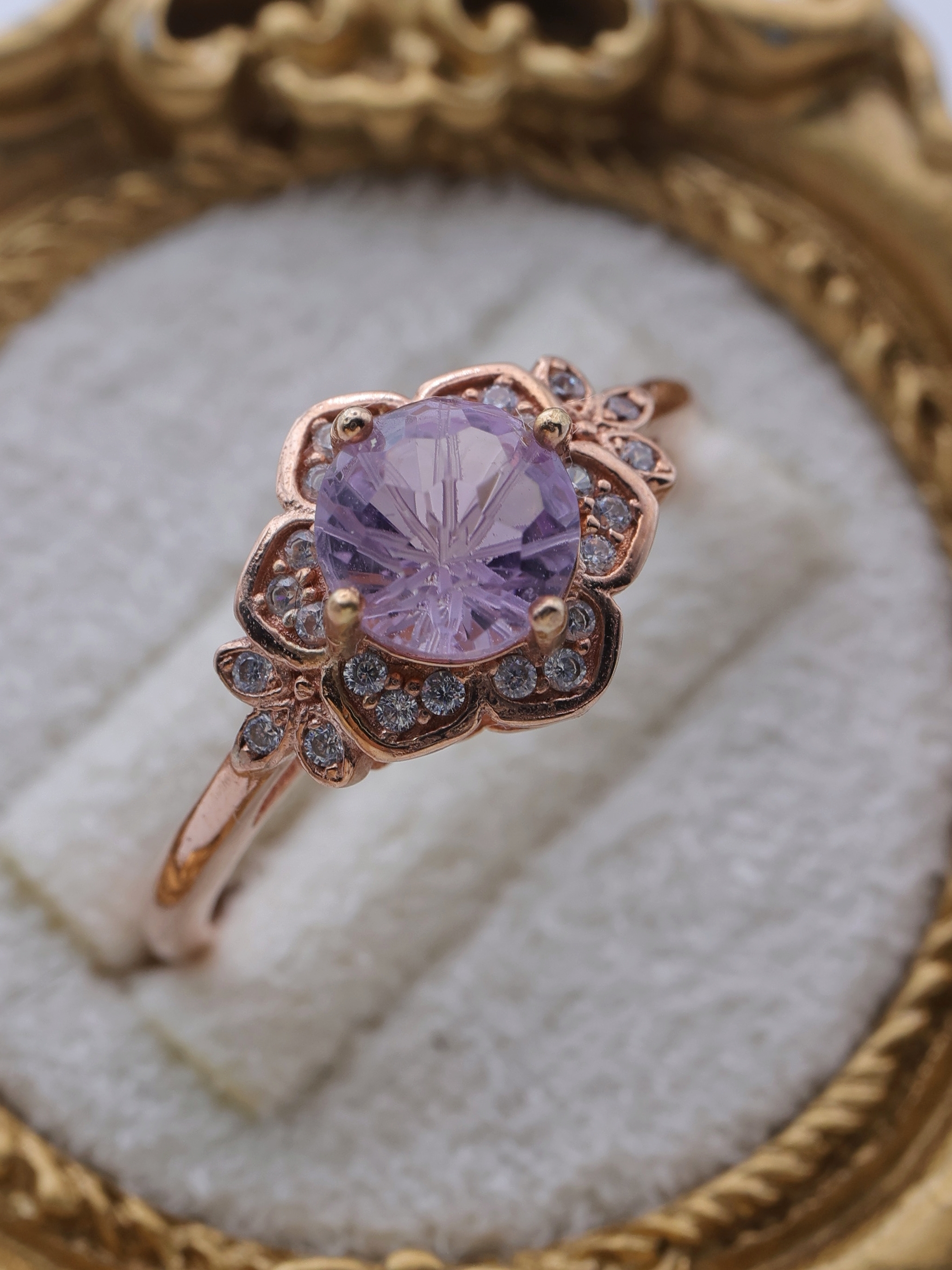 花火の美しさを思わせるカットが施された中石は、まるで夜空に映える光の軌跡のよう。安らぎと魅力を与えるアメジストは、心に安らぎをもたらし、夢を叶える力が宿ると言われています。指先に宿るこのリングは、特別な瞬間を彩るにふさわしい存在感を持っています。