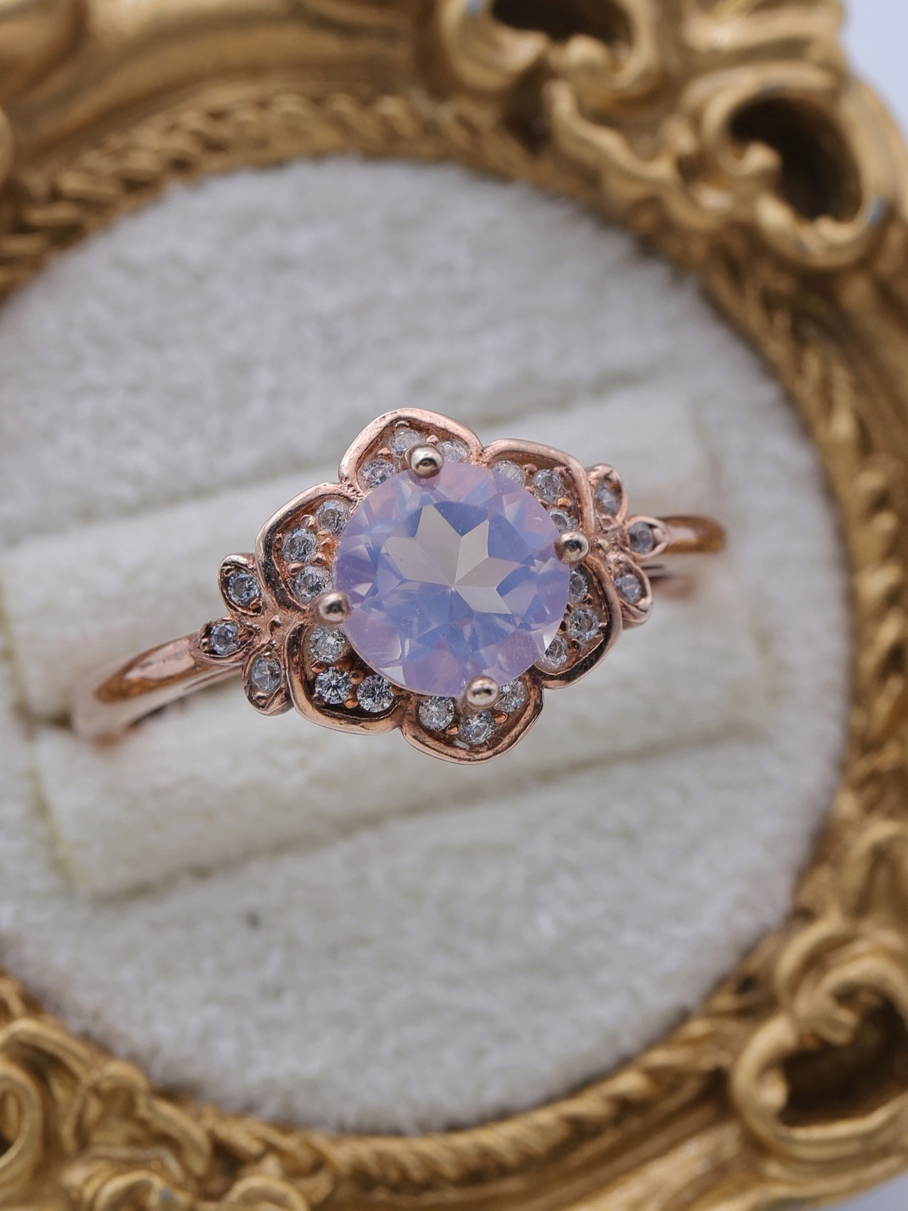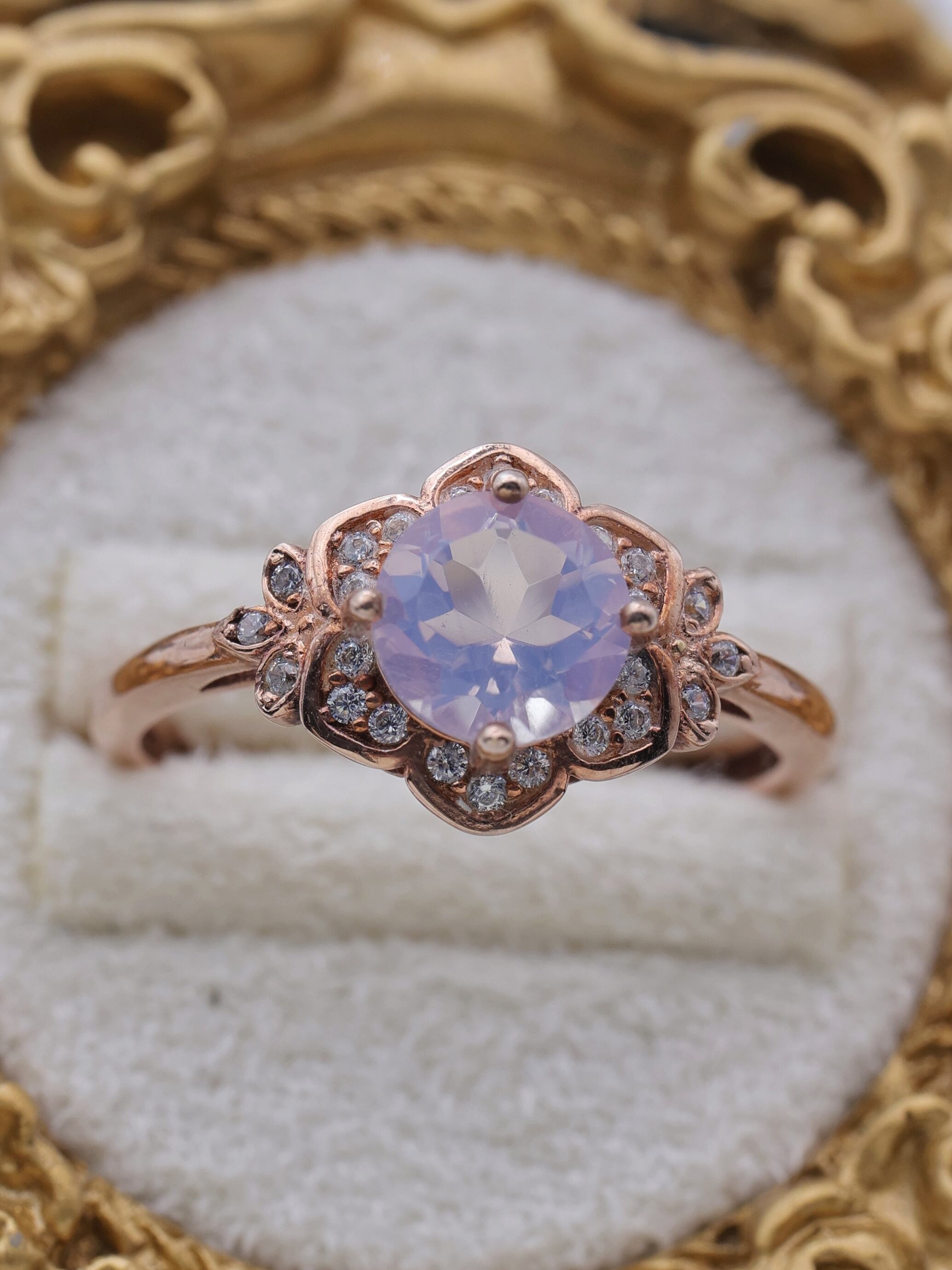 リングの枠は上質なシルバー925を使用し、18金ピンクゴールドメッキで仕上げられており、温かみのある華やかな色合いが指元を優美に彩ります。さらに、主石を取り囲むように配置された7Aランクのジルコニアが、まるで小さな星々のようにキラキラと輝き、リング全体に繊細な輝きを与えます。