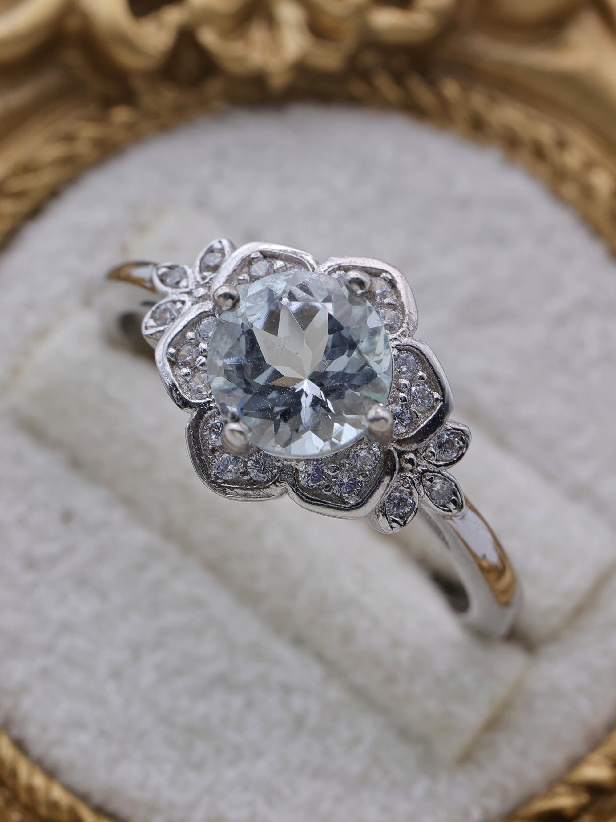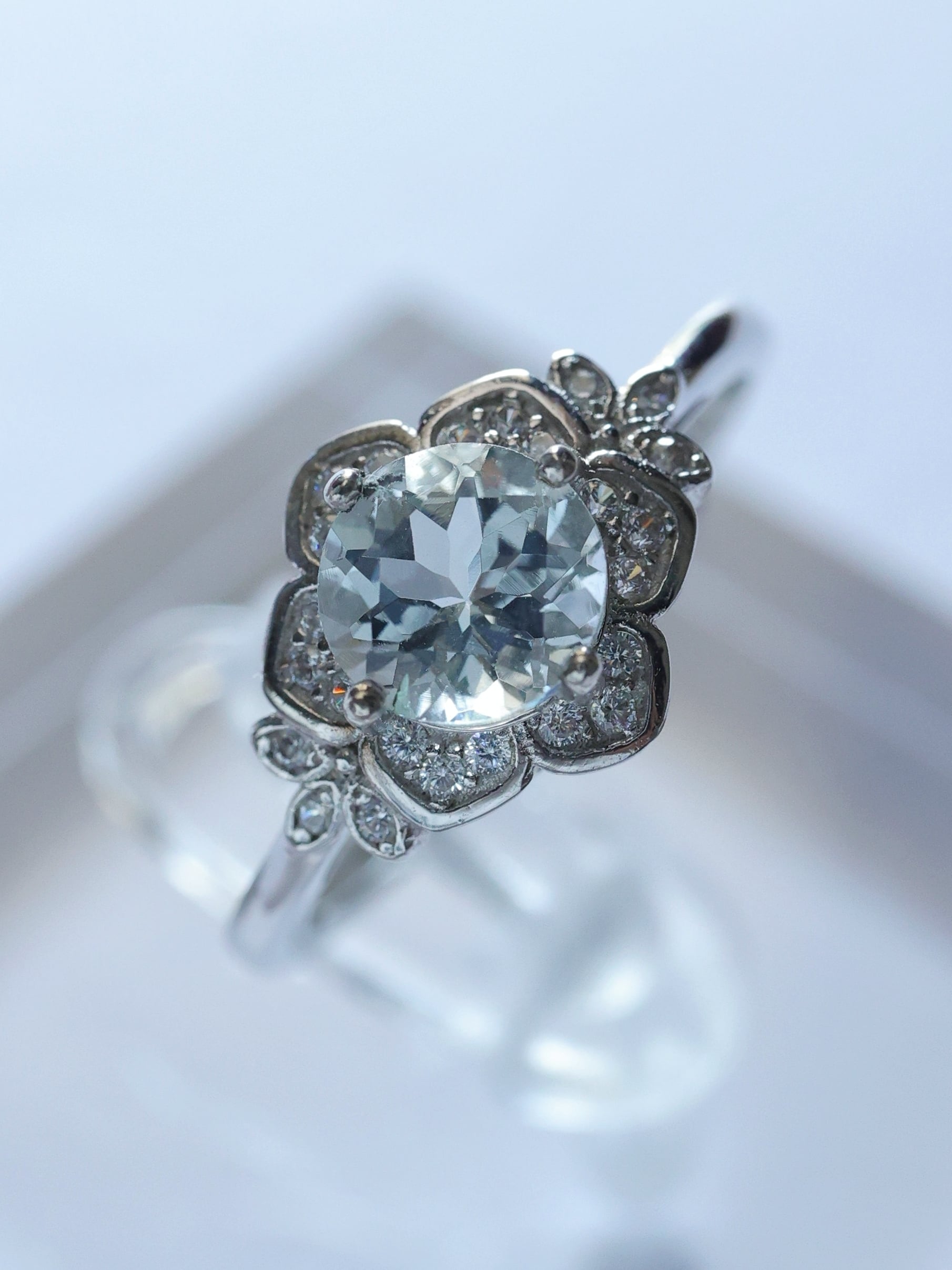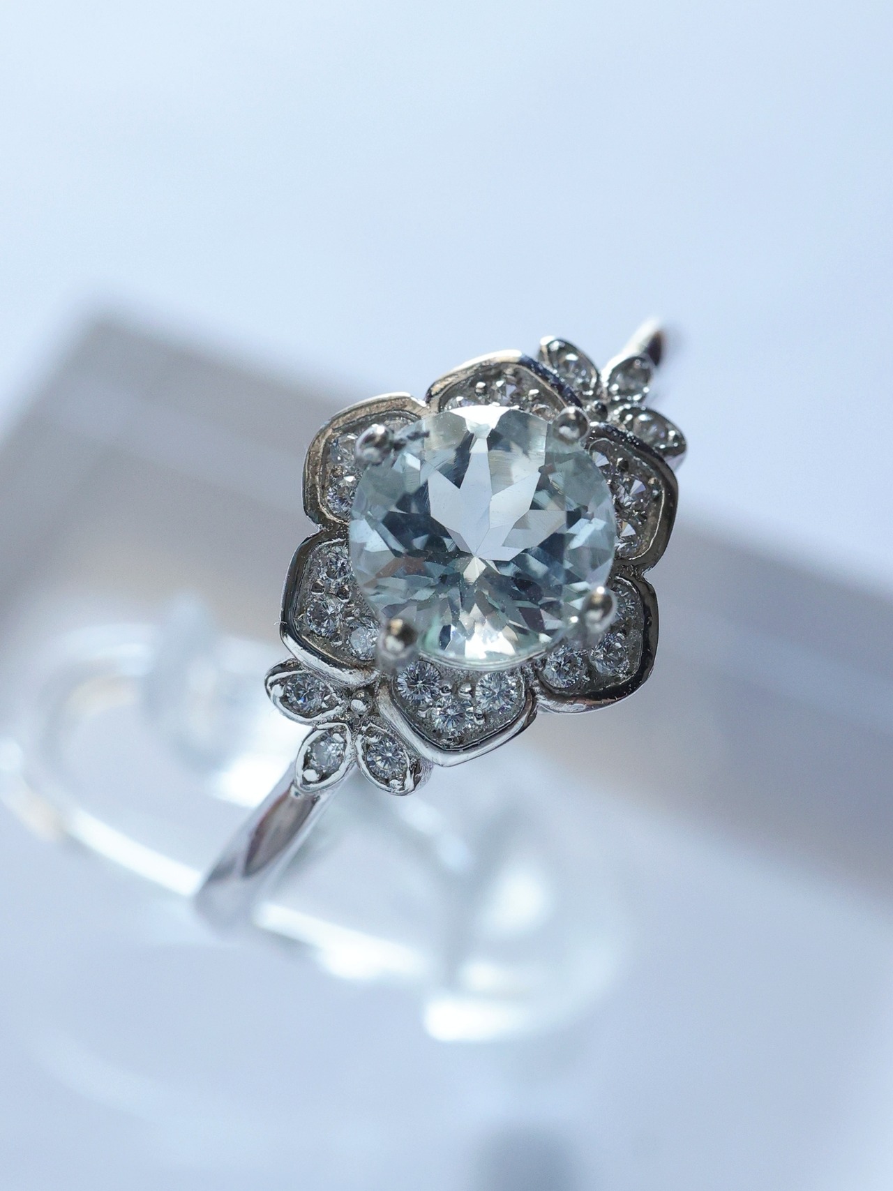 花びらのように広がる7Aランクのジルコニアが、瑞々しいアクアマリンの美しさを引き立て、透明感あふれる世界観を演出しています。