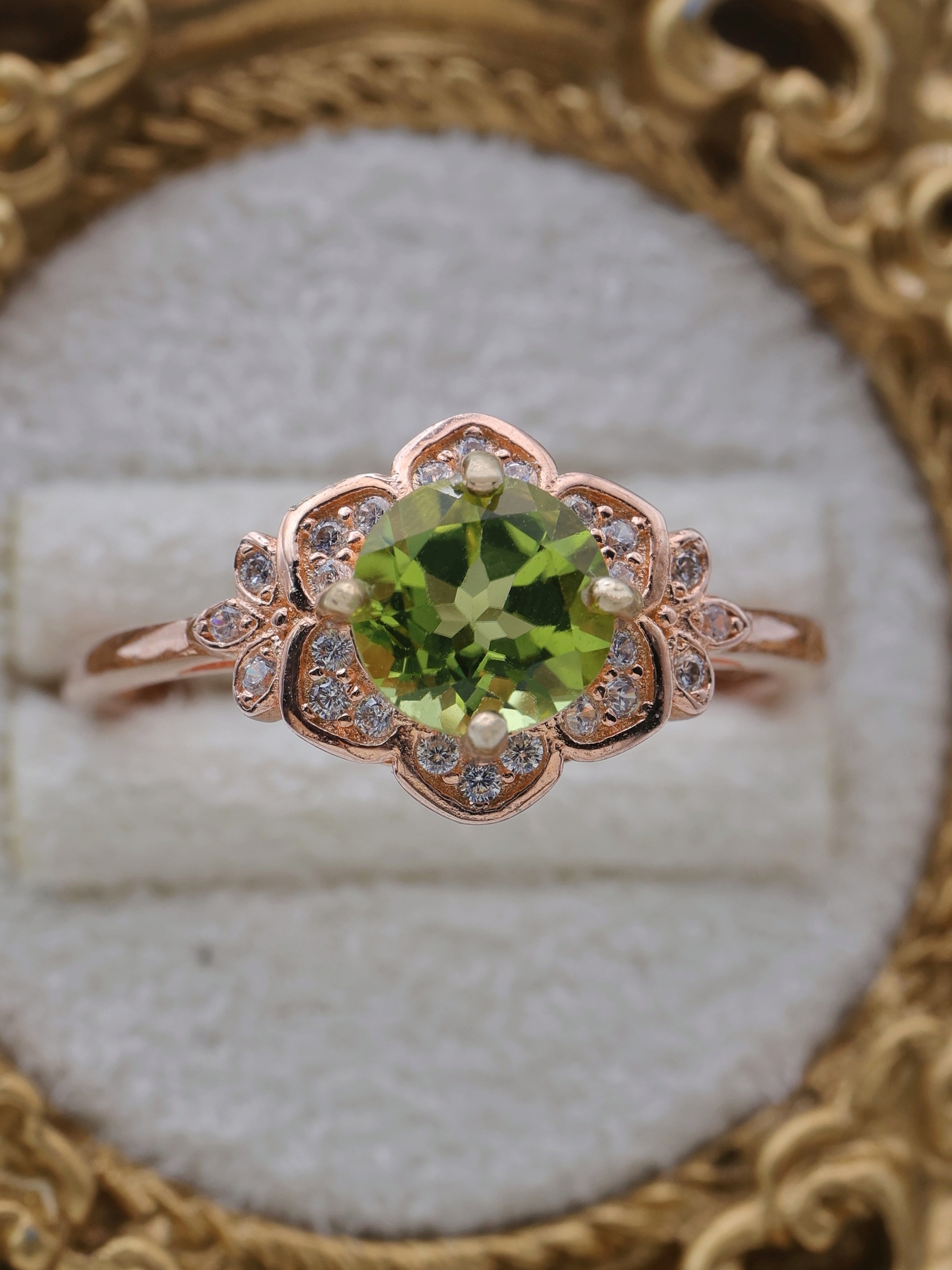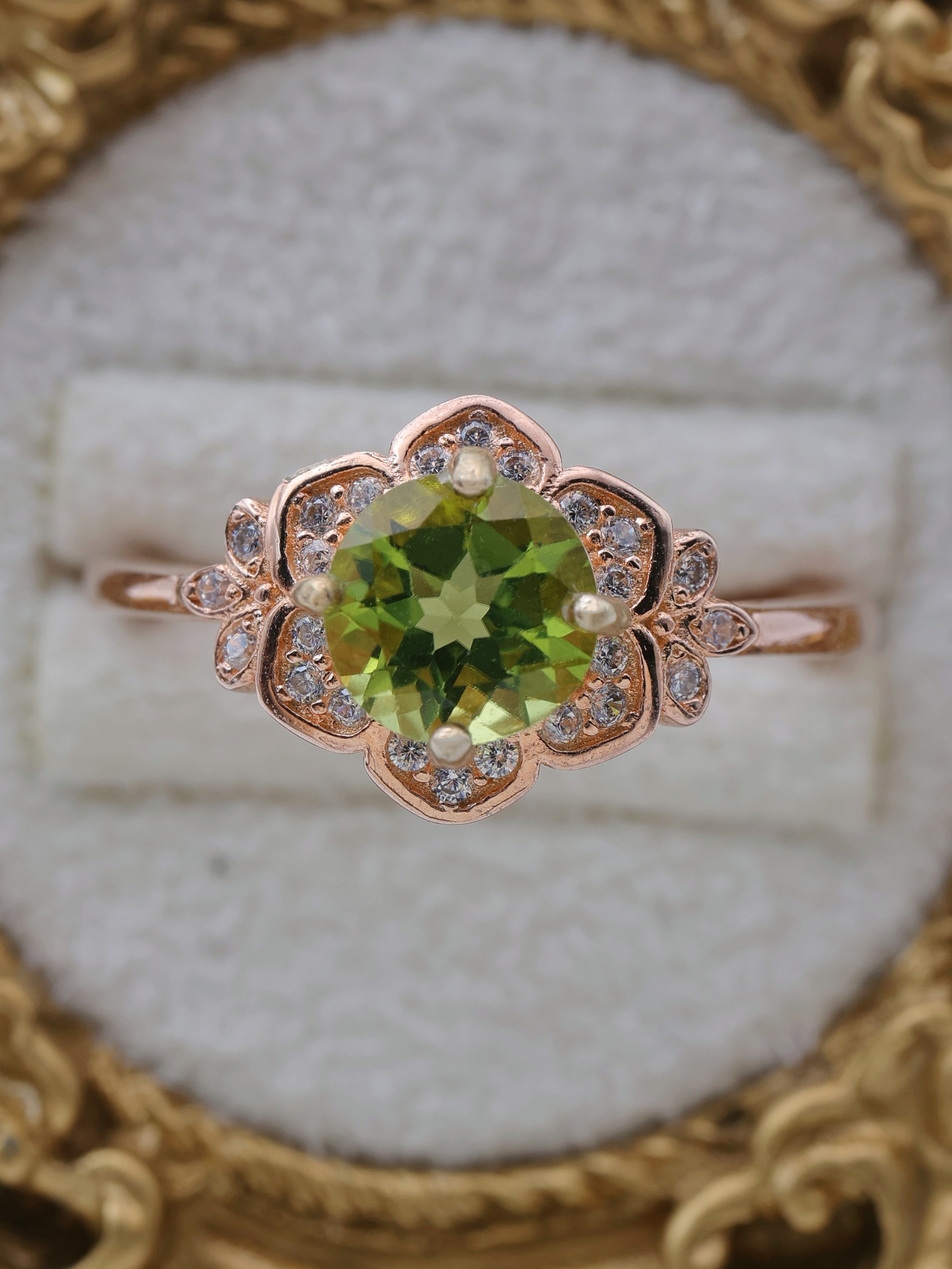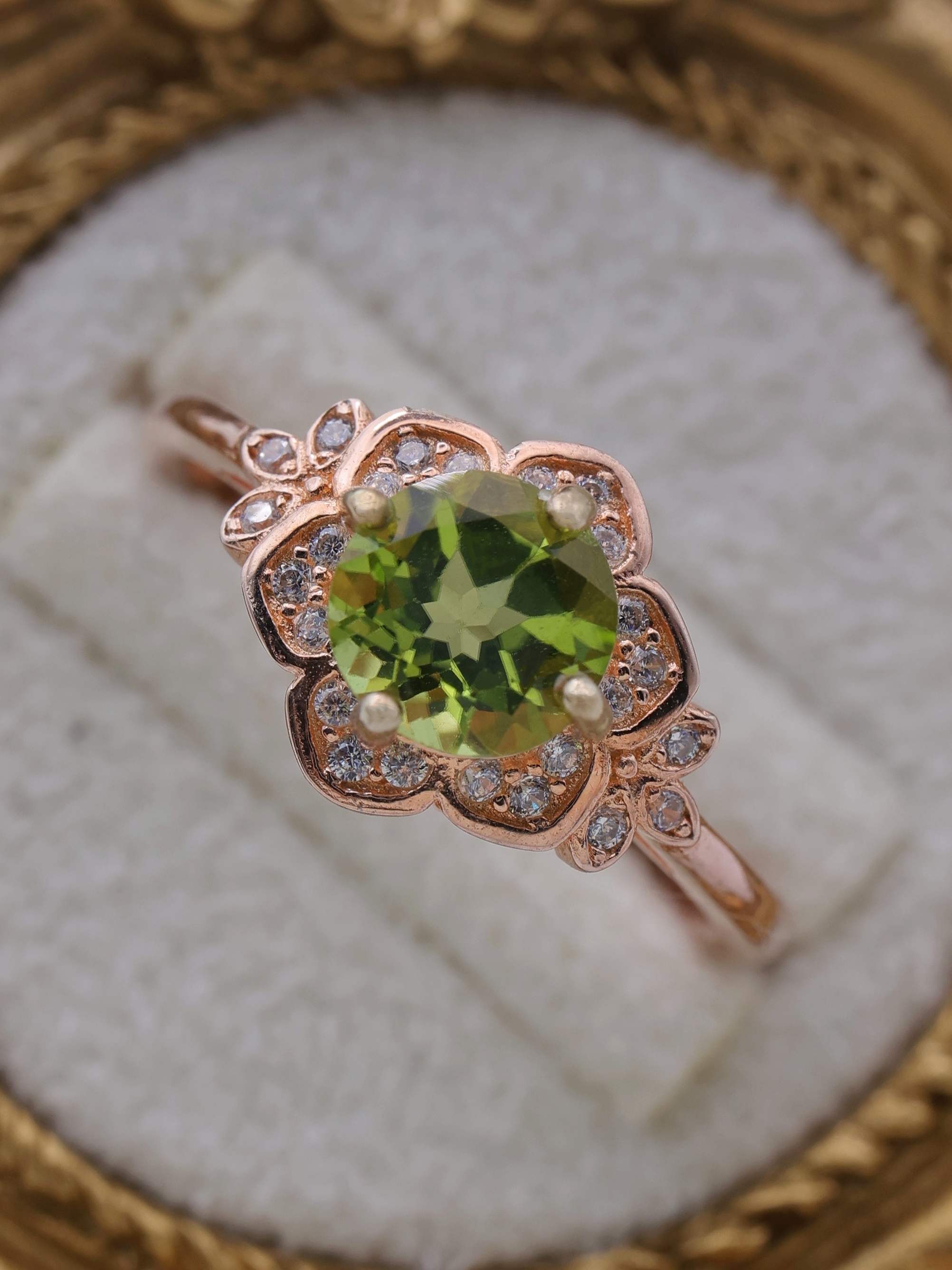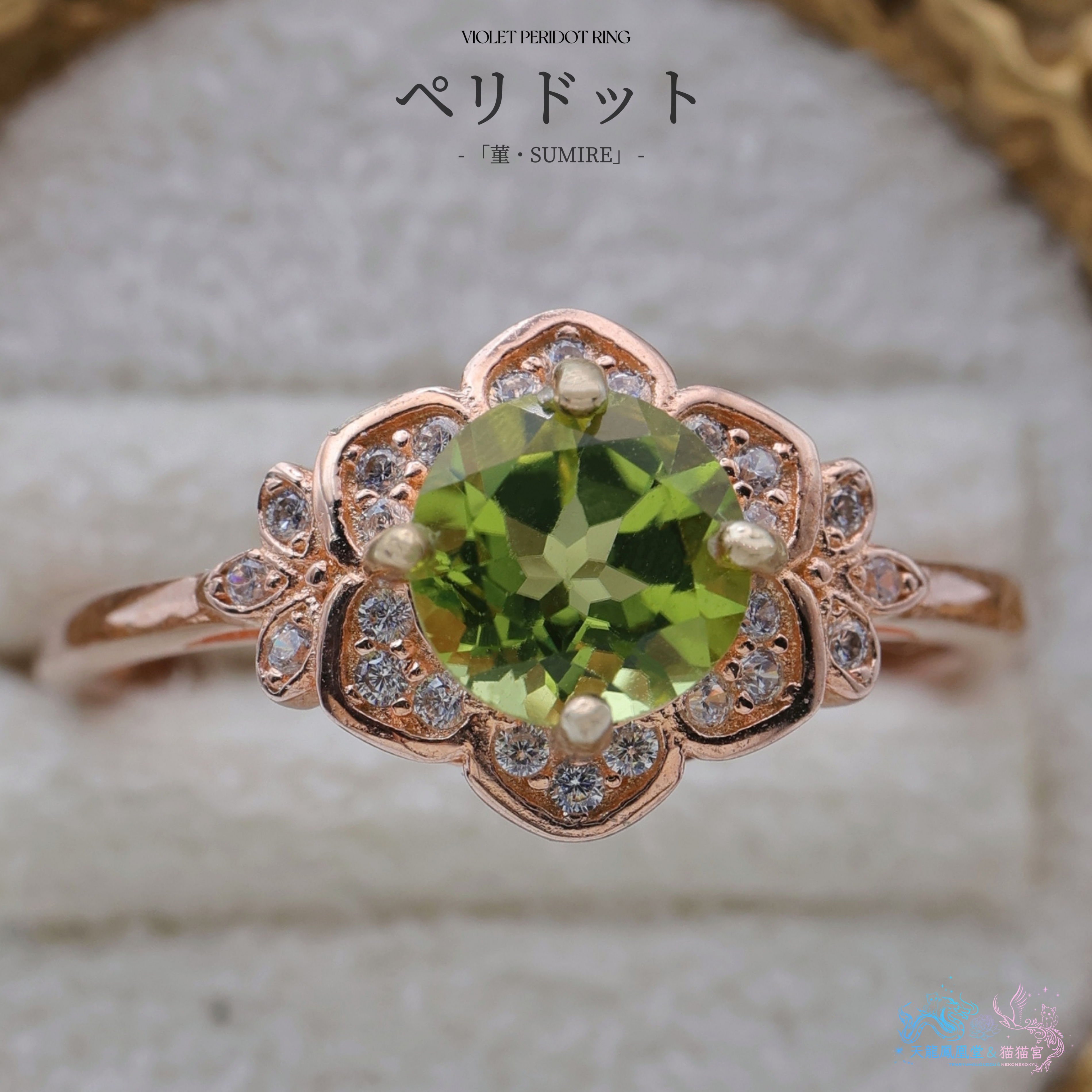 リングの素材にはSilver925にK18ピンクゴールドコーティングを施し、ペリドットのグリーンと調和する優雅な色合いに仕上げています。