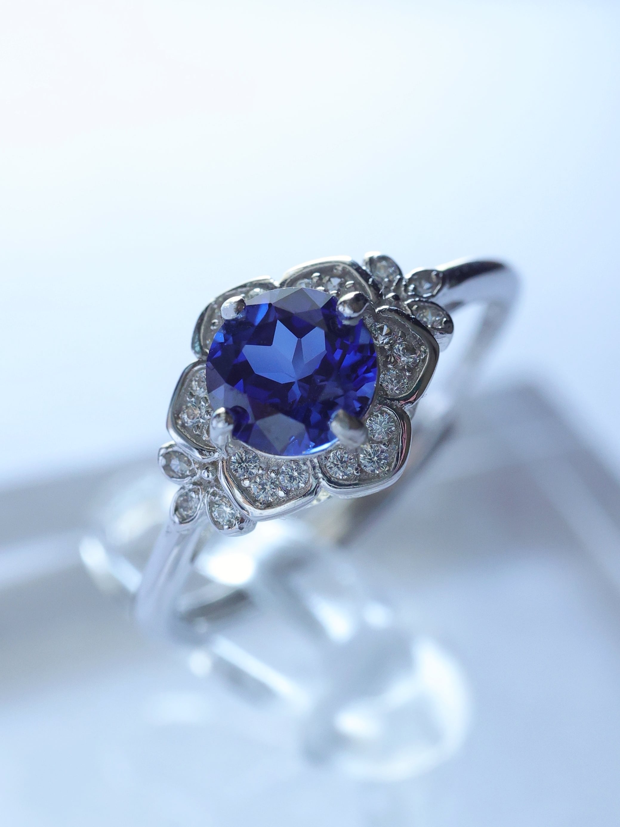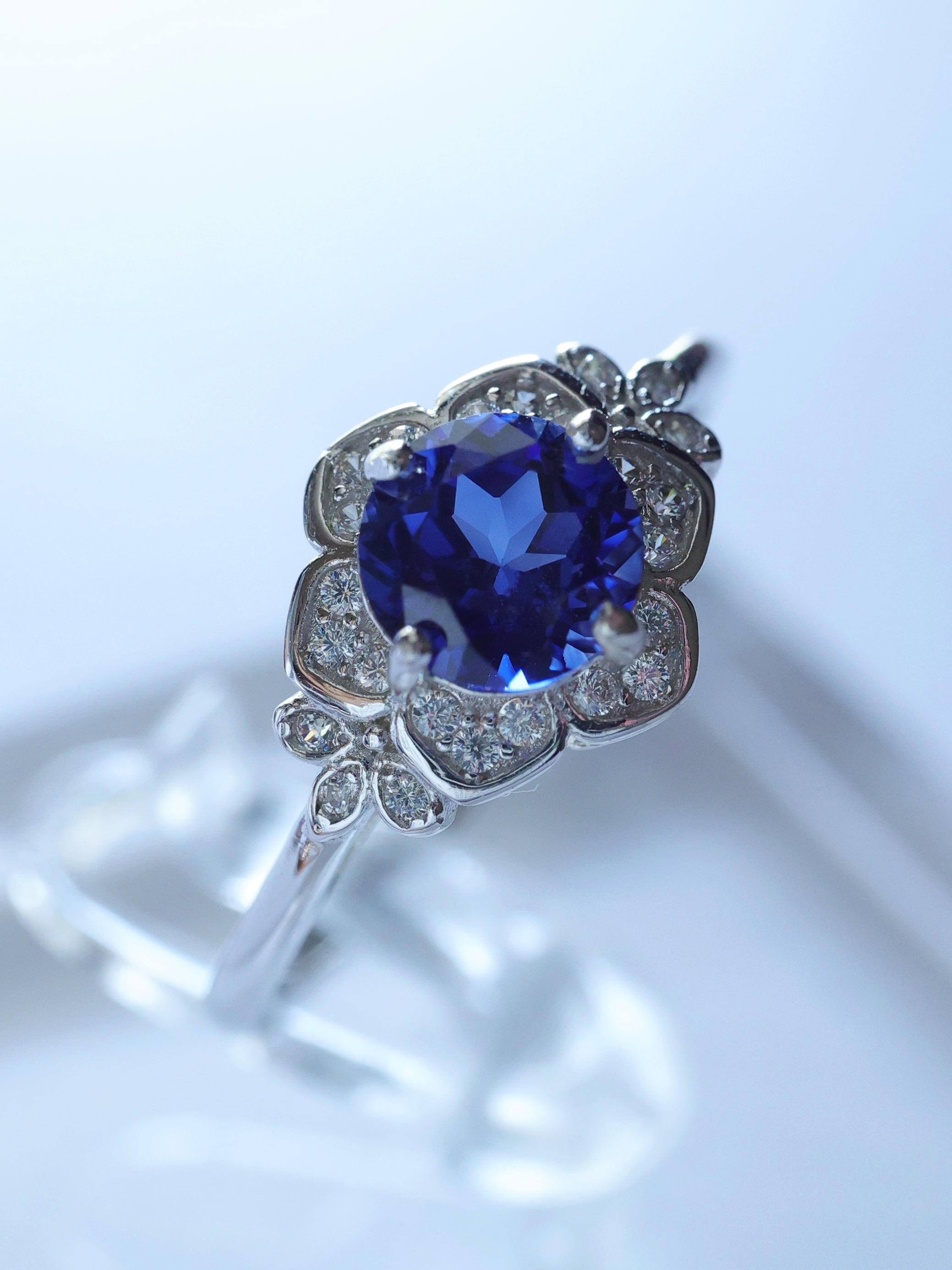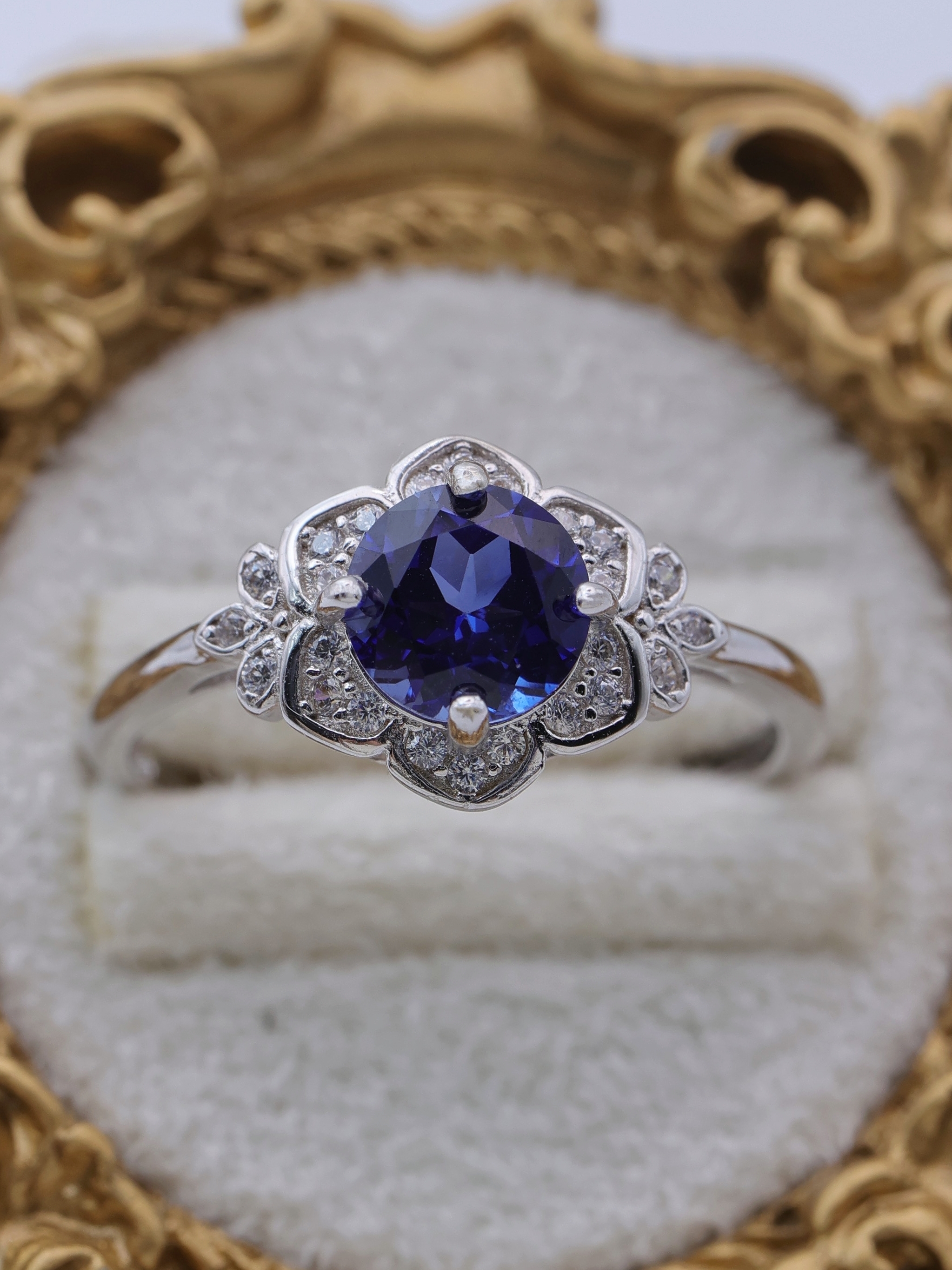 センターストーンのロイヤルブルーサファイアは、高品質のジルコニアが周囲を取り囲むことで、その美しさを引き立てています。光の当たる角度によって表情を変えるサファイアの深い色合いが、まるで星空のような華やかさを演出します。このエレガントなデザインは、特別な日にも日常使いにも、あなたのスタイルを一層引き立ててくれることでしょう。