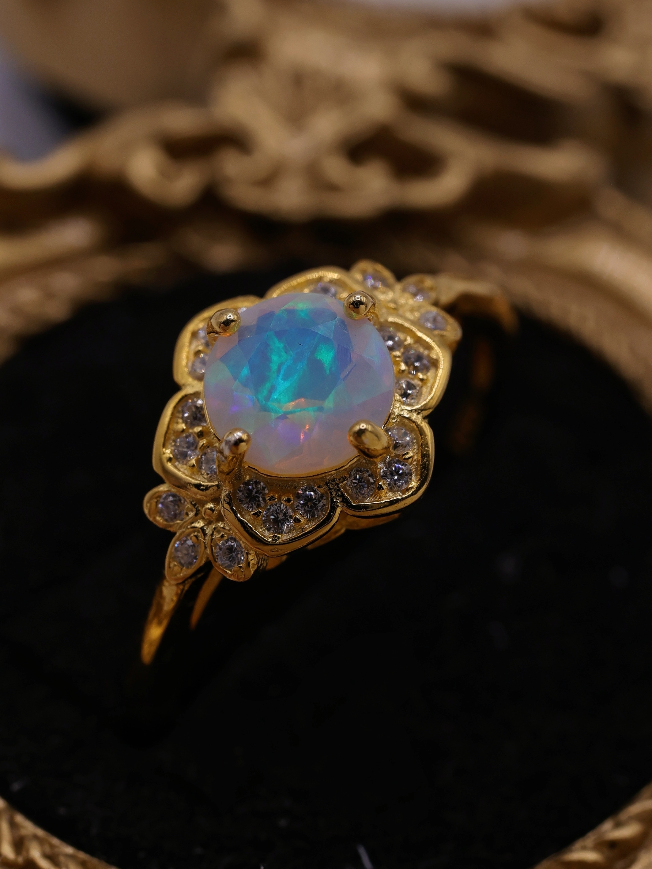 幻想的なブルーの輝きが指元に咲く、エチオピア産オパールのリング。光を受けるたび、オパール特有の遊色効果(プレイ・オブ・カラー)が鮮やかに浮かび上がり、まるで星の瞬きやオーロラのような幻想的な光を放ちます。