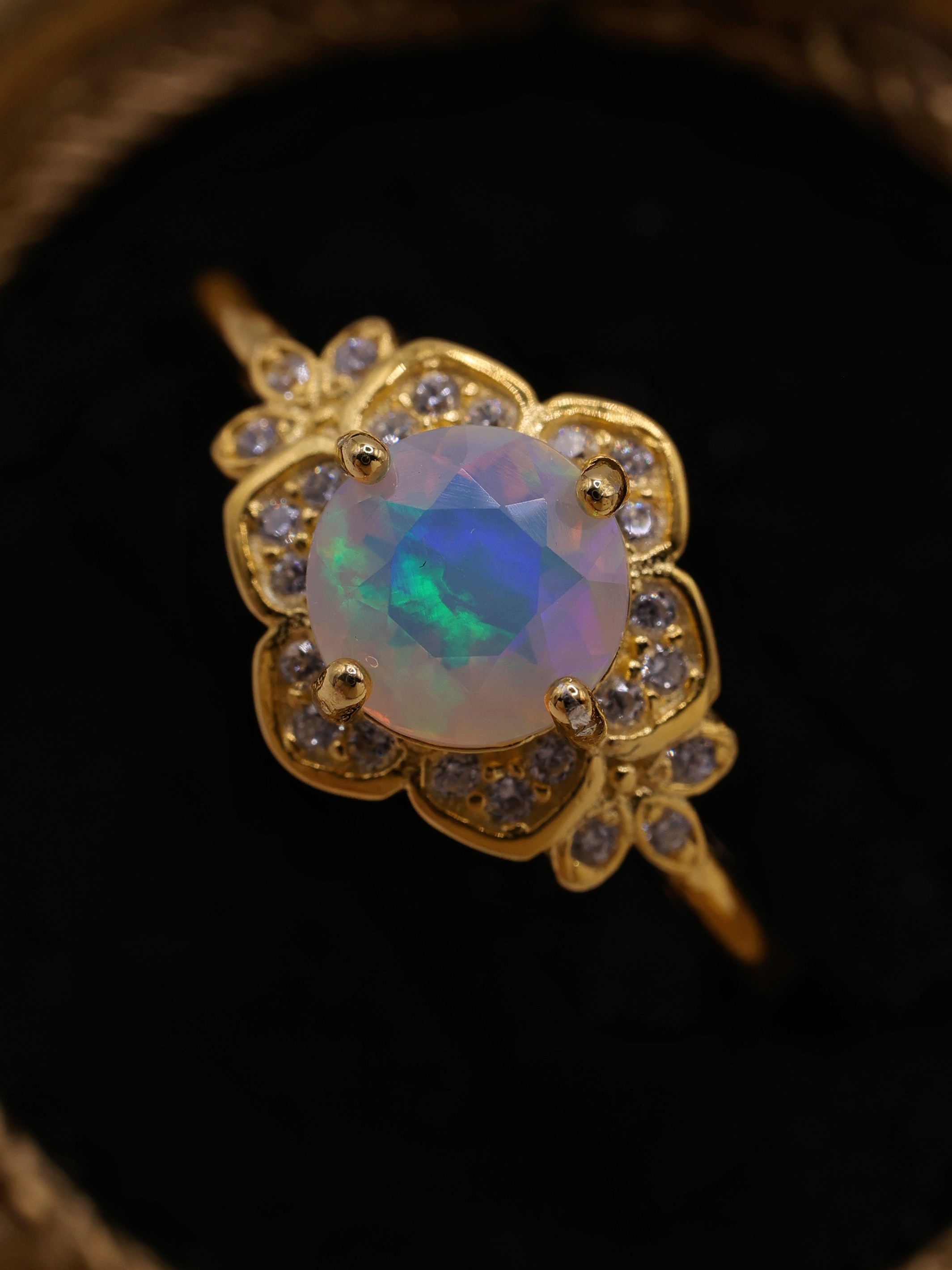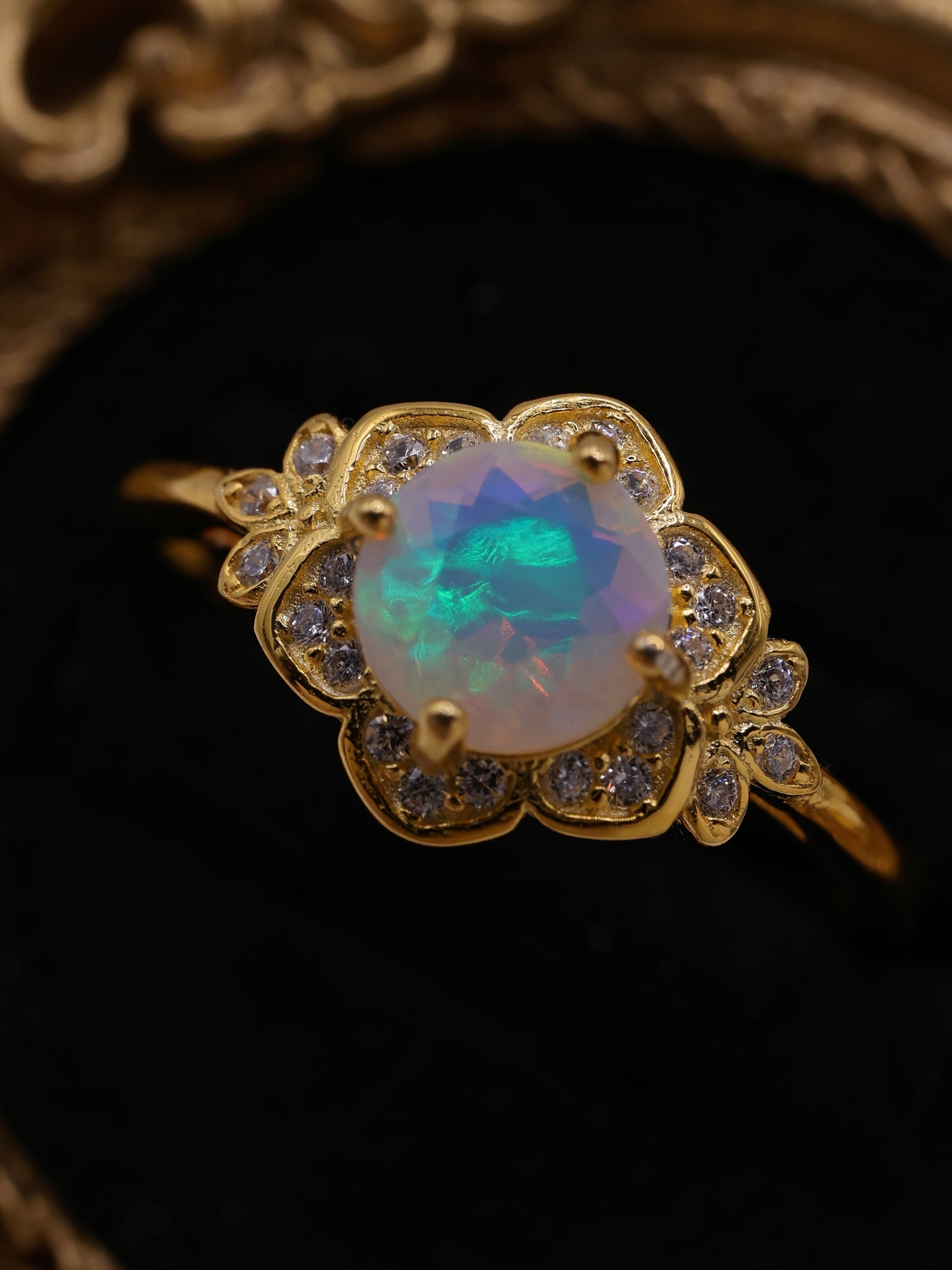 オパールを包むようにデザインされた花びらモチーフには、7Aジルコニアをセッティング。繊細な煌めきが、オパールの幻想的な光を一層引き立て、優雅で洗練された印象を与えます。