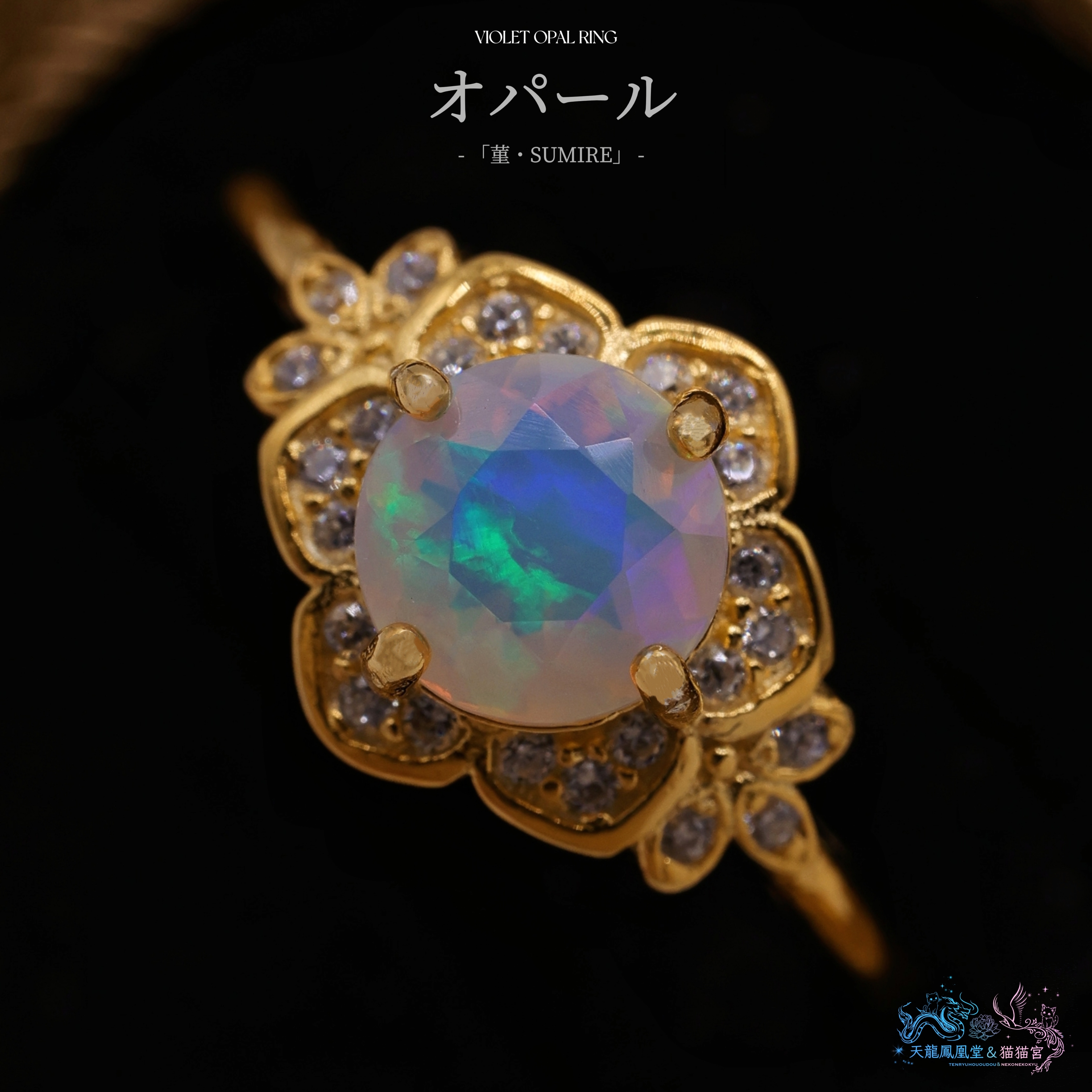 まるで月夜に咲くスミレのように、静かに、そして華やかに輝く一輪。特別に選ばれた“天ノ川”のようなオパールが指元で広がる神秘の光を、ぜひお楽しみください。