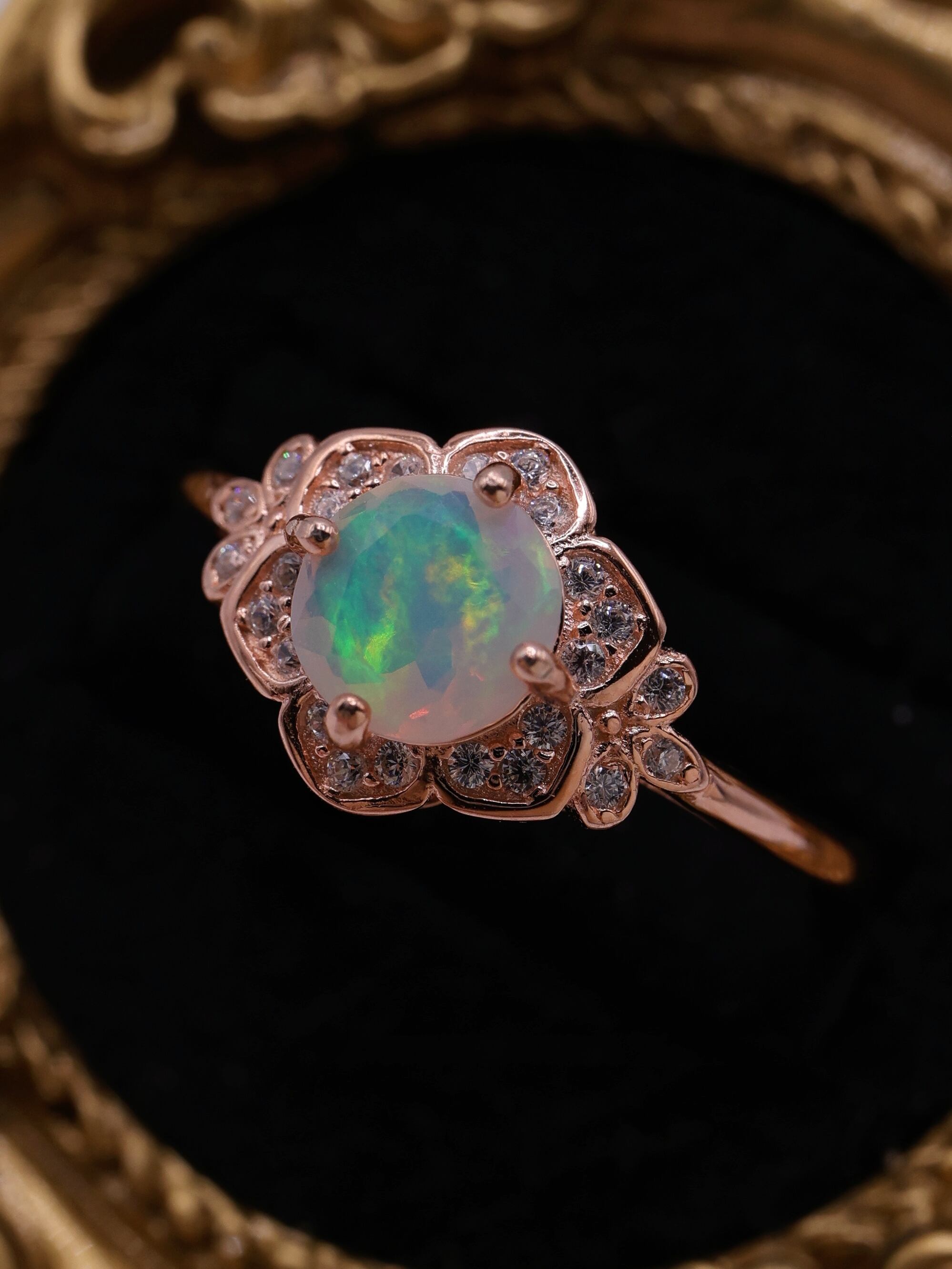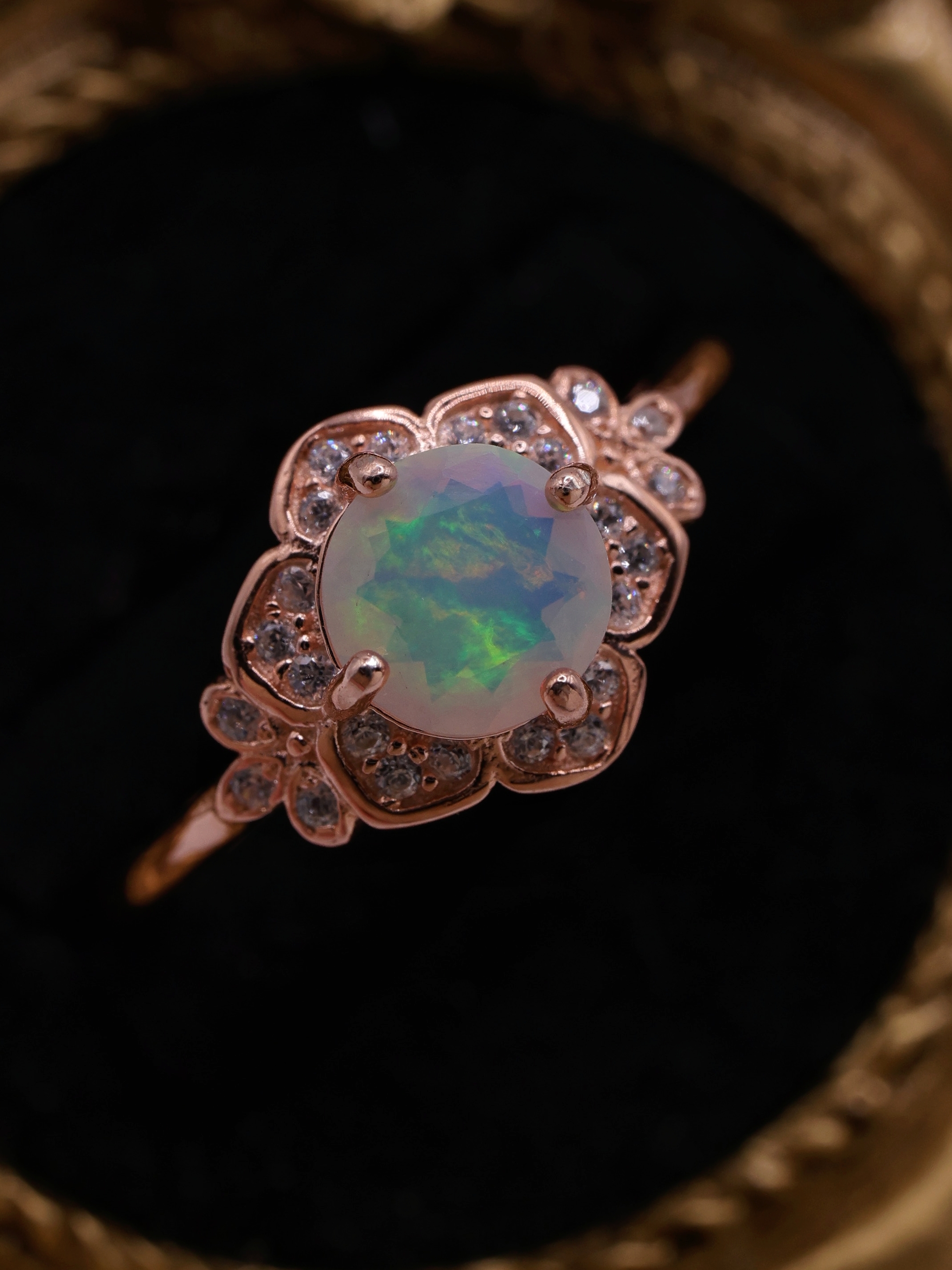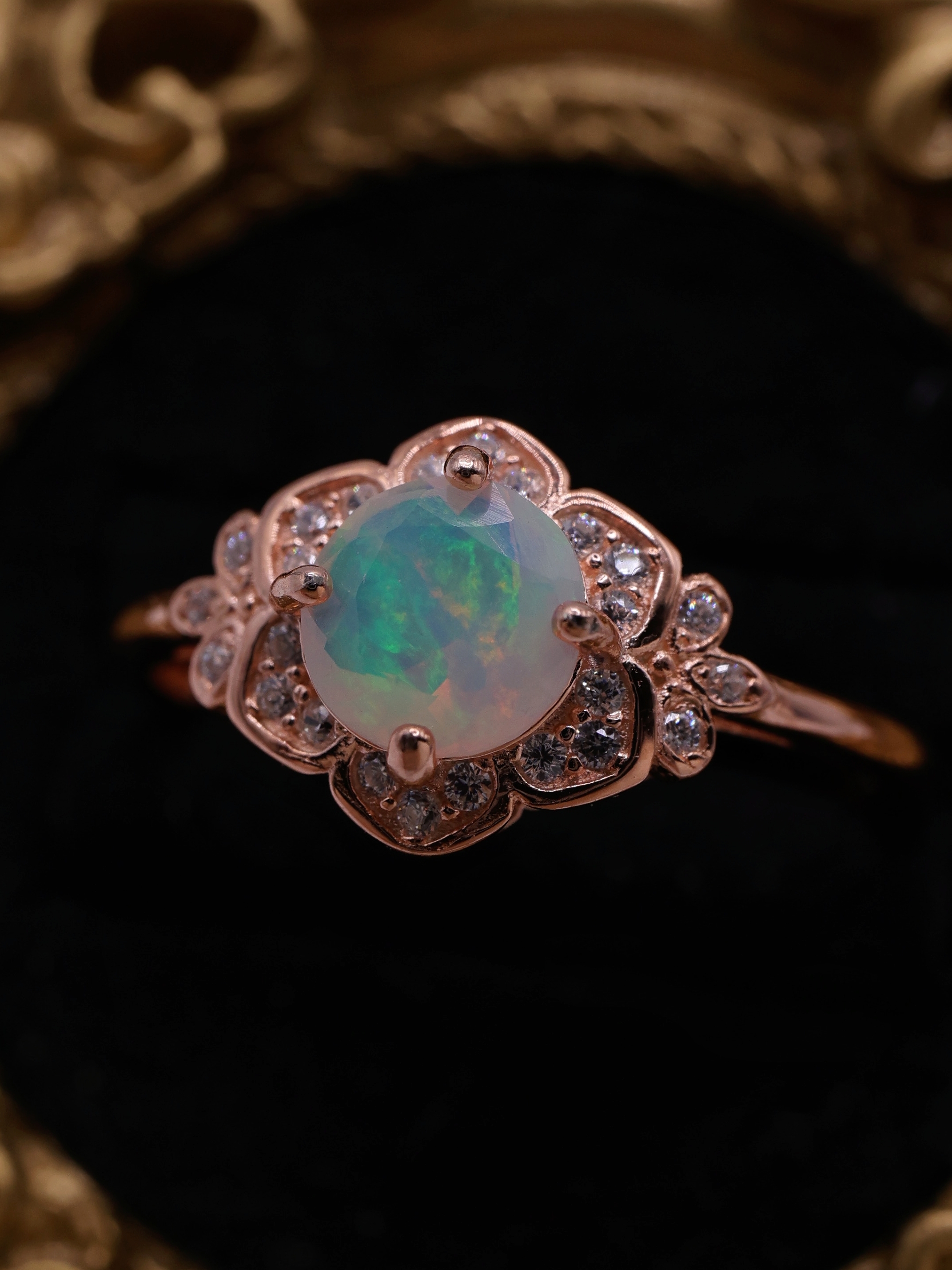 オパールを包むようにデザインされた花びらモチーフには、7Aジルコニアをセッティング。繊細な煌めきが、オパールの幻想的な光を一層引き立て、優雅で洗練された印象を与えます。