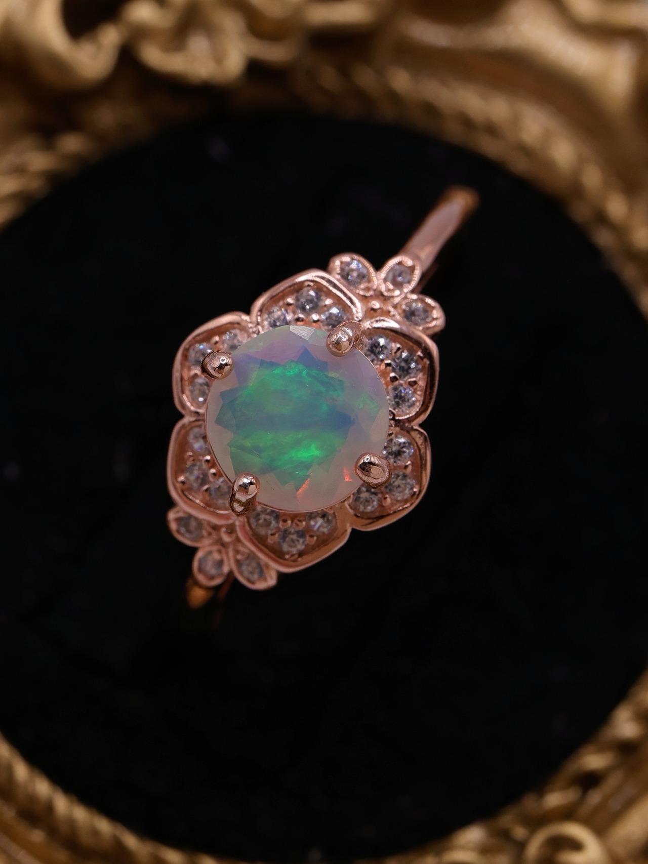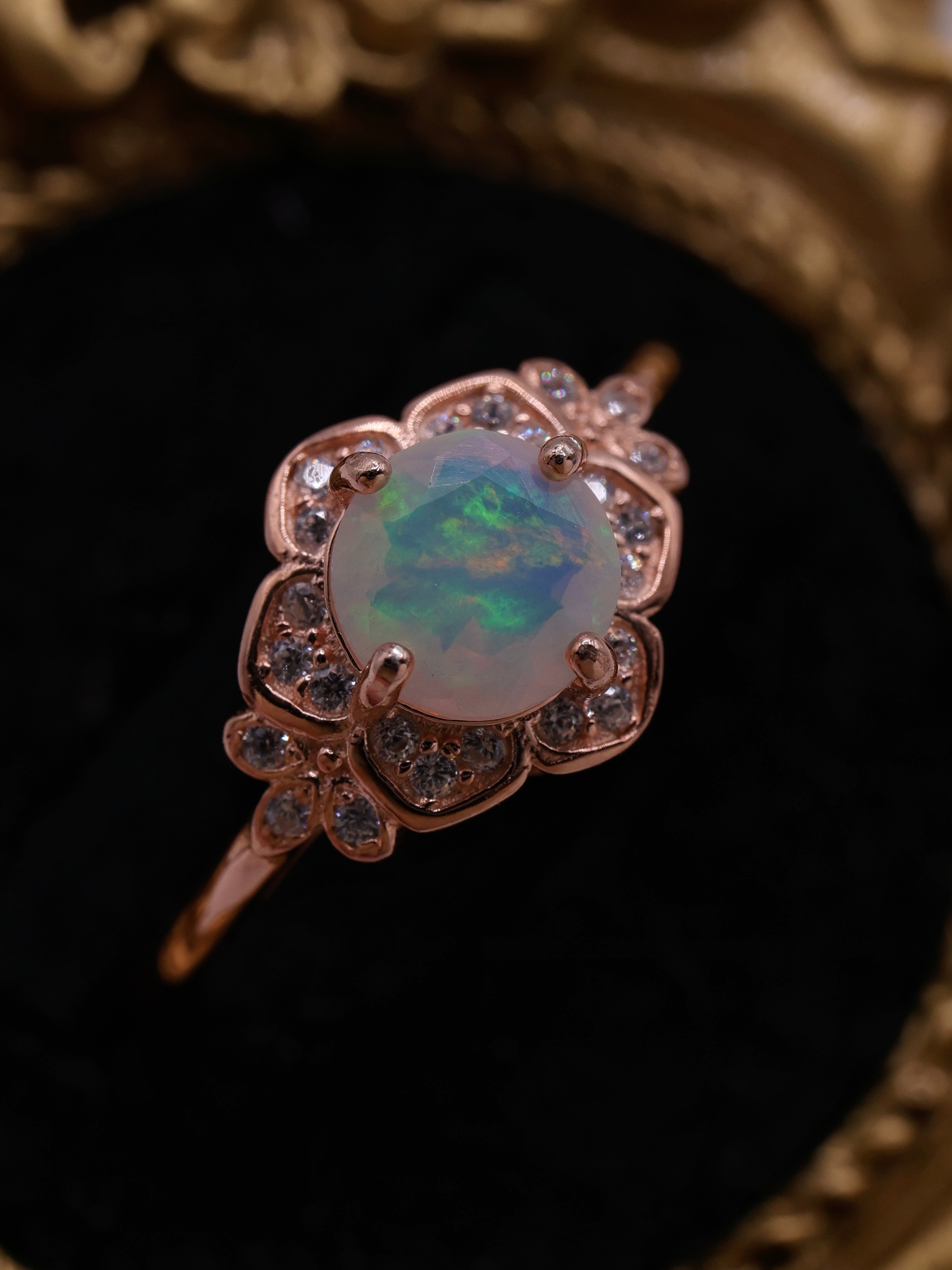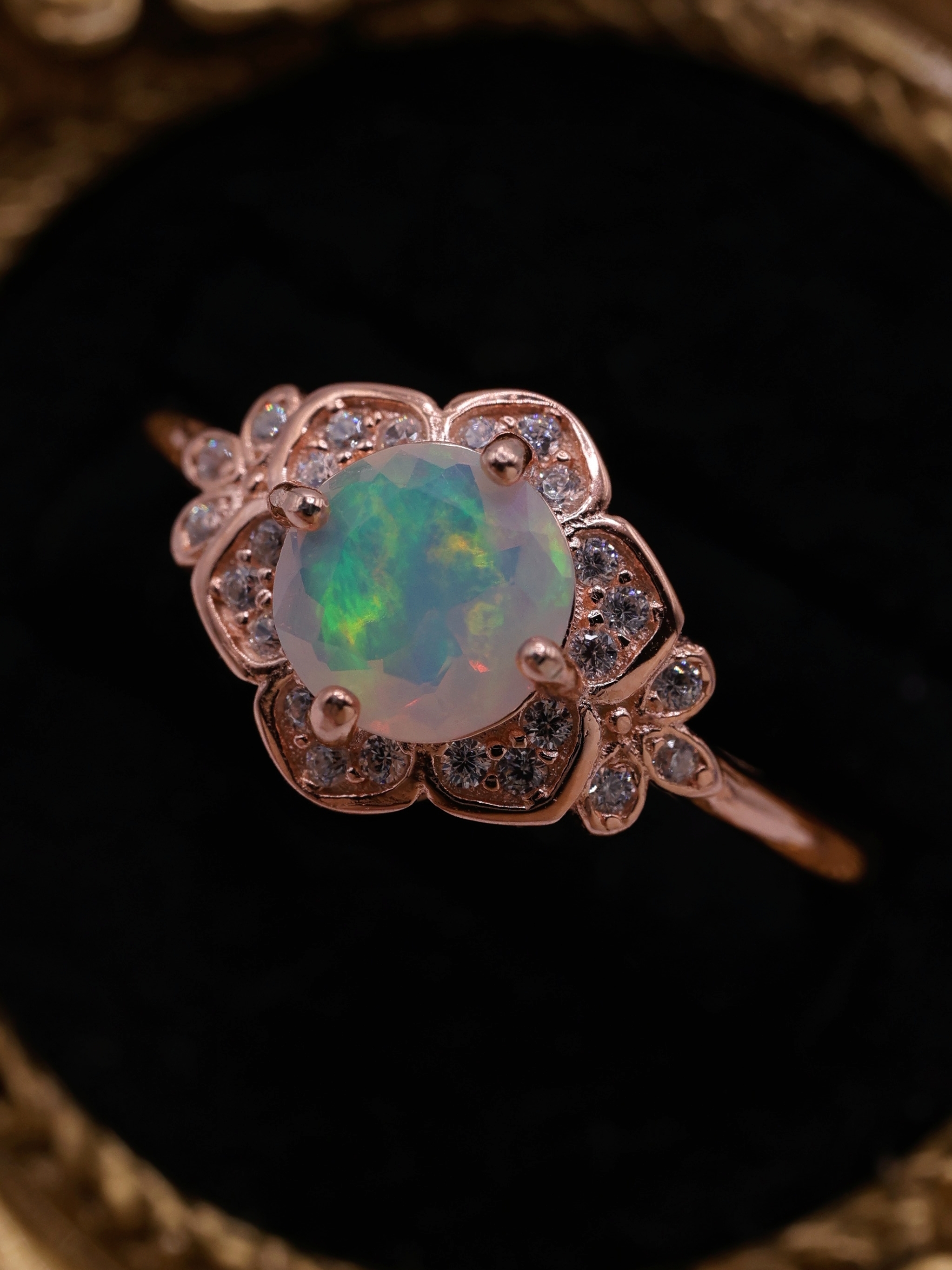 オパールを包むようにデザインされた花びらモチーフには、7Aジルコニアをセッティング。繊細な煌めきが、オパールの幻想的な光を一層引き立て、優雅で洗練された印象を与えます。