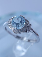 澄みきった空を思わせる透明感と輝きを放つスカイブルートパーズを主役にしたリング。