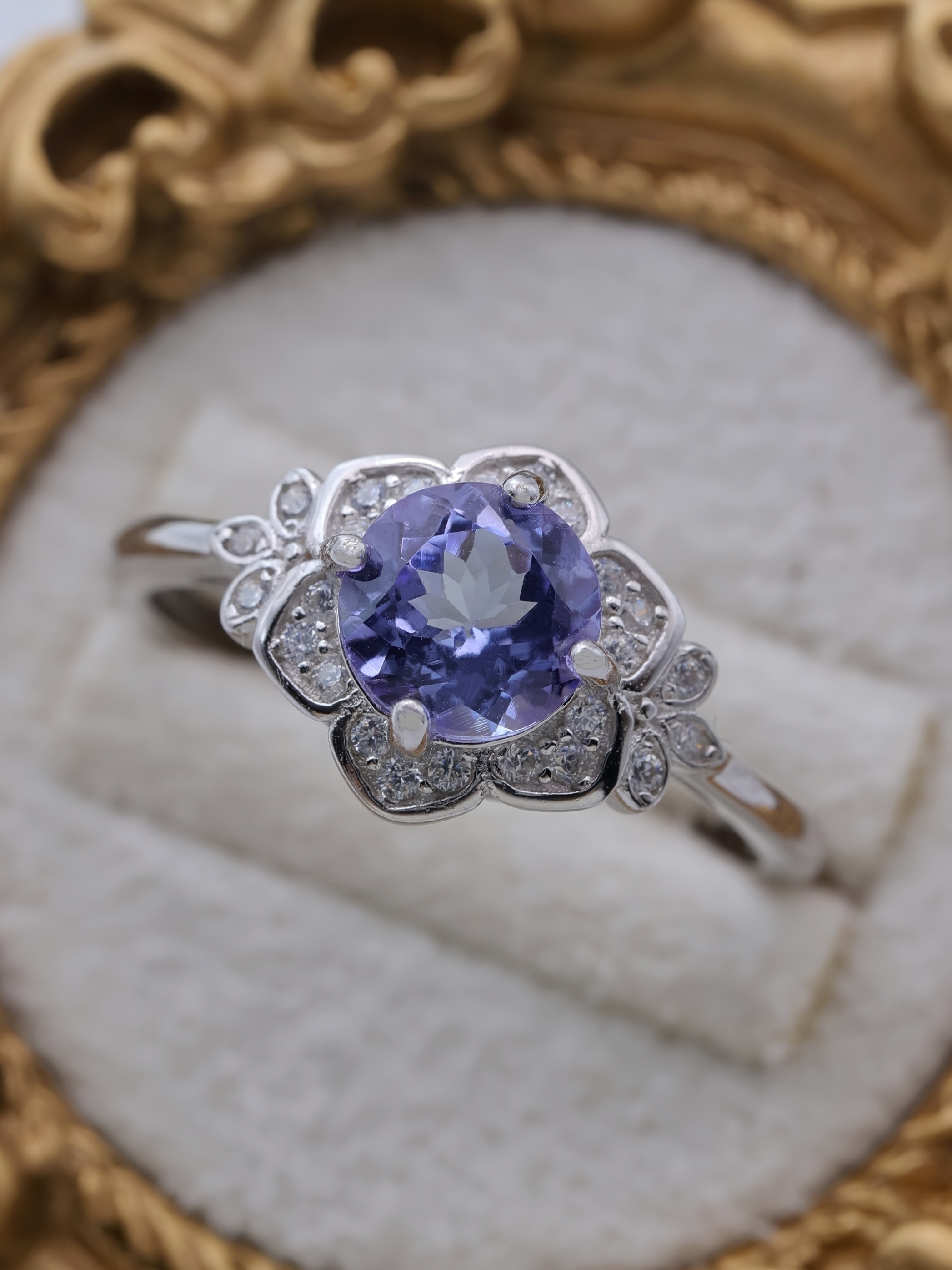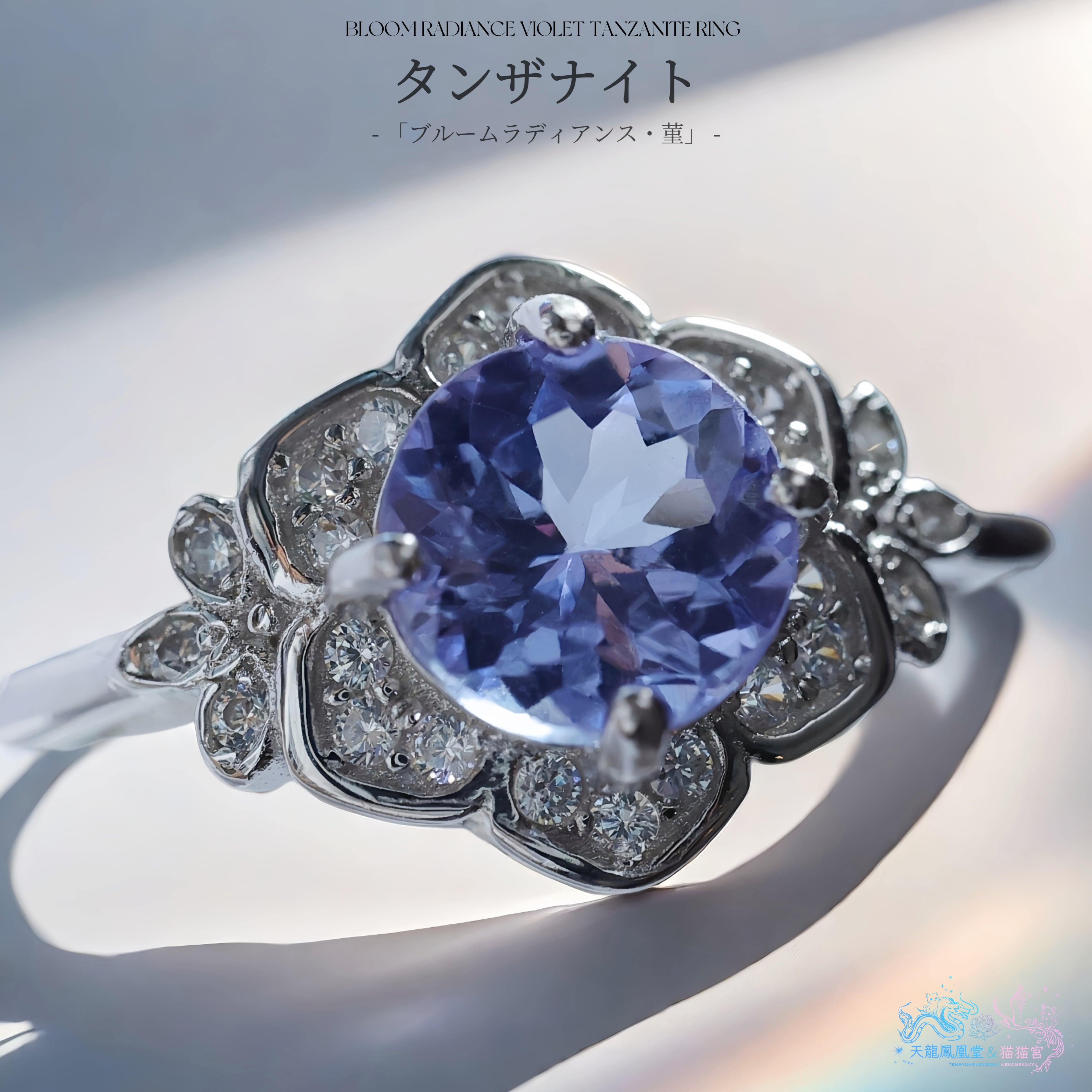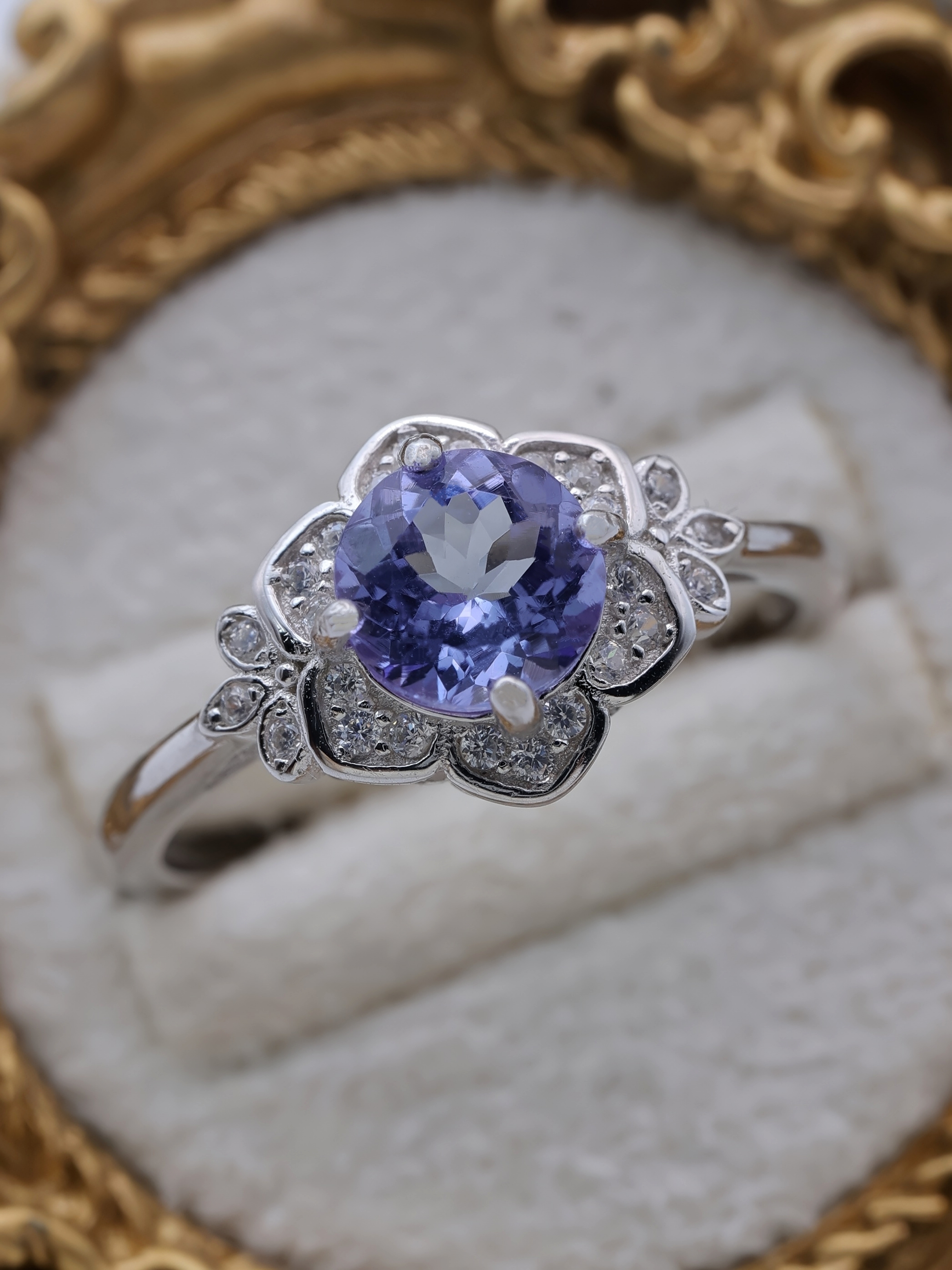リングの枠にはシルバー925を使用し、ロジウムメッキを施して高級感をプラス。中央のタンザナイトを囲むようにあしらわれた高品質のジルコニアが、花びらのように柔らかく輝きを添え、デザイン全体にエレガントさを引き立てています。