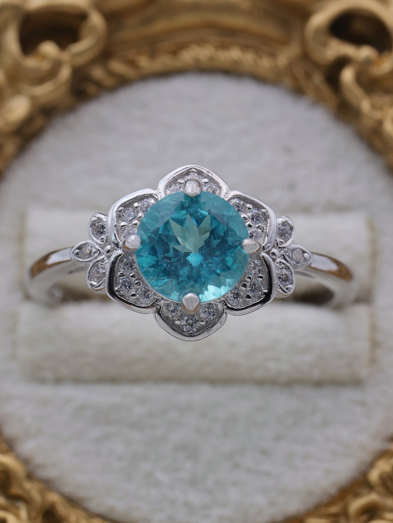 アパタイト特有の高い透明感と強い光沢が生み出す輝きは、まるで水面に差し込む太陽の光が踊るよう。角度を変えるたび、ブルーの中にわずかにグリーンを帯びた光が溶け合い、パライバトルマリンを思わせる神秘的な色彩を放ちます。