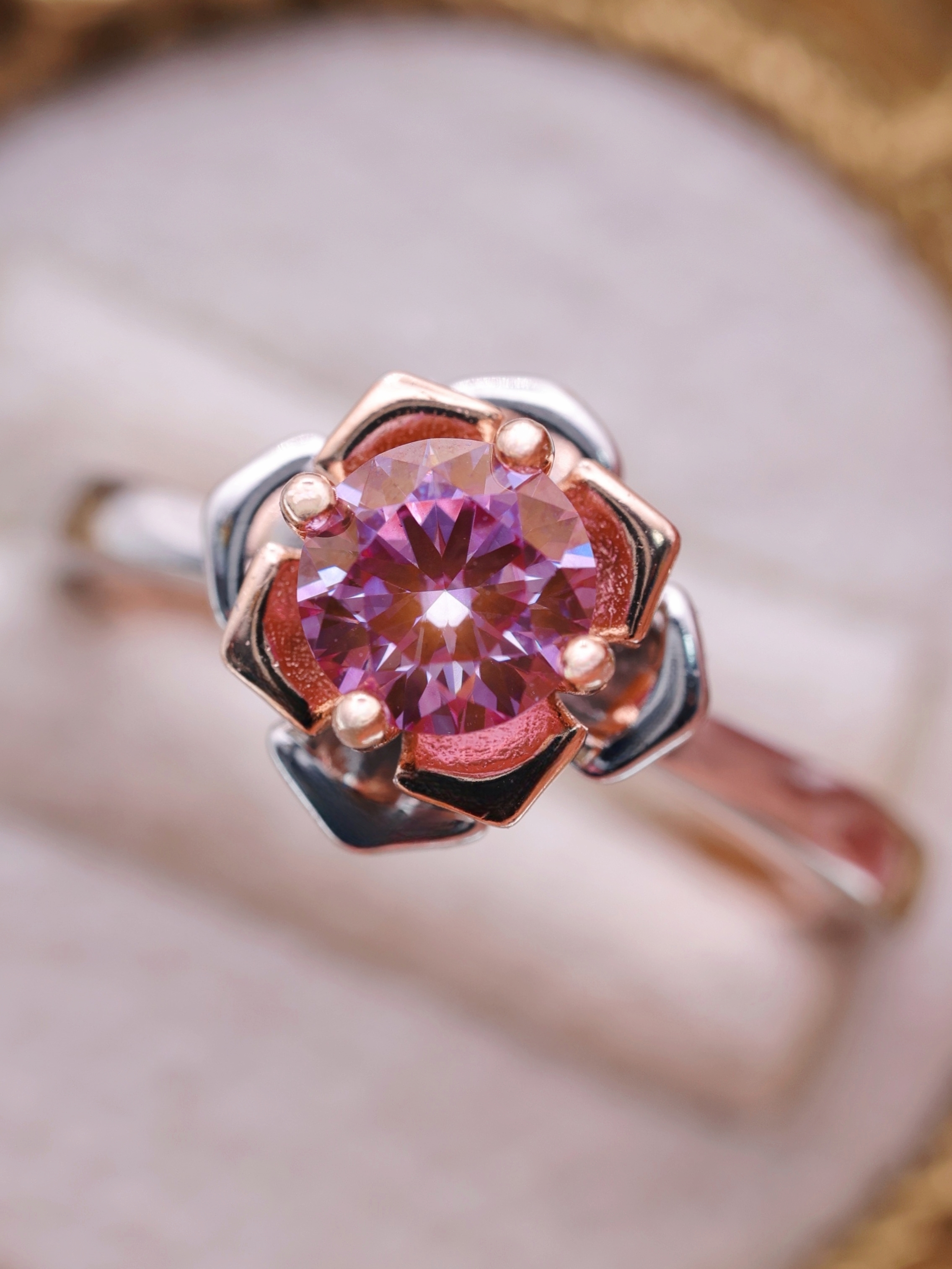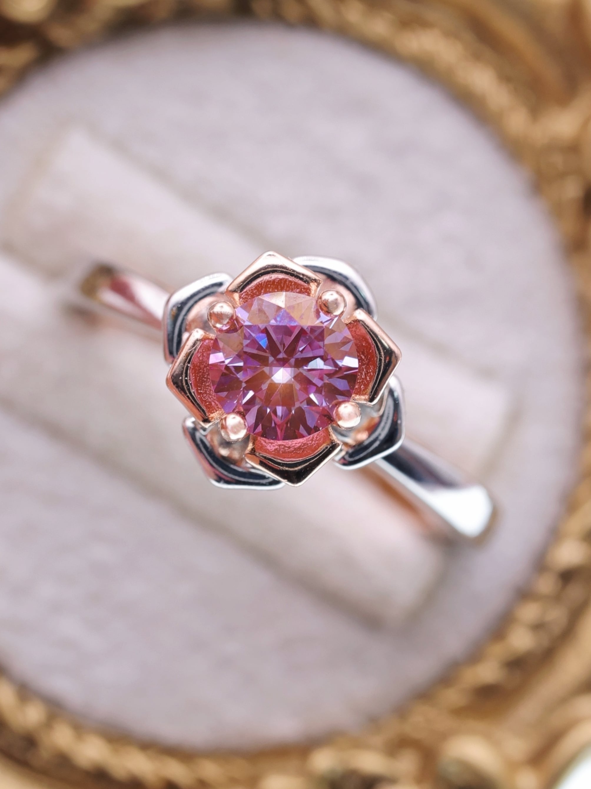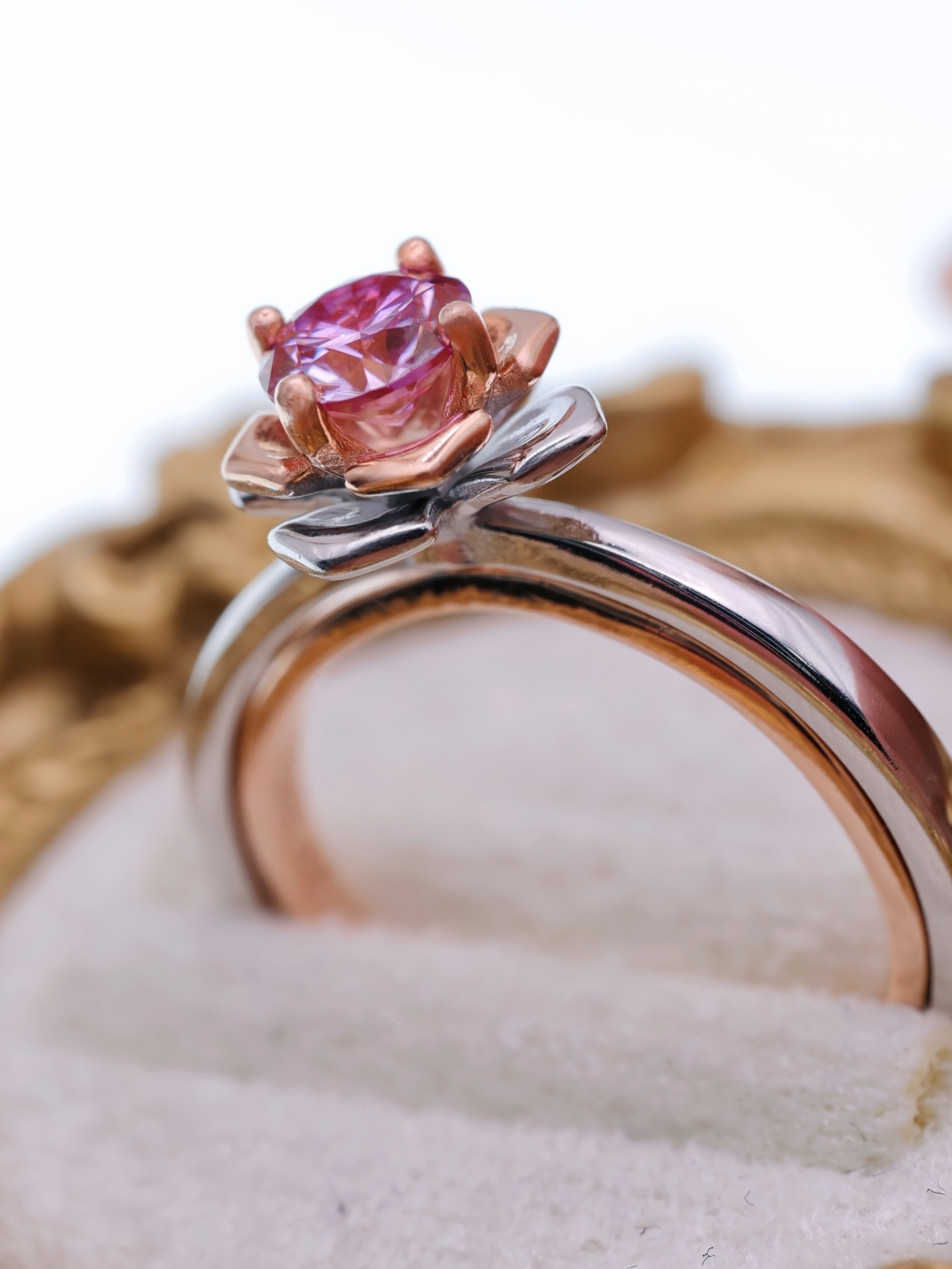 中央には、一輪の薔薇を象ったピンクパープルカラー・VVSクラスの高品質モアサナイトをセッティング。