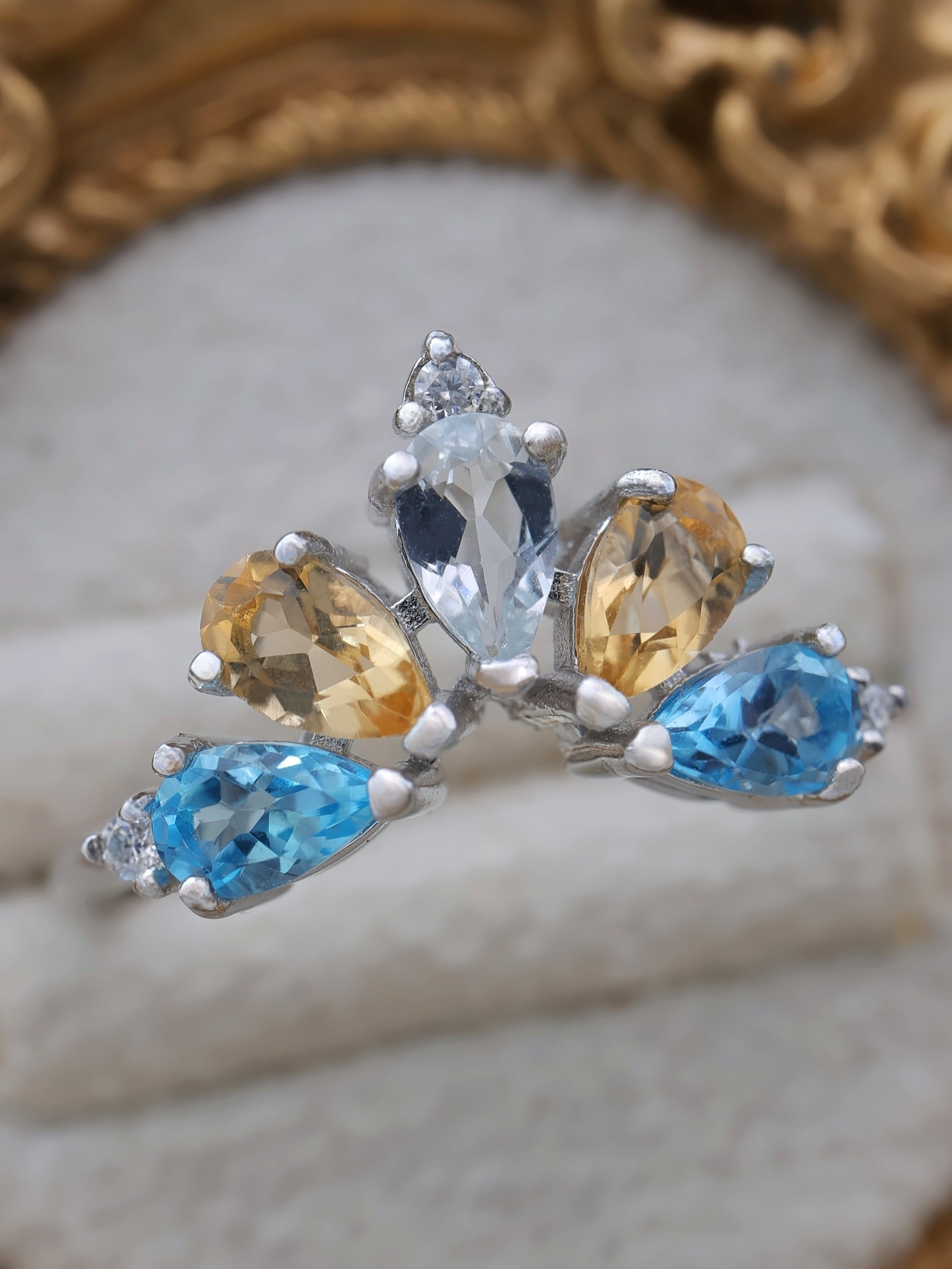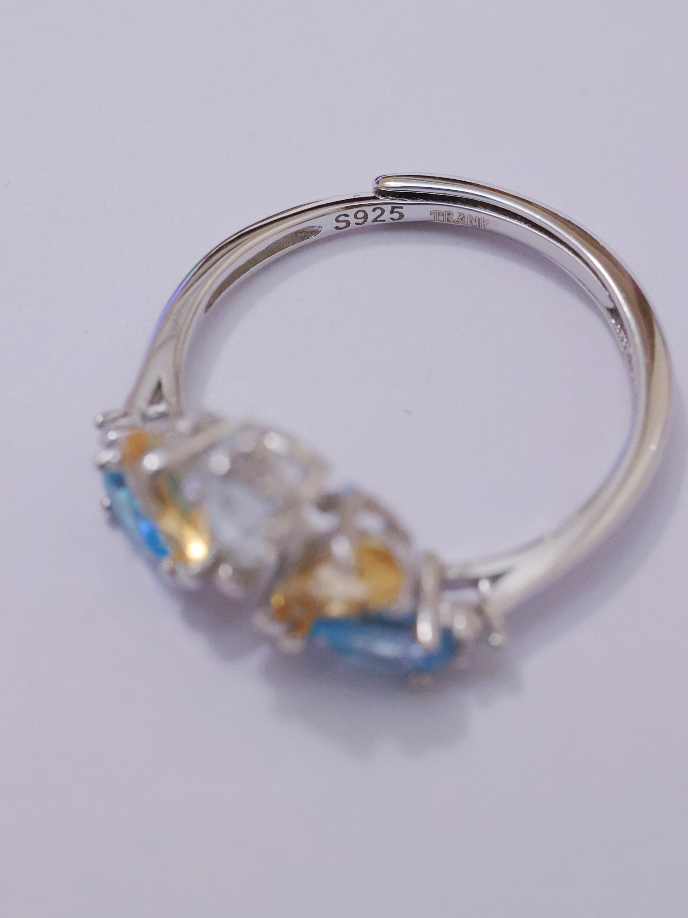 中央には透明感あふれるアクアマリン、そこから流れるように配置されたスイスブルートパーズとシトリンが、光のグラデーションを描くように繊細に輝き、まるで三色の花冠が咲き誇るような美しさです。