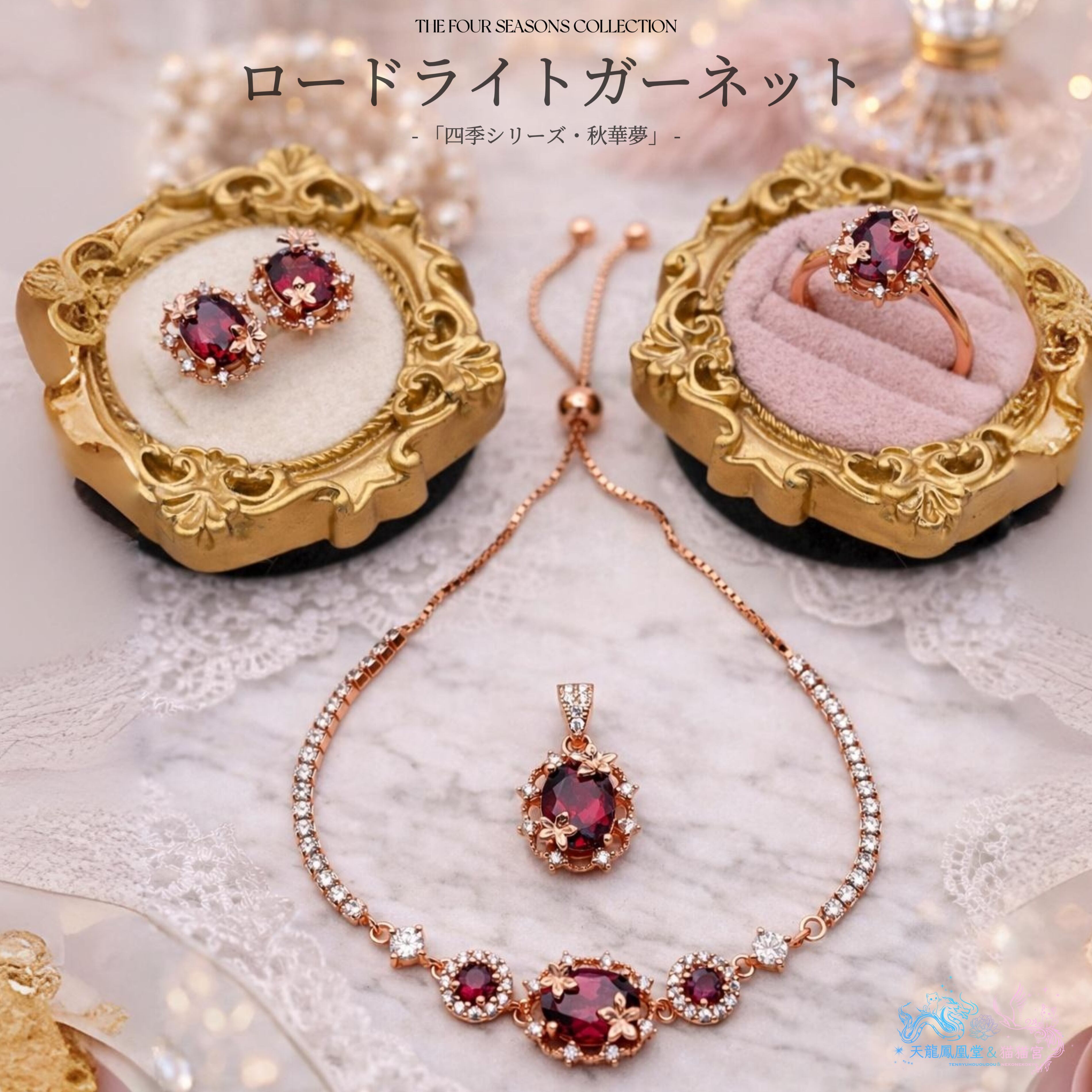 ロードライトガーネットが放つ深紅とピンクの間を揺らぐような艶やかな色彩を、可憐な小花とレースのような繊細な装飾で包み込んだ、華やかなシリーズです。