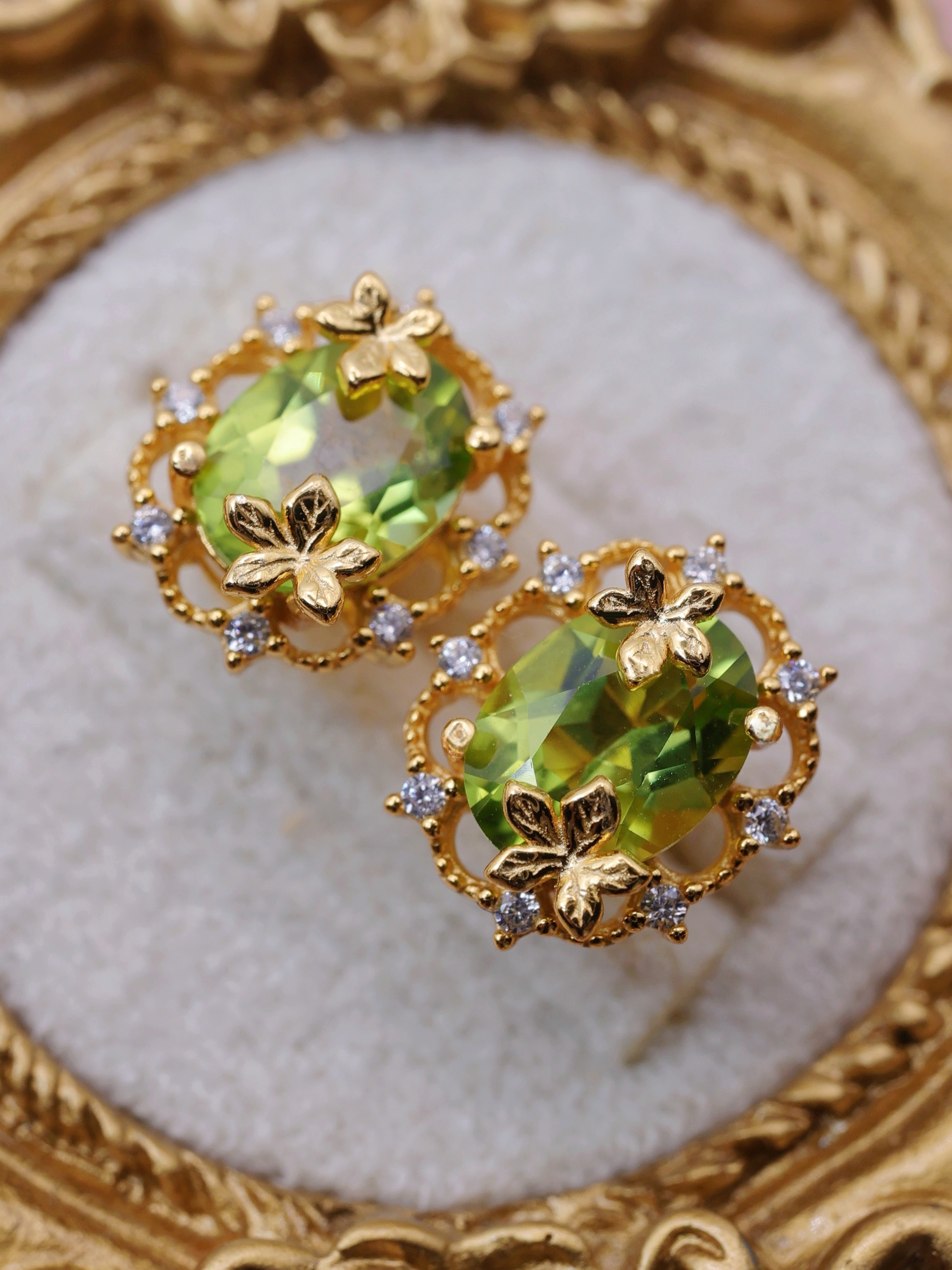 瑞々しいペリドットが中心で輝き、小花とジルコニアの光が雨粒のように寄り添います。