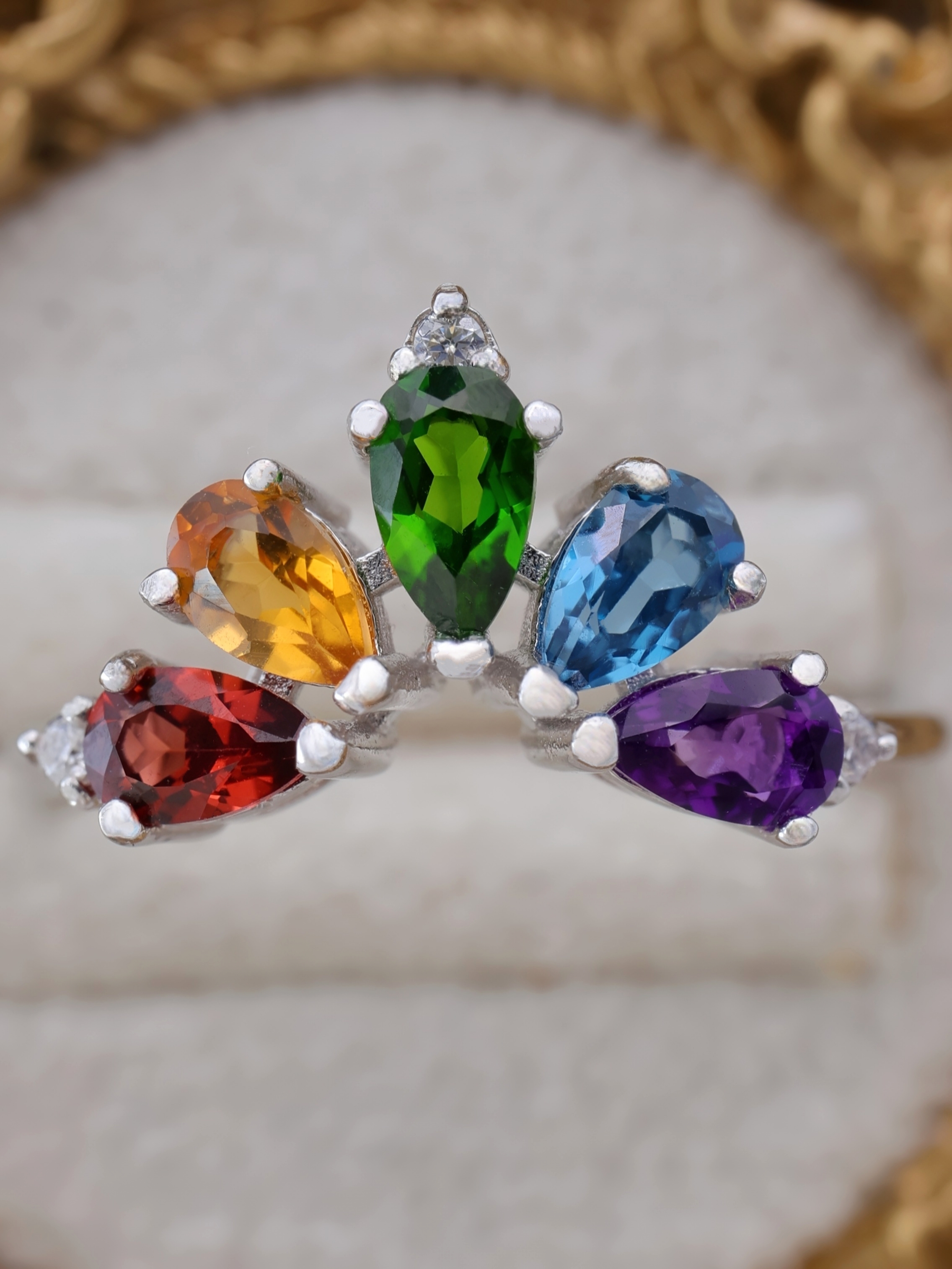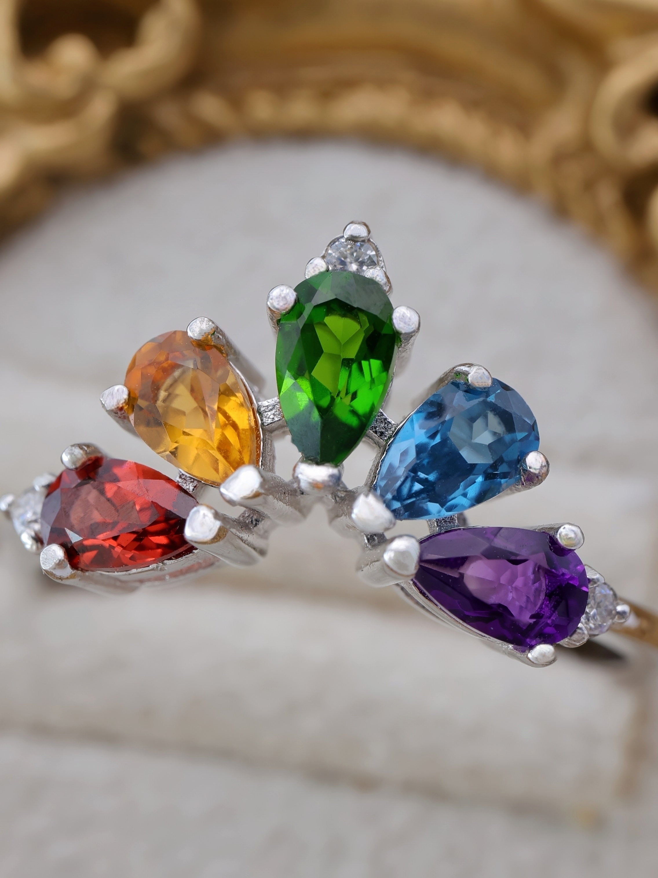 その両側には、夕暮れの光のように温かく輝くシトリンと、爽やかな青を映すブルートパーズが続き、端には情熱的な赤のガーネットと、神秘的に輝くアメジストが寄り添います。