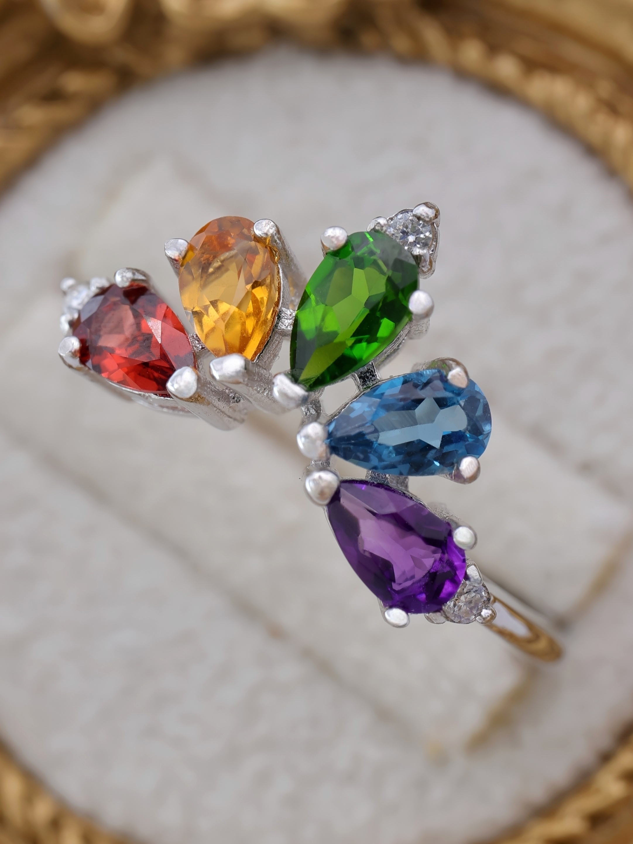 ガーネット、シトリン、ダイオプサイト、ブルートパーズ、アメジストを贅沢に並べた、