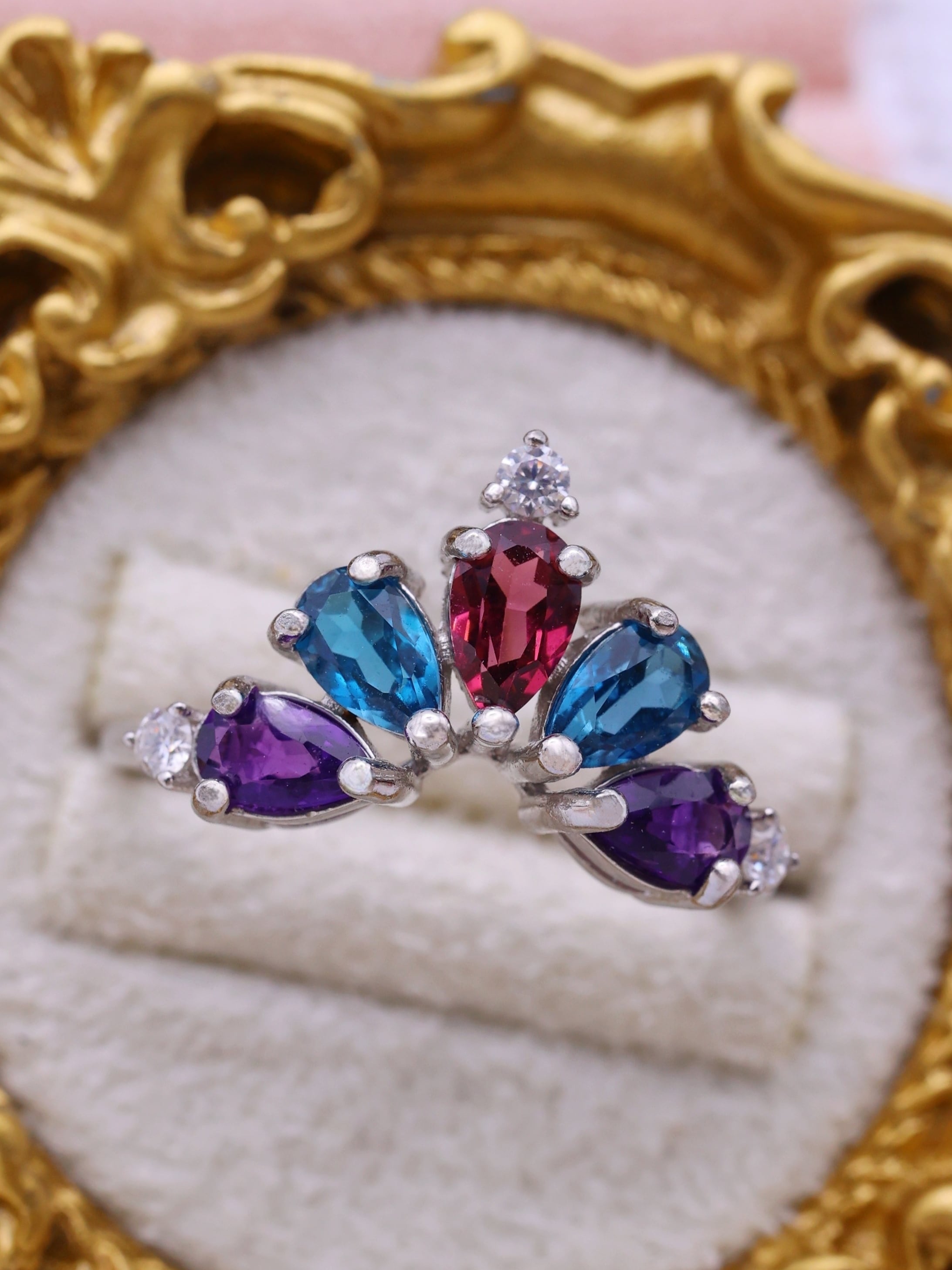 それぞれの宝石が、まるで“女王の正装”を思わせるように配置された、冬の光によく映える特別なリングです。