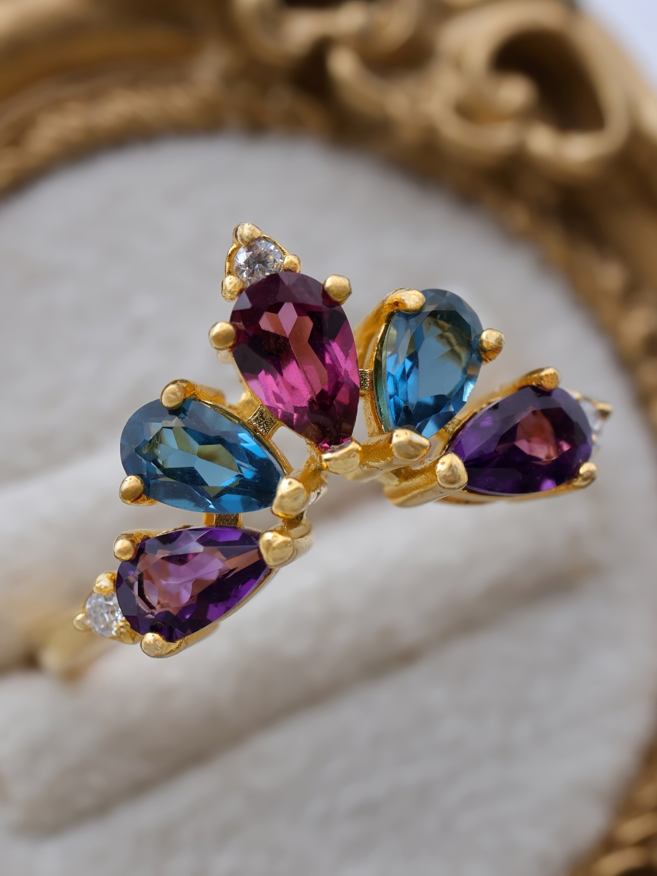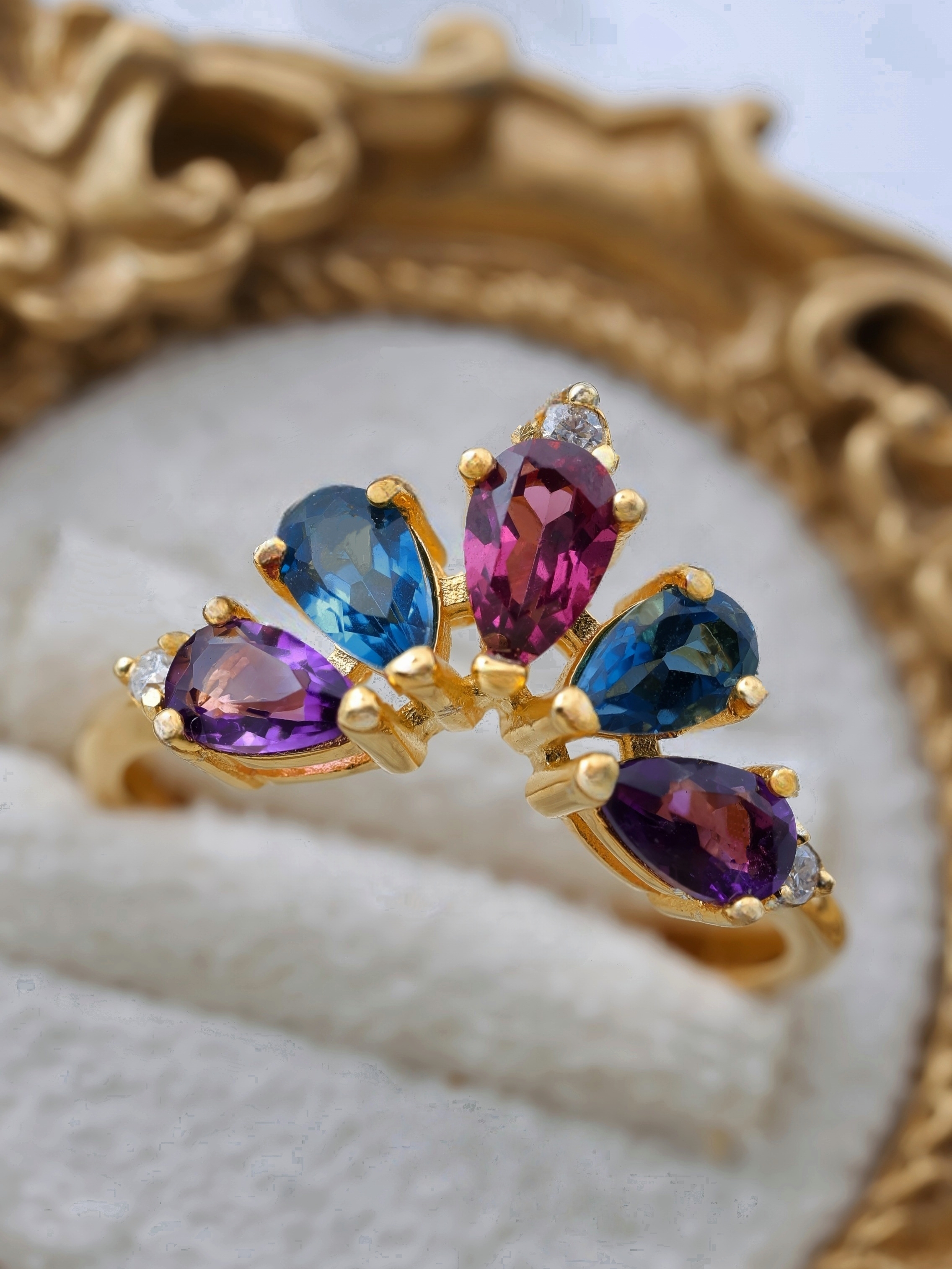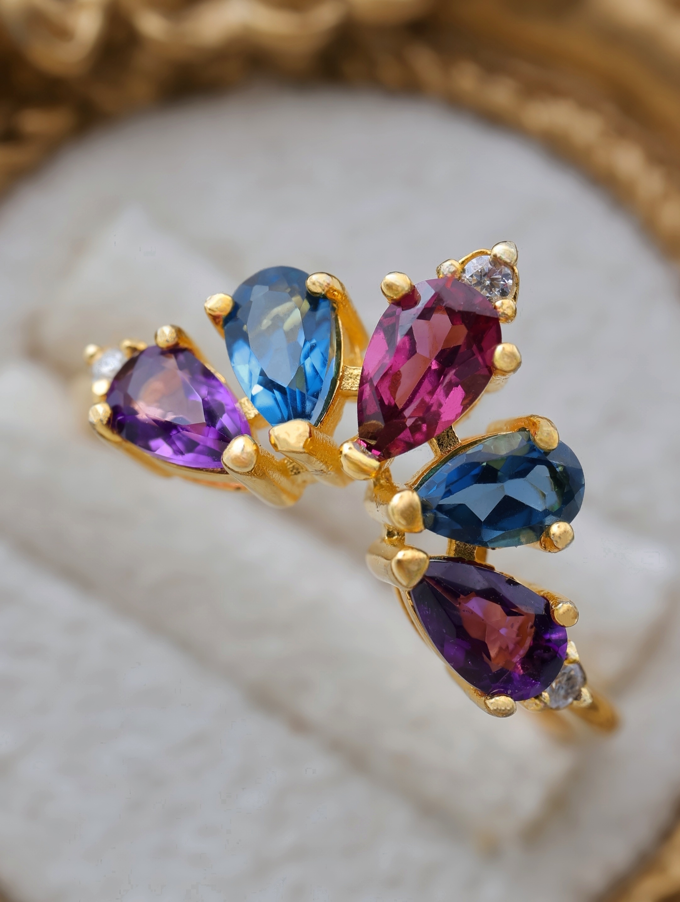 それぞれの宝石が、まるで“女王の正装”を思わせるように配置された、冬の光によく映える特別なリングです。