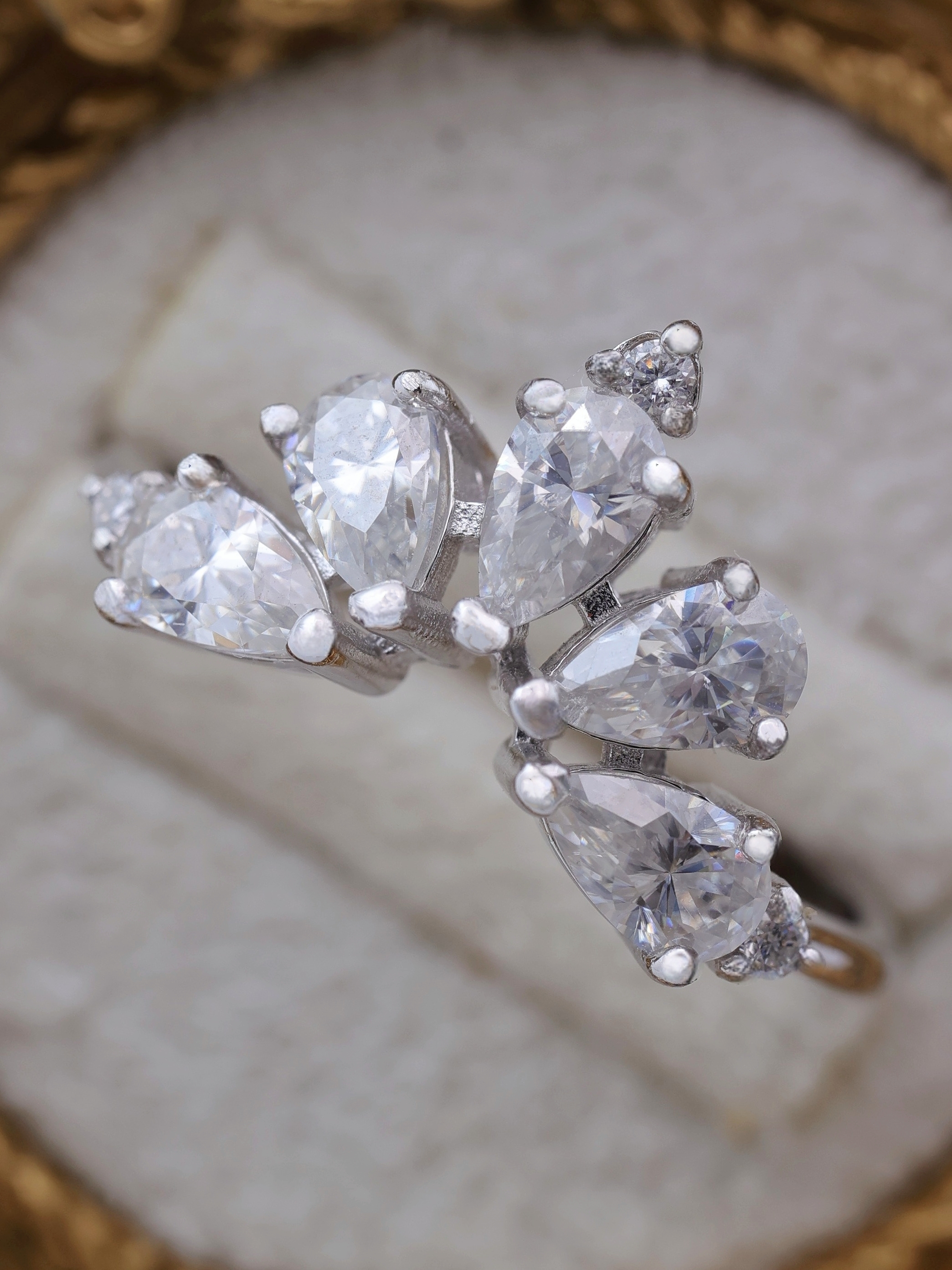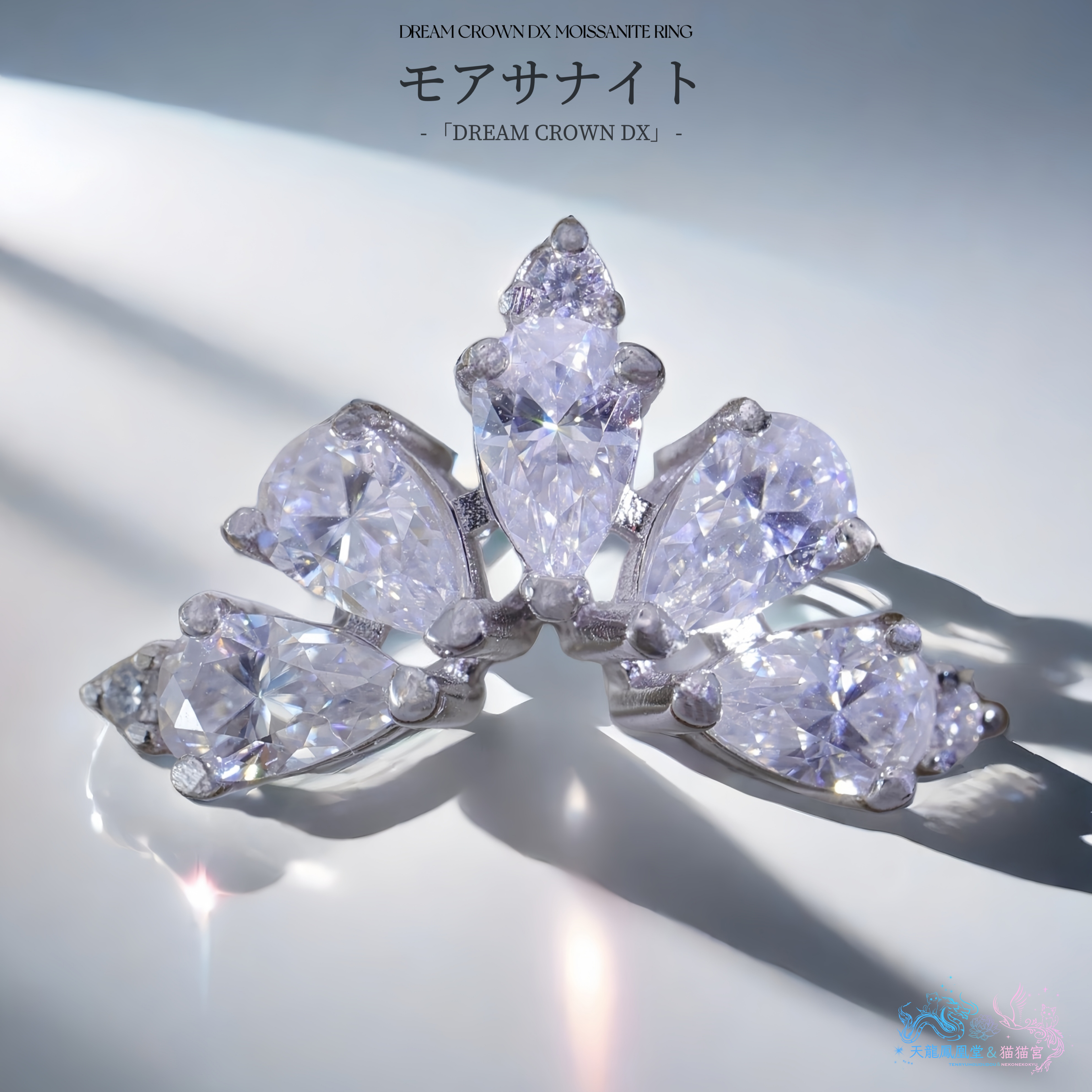 王冠を思わせる造形美と、モアサナイトの圧倒的な輝きが融合した、夢を纏うかのようなリングです。