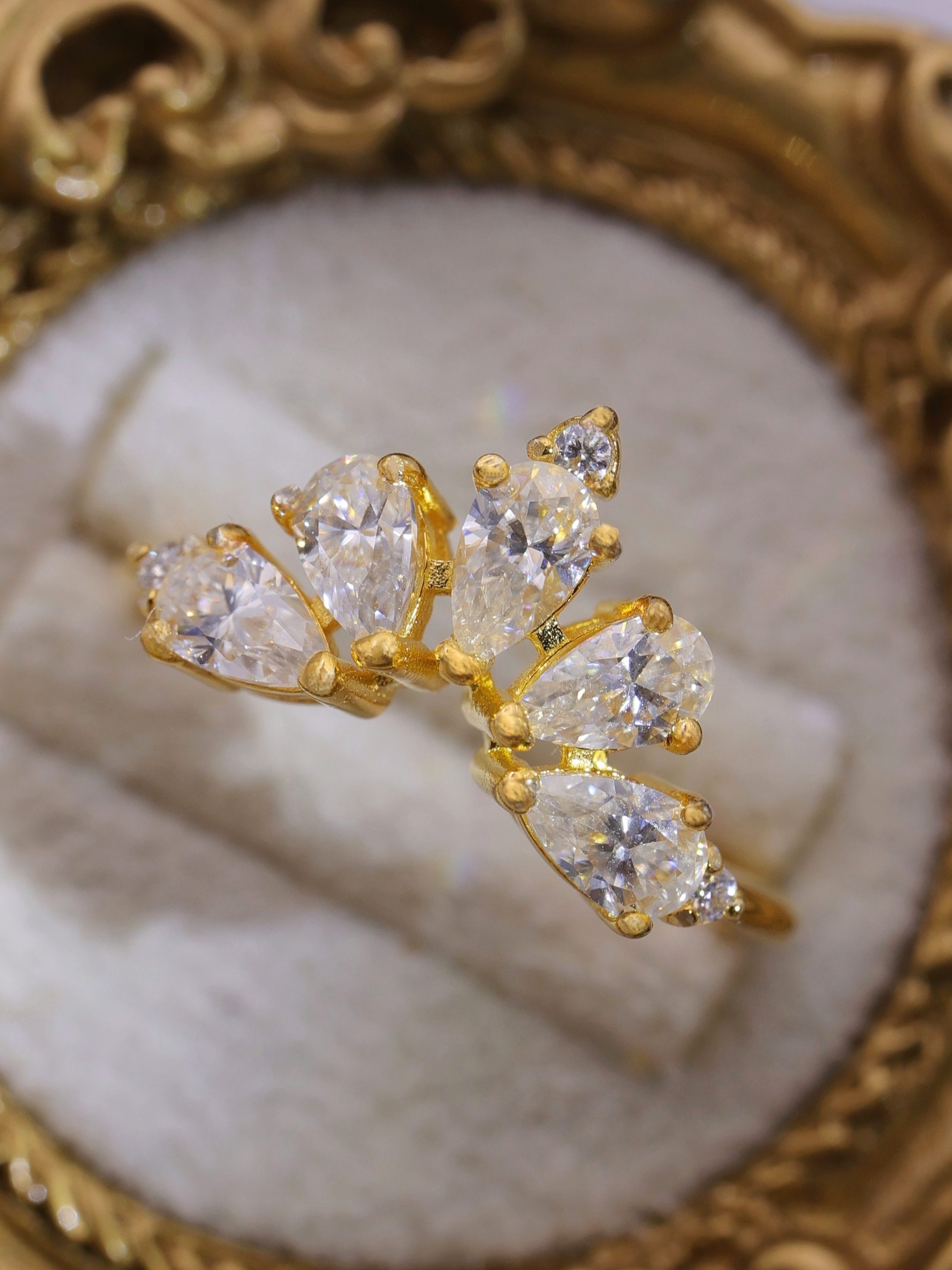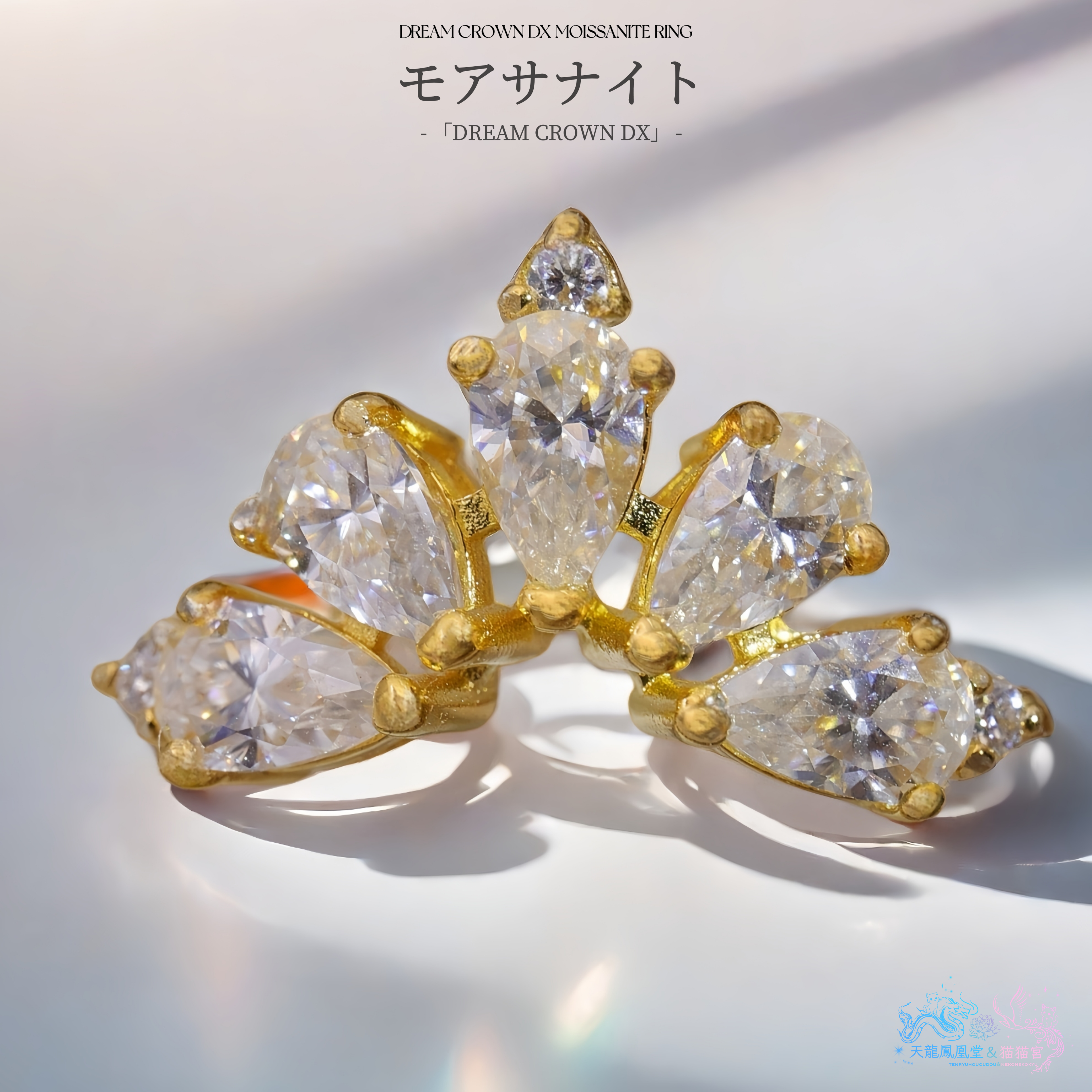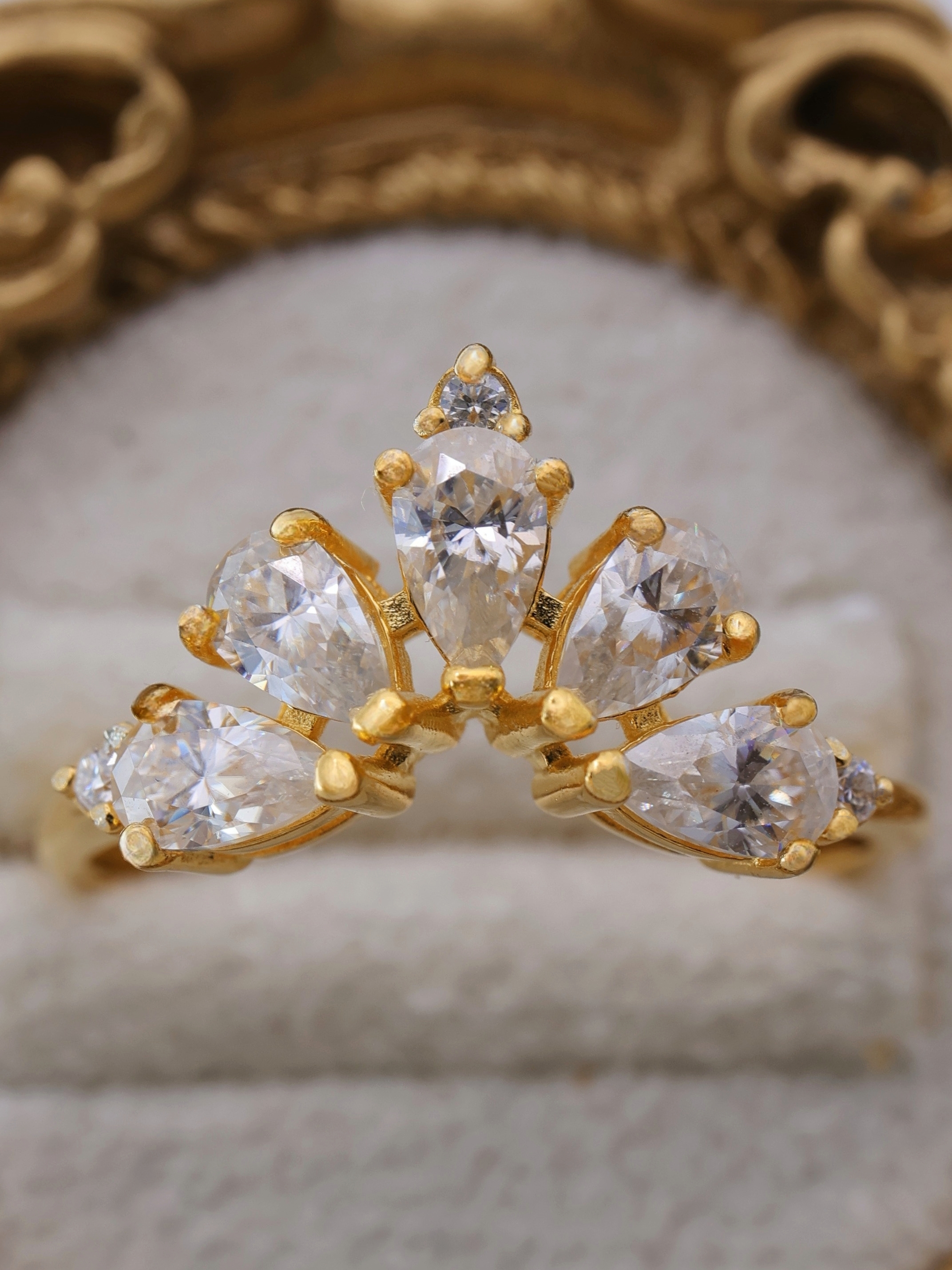 王冠を思わせる造形美と、モアサナイトの圧倒的な輝きが融合した、夢を纏うかのようなリングです。