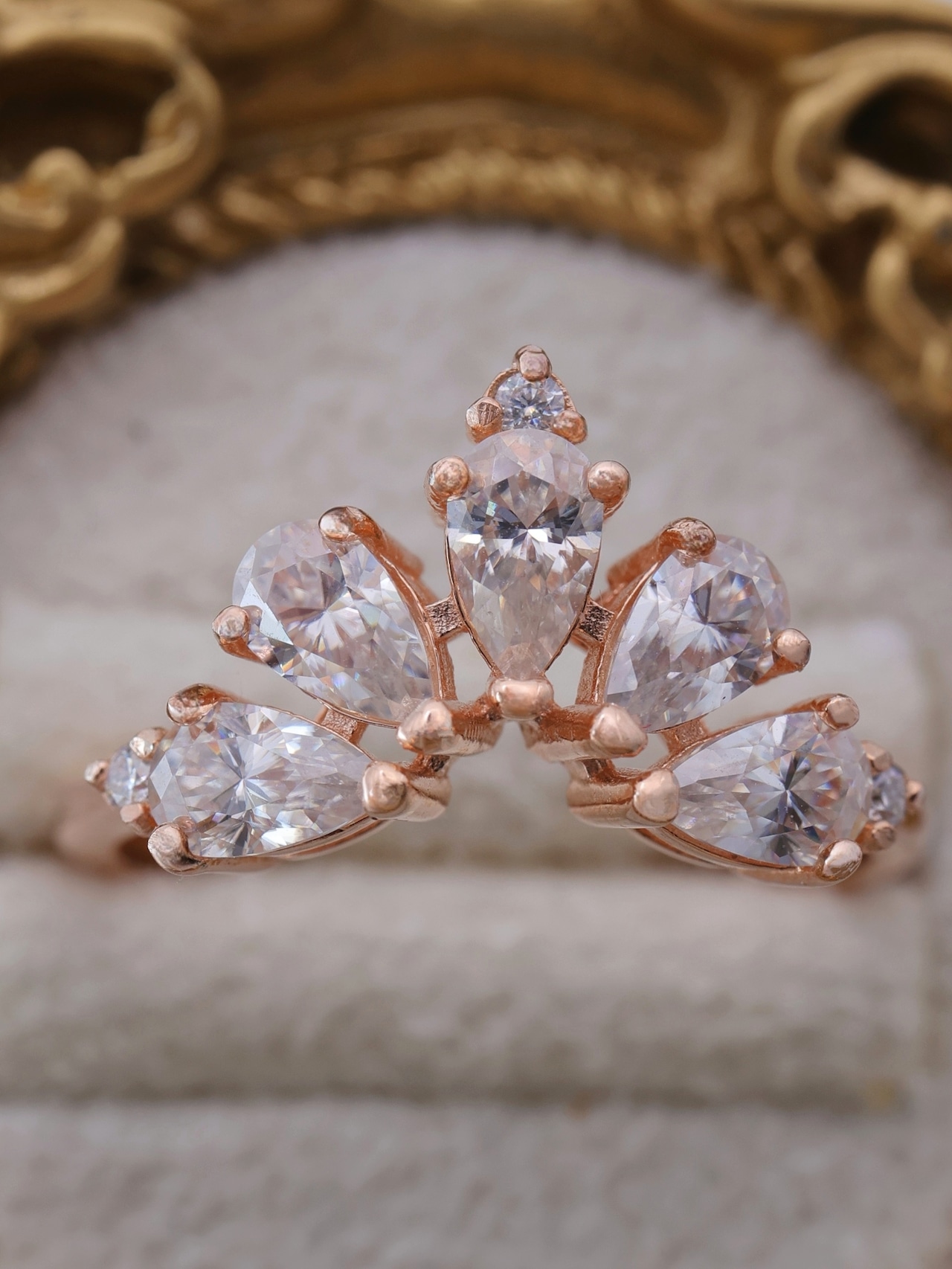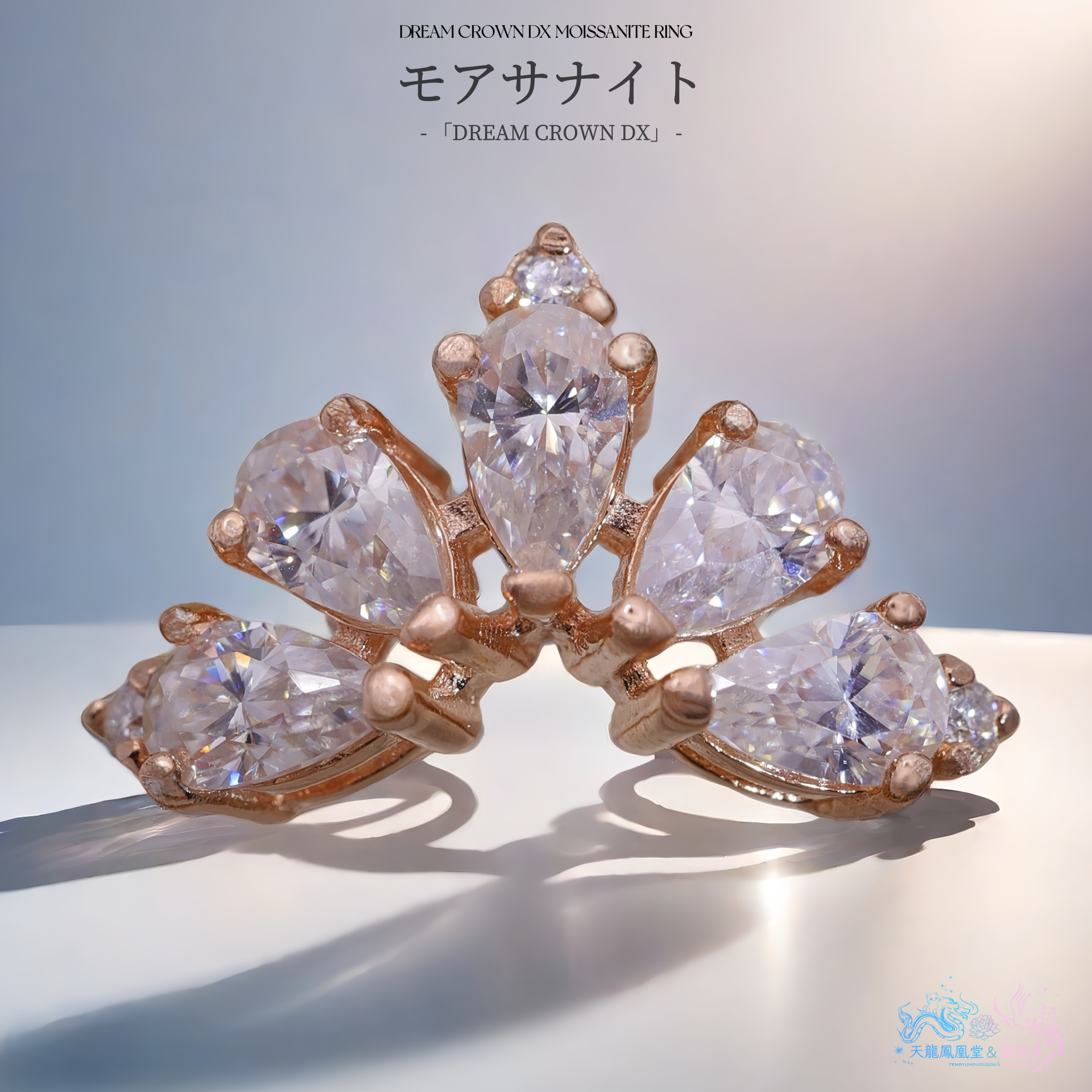 王冠を思わせる造形美と、モアサナイトの圧倒的な輝きが融合した、夢を纏うかのようなリングです。