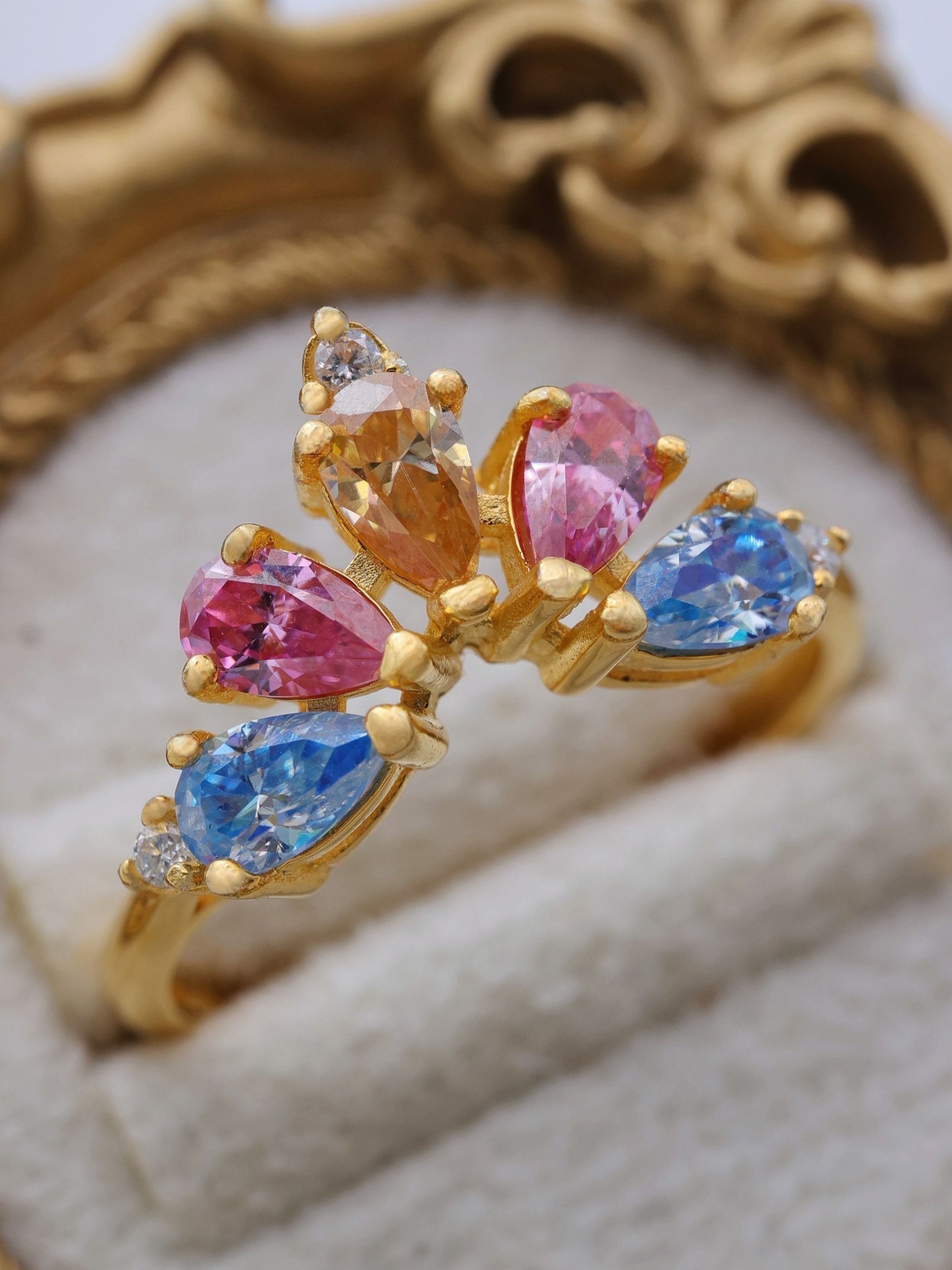 地金はゴールドを選択し、ピンク・オレンジ・ブルーそれぞれの発色をふんわりと温かく引き上げるように仕立てました。