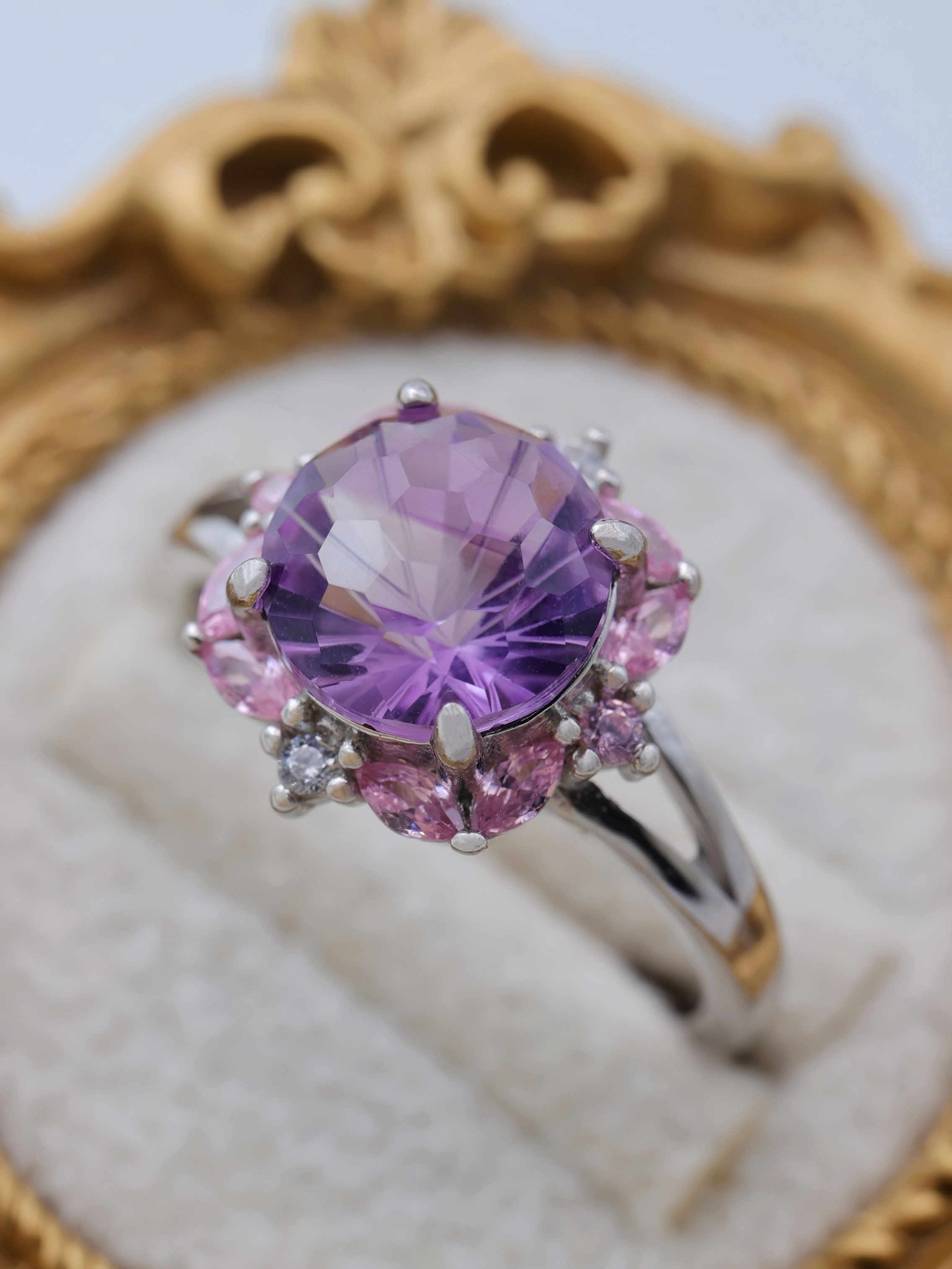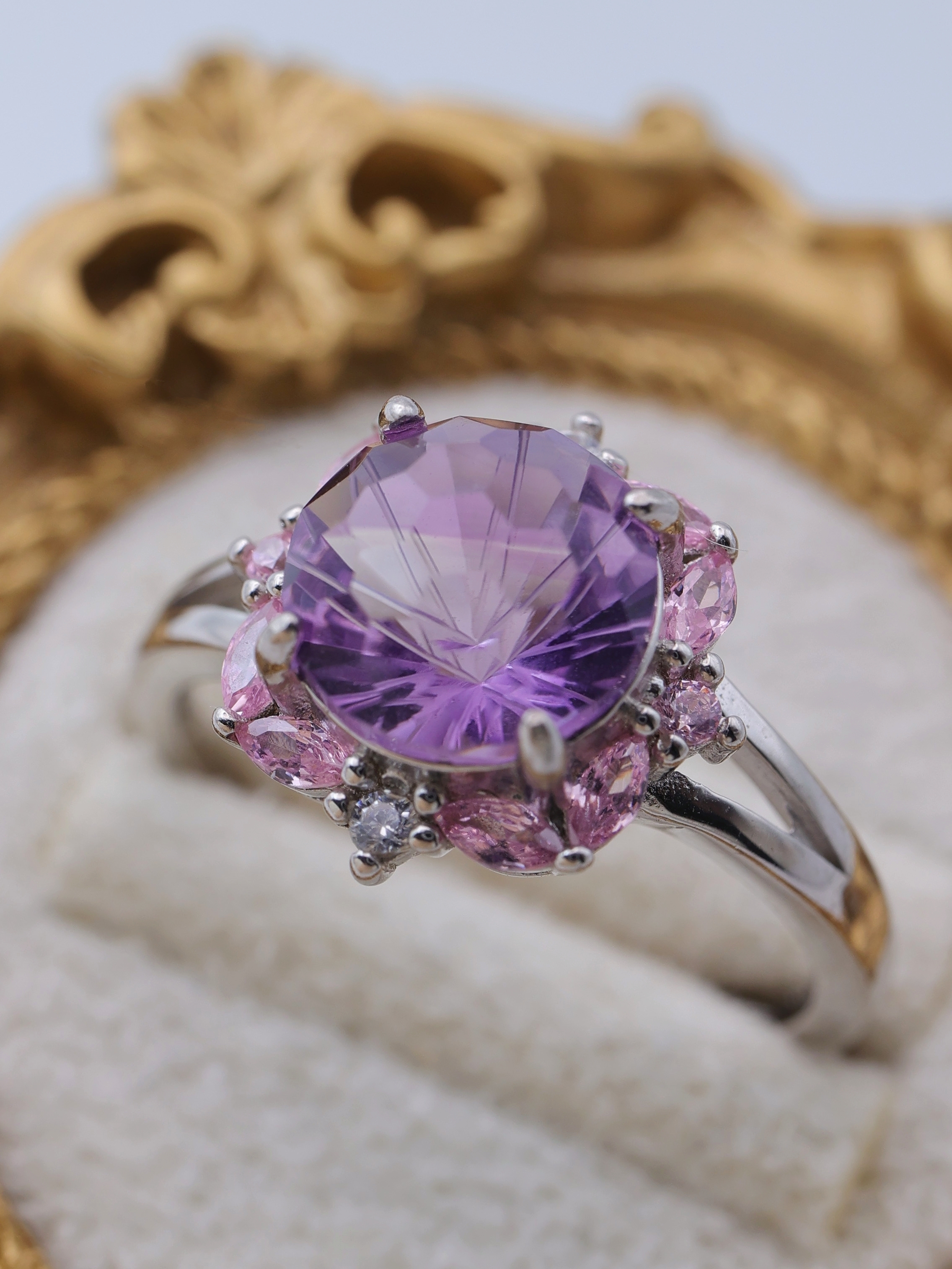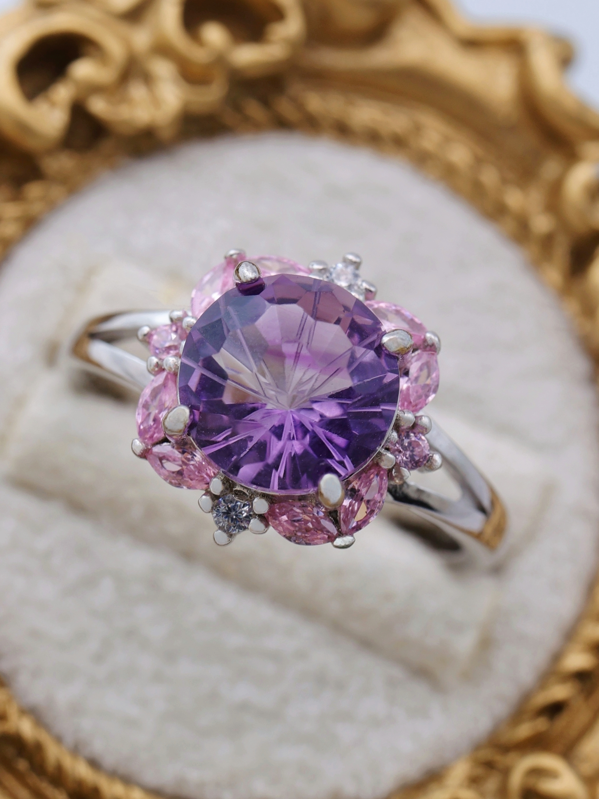 アメジストの周囲には、淡いピンクのジルコニアを花束のようにあしらったデザイン。