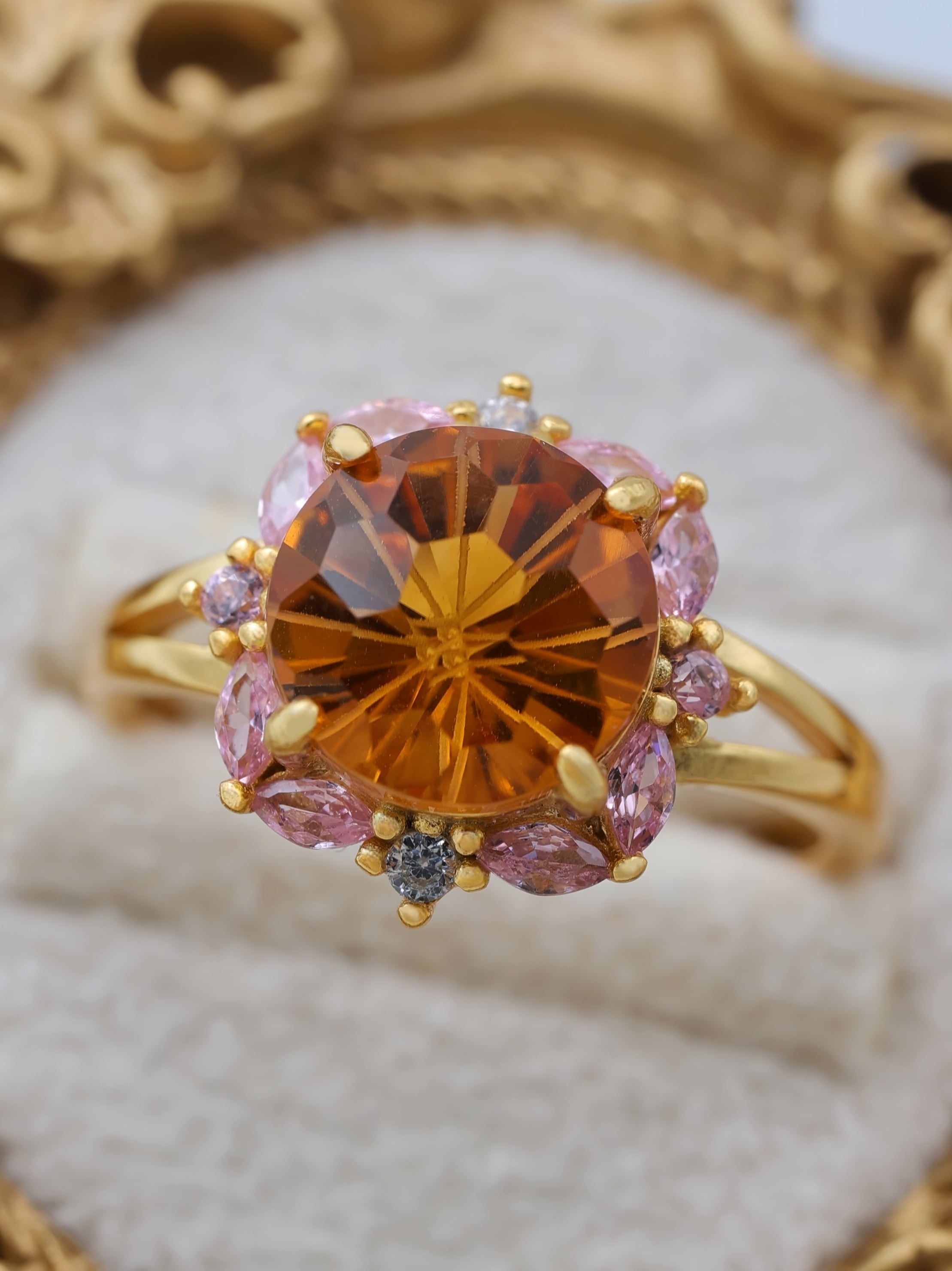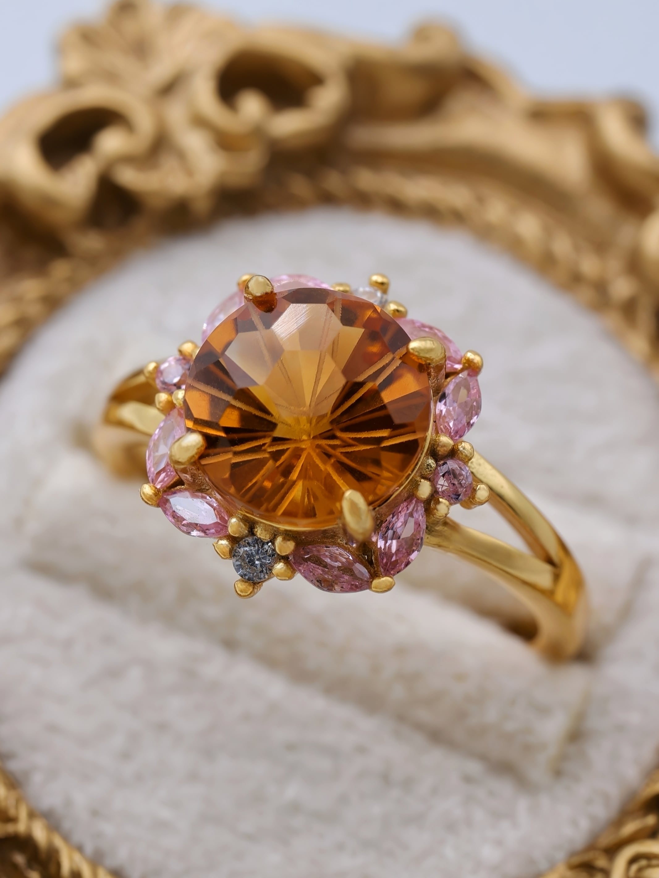 中央の黄金色を柔らかく引き立てるよう、周囲には優しい色味のピンクジルコニアを配置。
