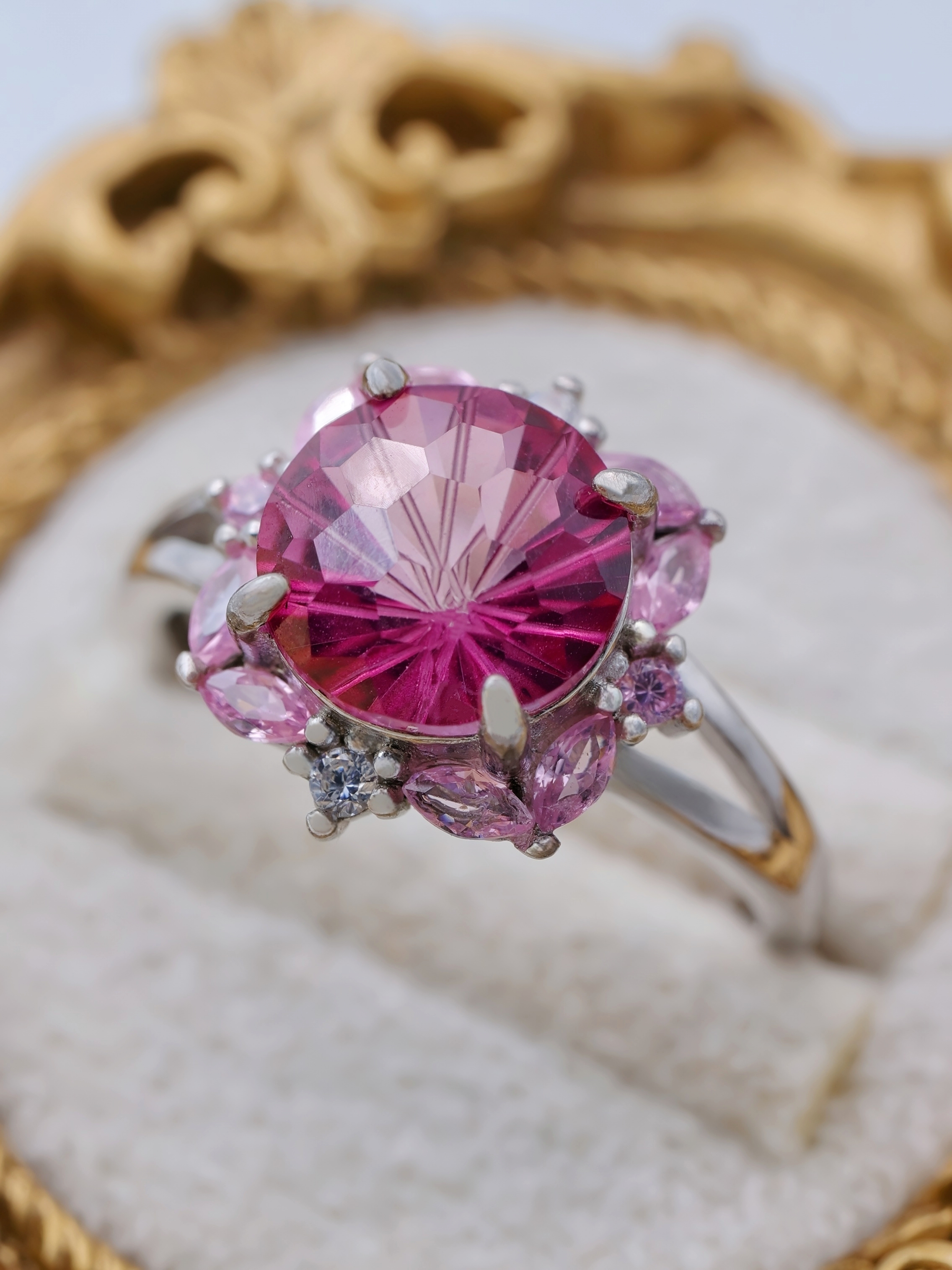 主石の鮮やかさを引き立てるため、周囲には淡く柔らかな色味のピンクジルコニアを花弁のように配置。濃淡ピンクのグラデーションが生まれ、可憐で華やかな“花束”のような佇まいに。