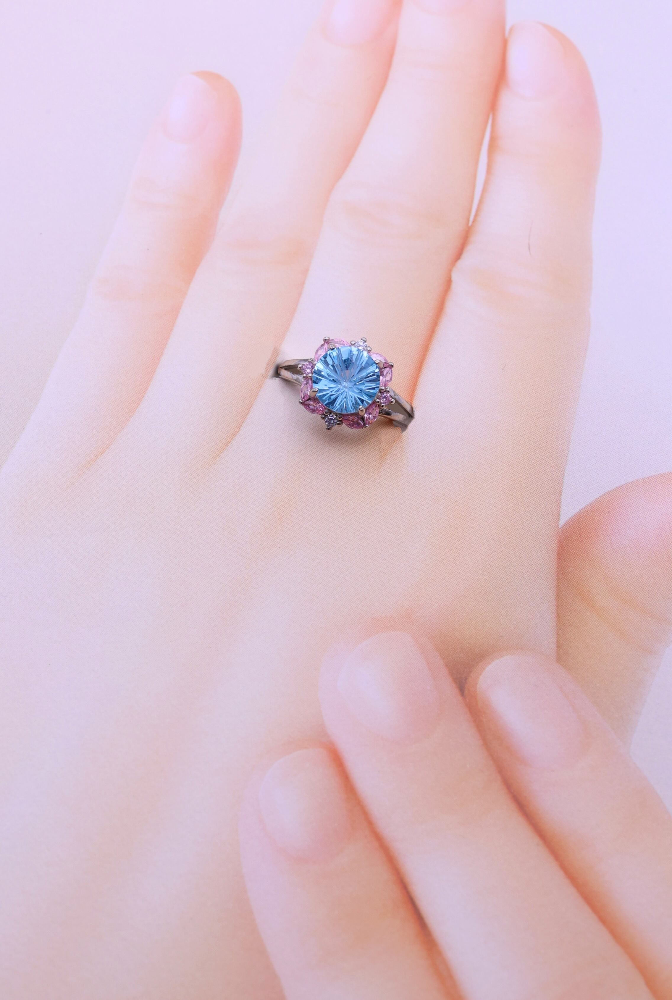 主石を囲むのは淡い色合いのピンクジルコニア。