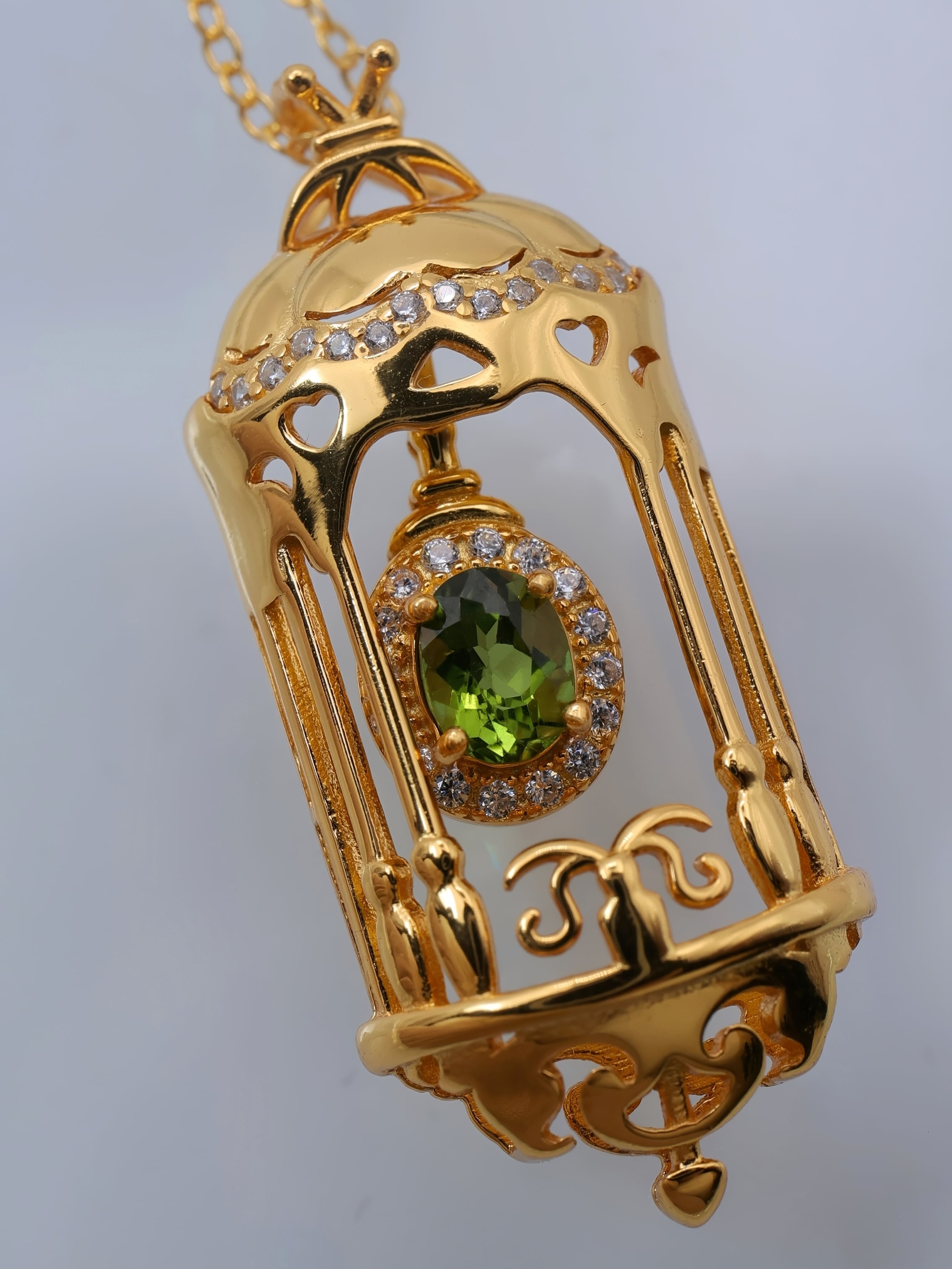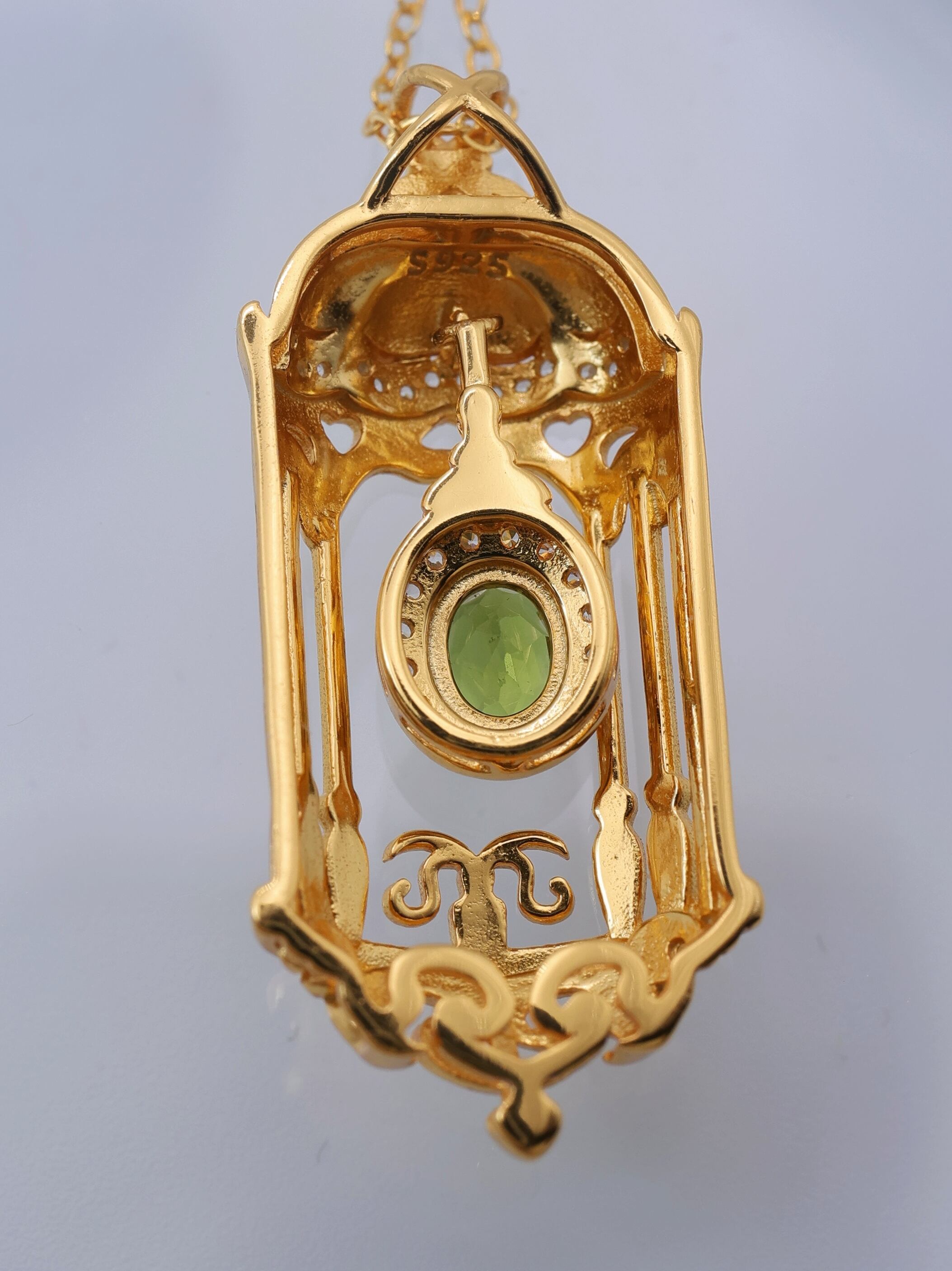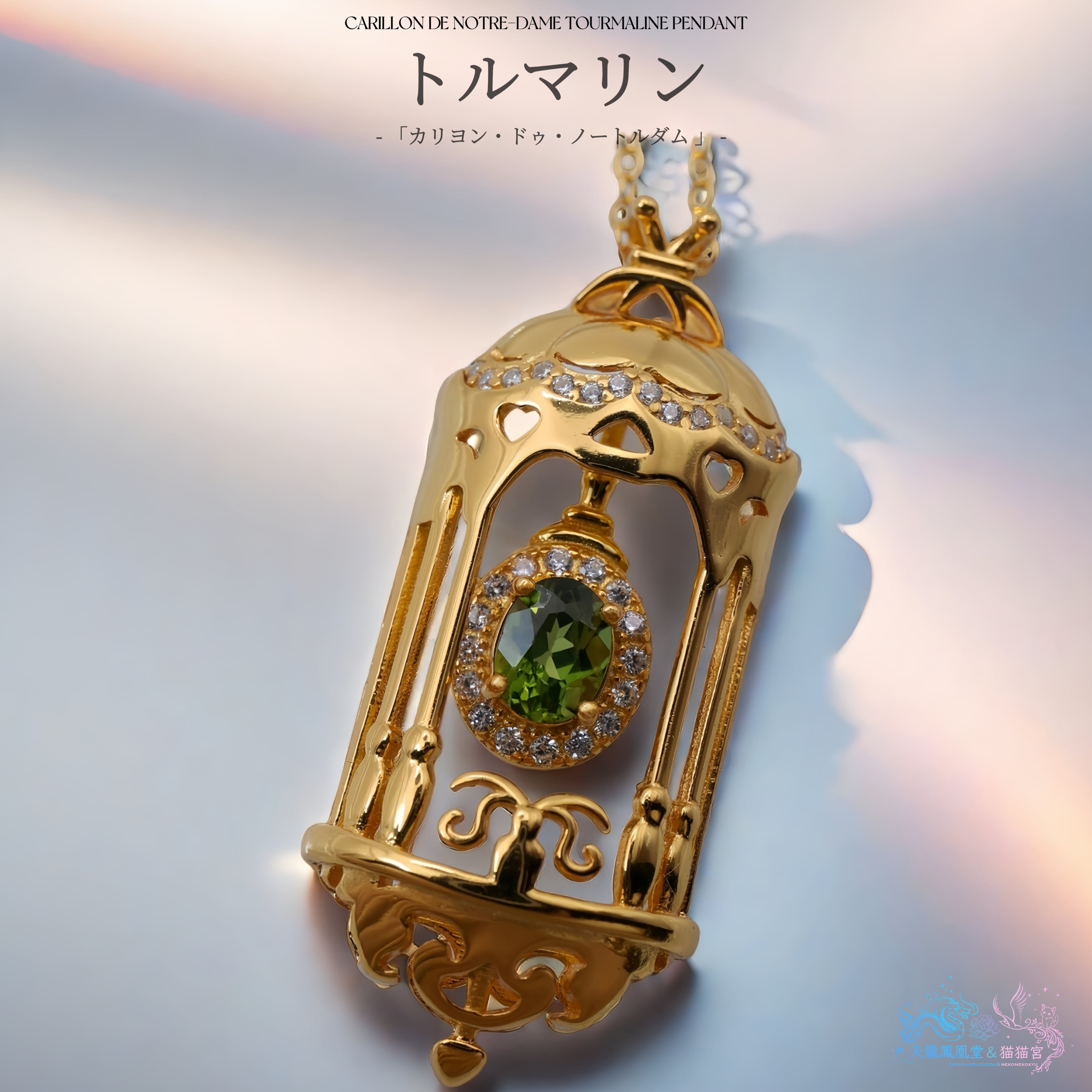 イエローゴールドの温かさ、聖堂を思わせる荘厳なデザイン、そして瑞々しいグリーントルマリンの透明感が重なり合い、ひとつの物語を紡ぐペンダントに仕上がっています。