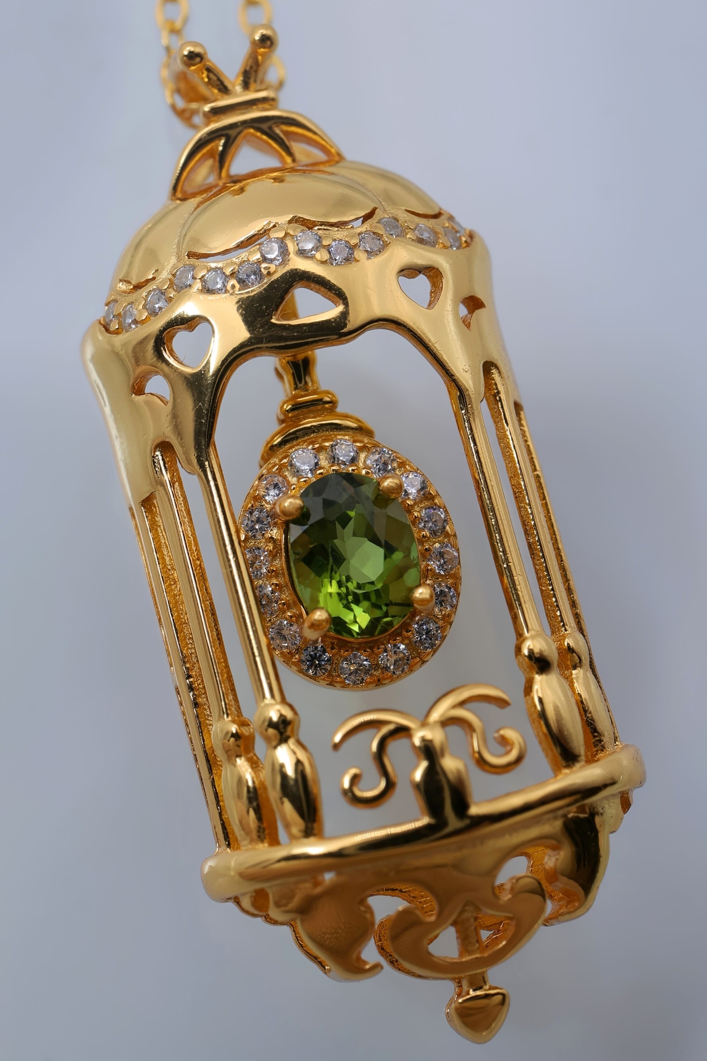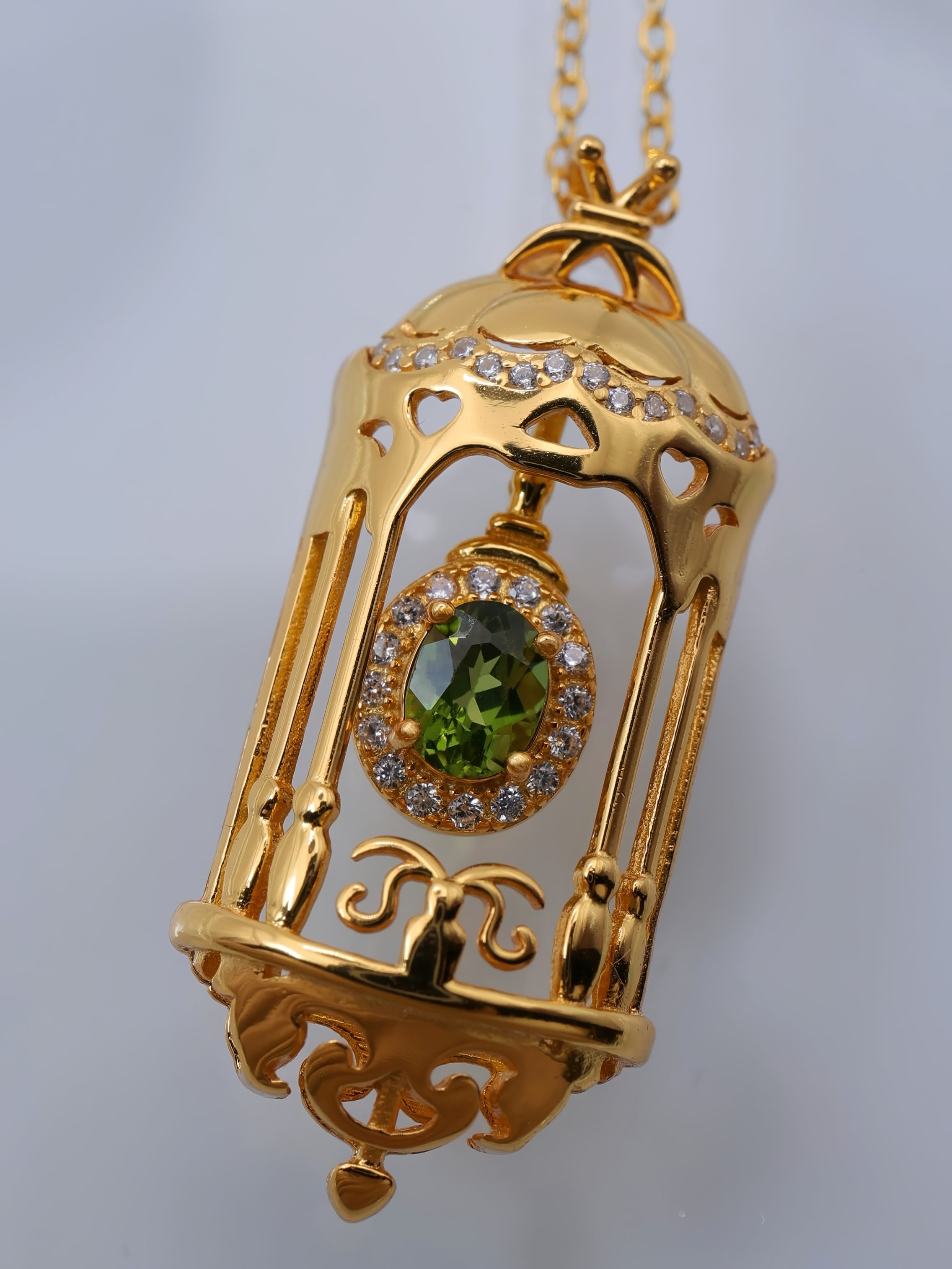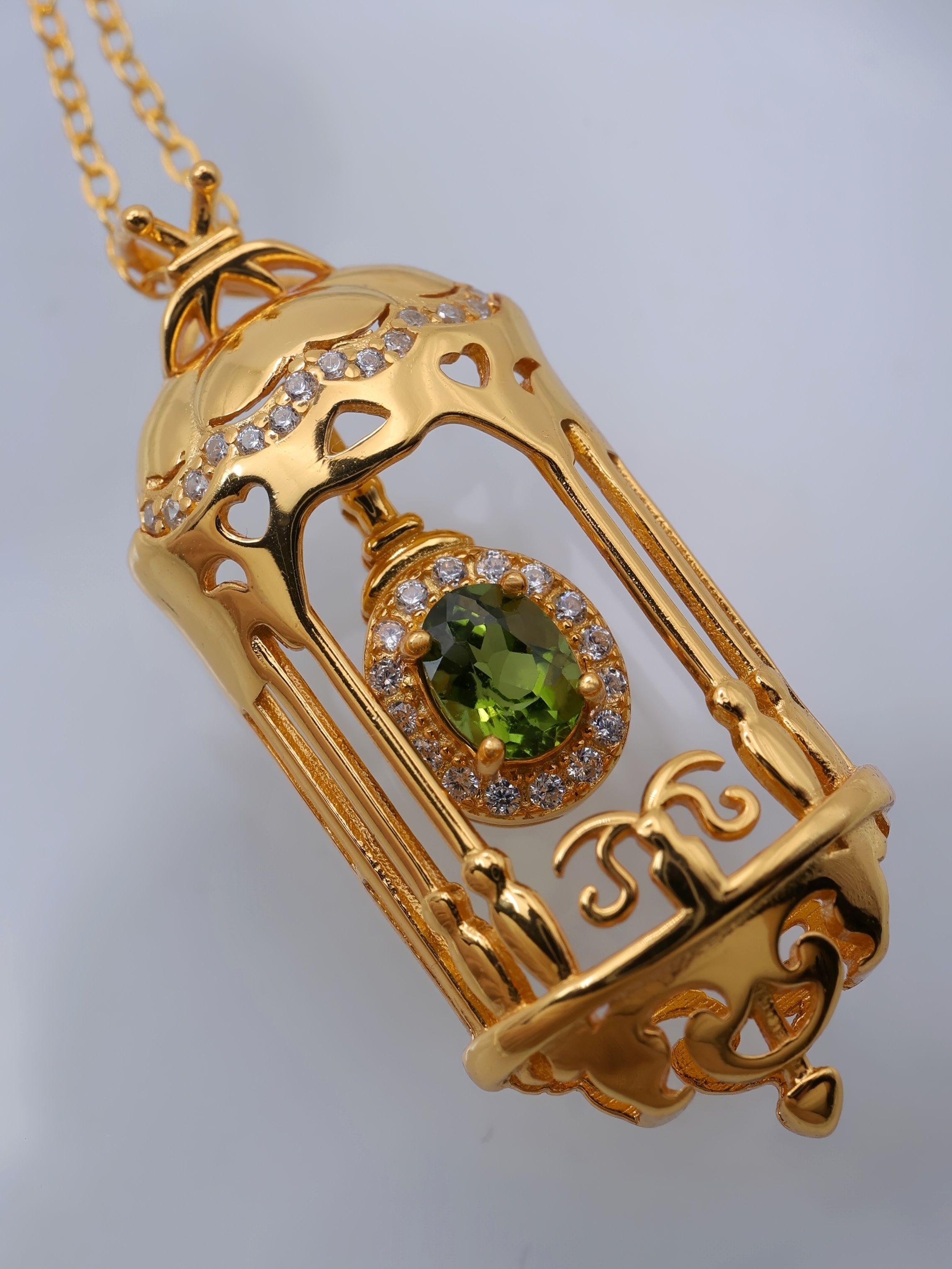 イエローゴールドの温かさ、聖堂を思わせる荘厳なデザイン、そして瑞々しいグリーントルマリンの透明感が重なり合い、ひとつの物語を紡ぐペンダントに仕上がっています。