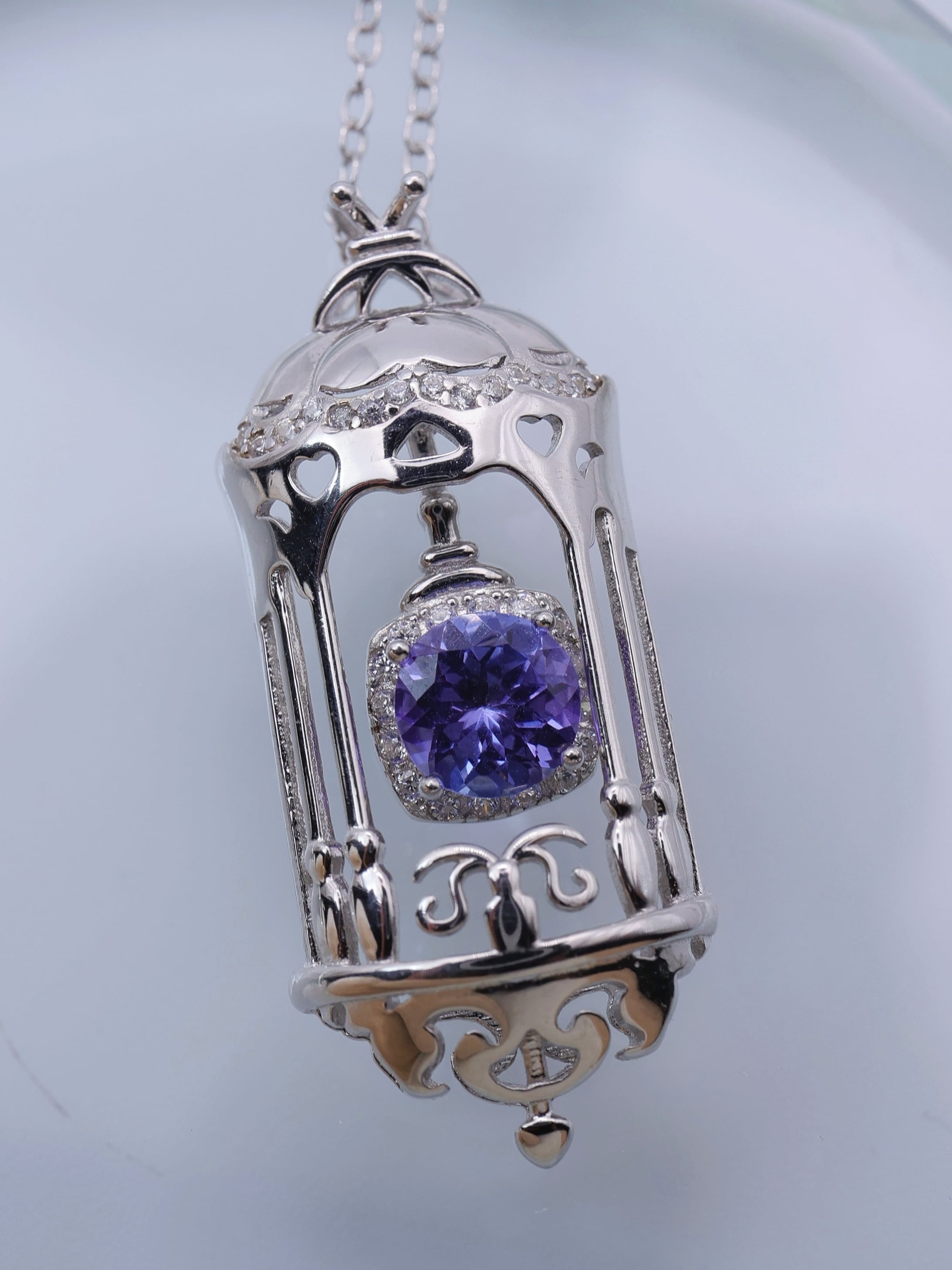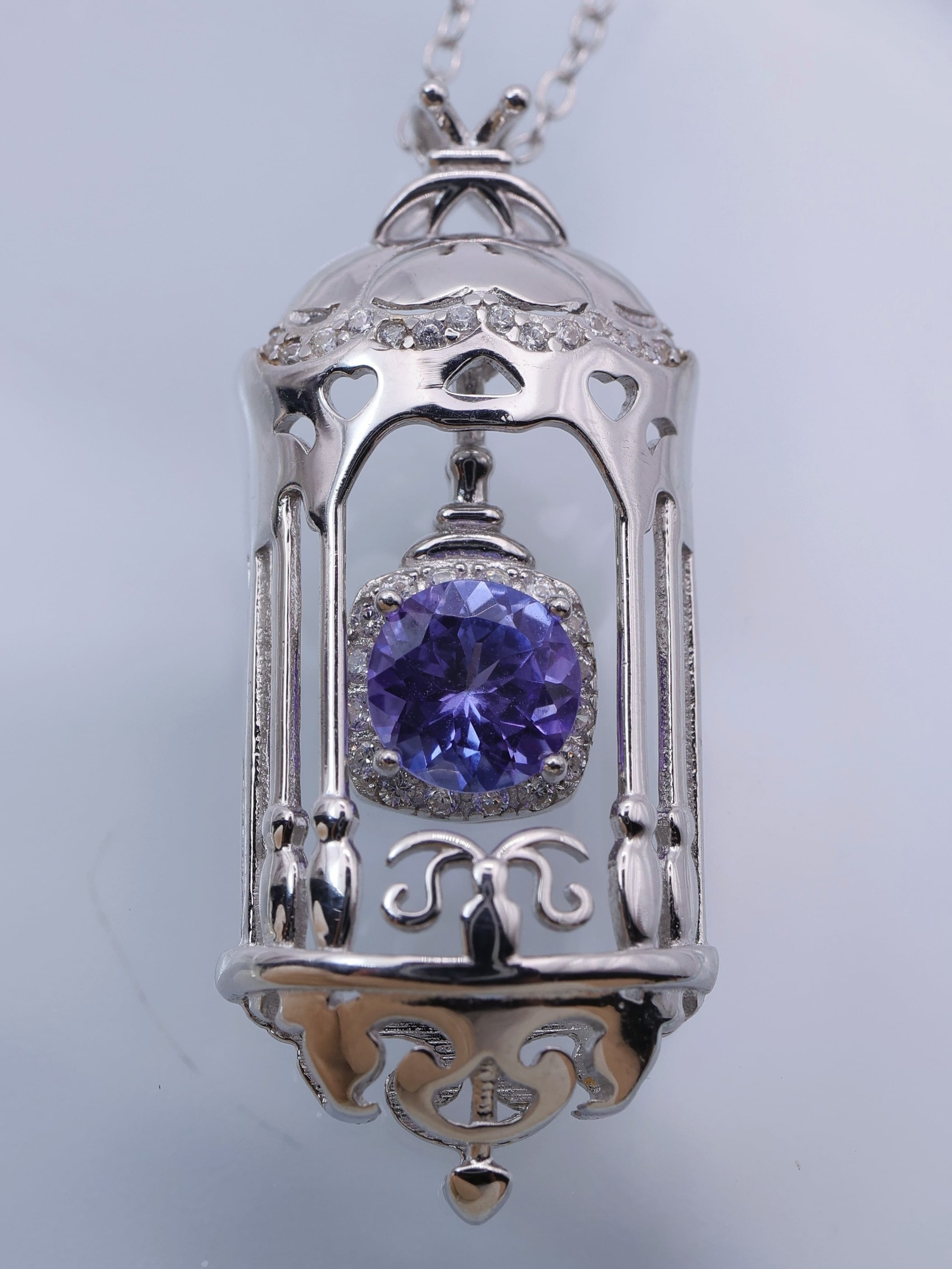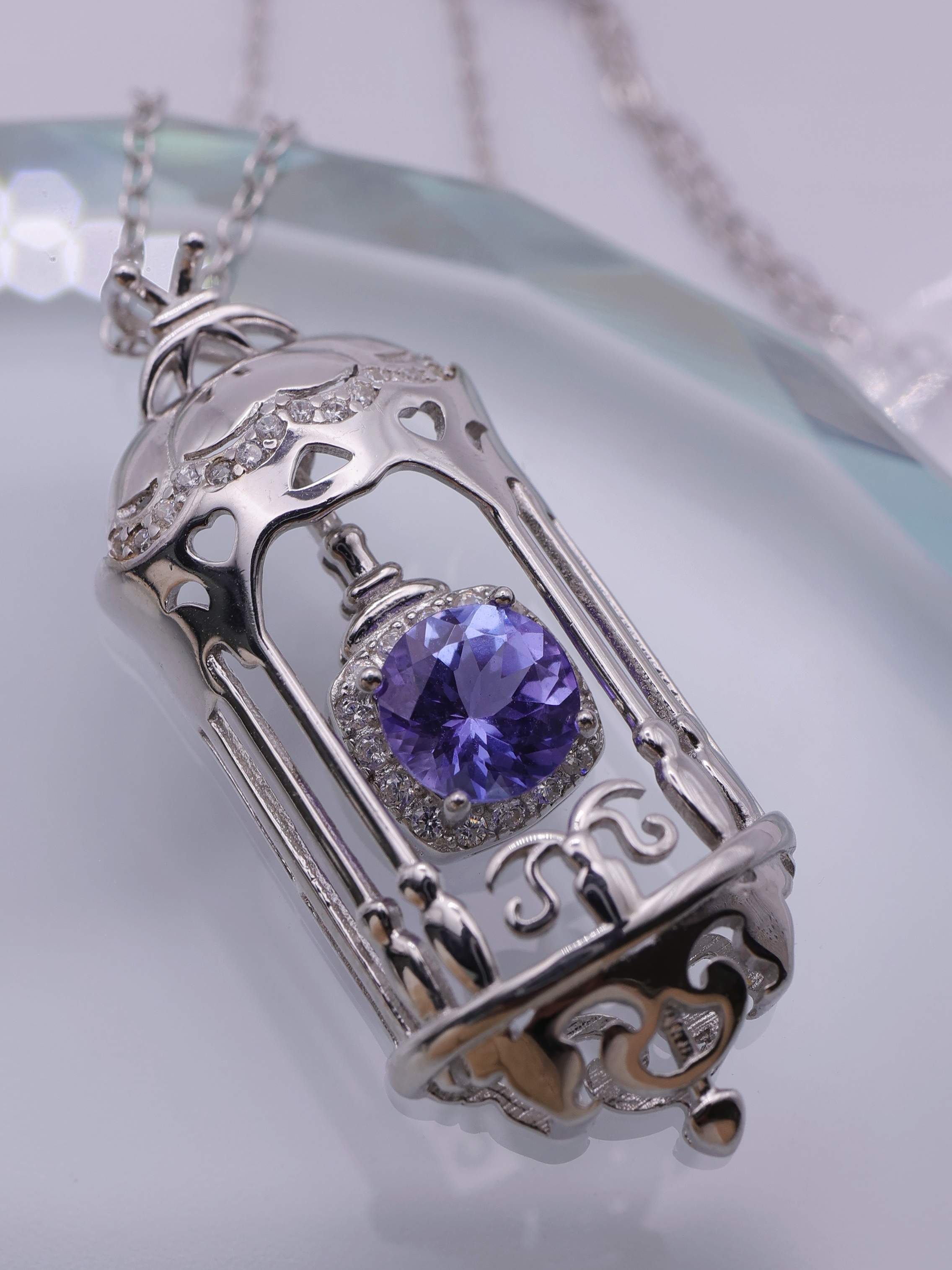 動きに合わせて中央のタンザナイトが優雅に揺れ、鐘楼の静かな空間に光が満ちていくような、しっとりとした輝きを放ちます。