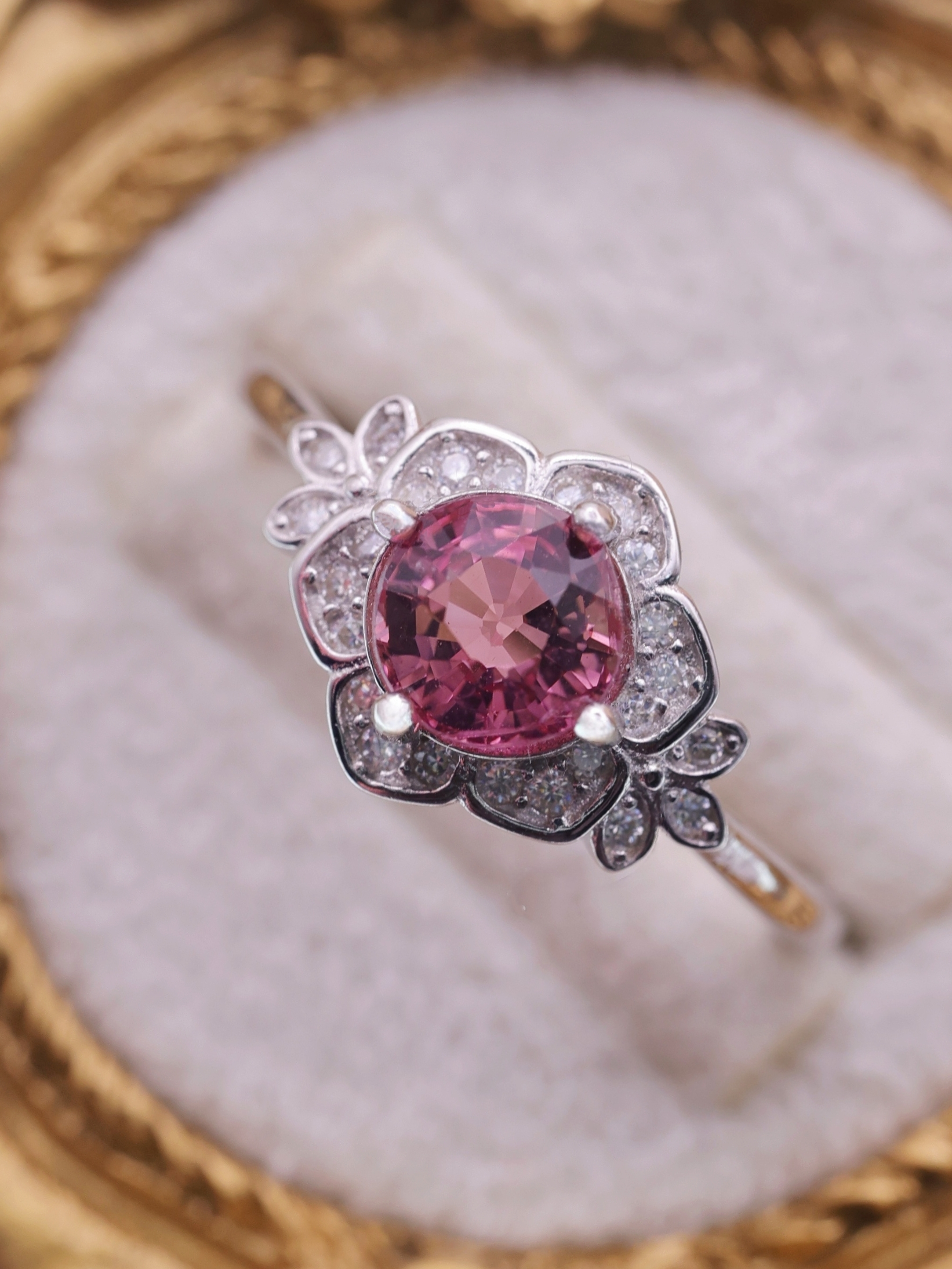 花弁を思わせる繊細な造形のフレームには、透明感のある輝きを添え、可憐さの中にクラシカルな存在感を宿しました。