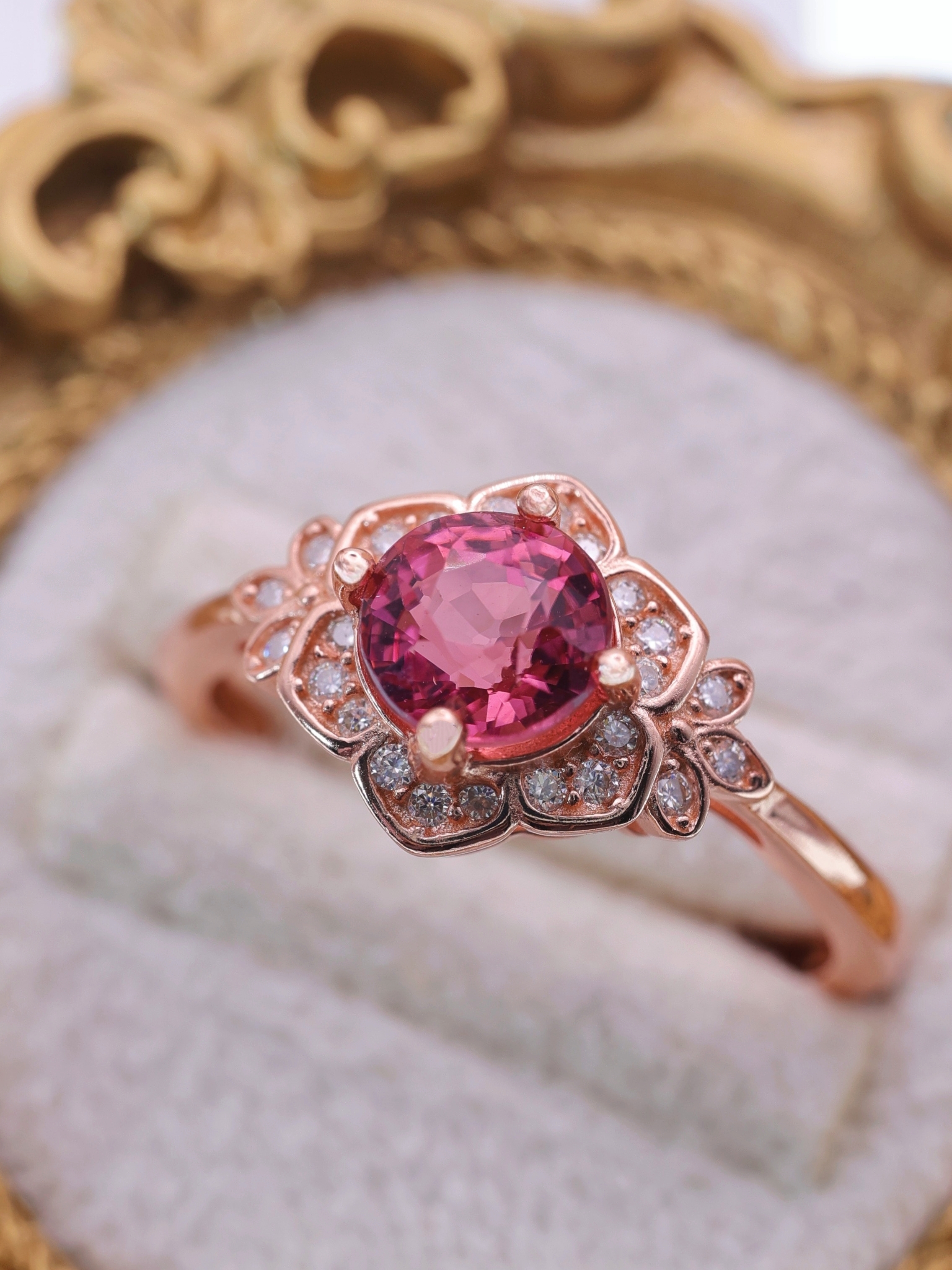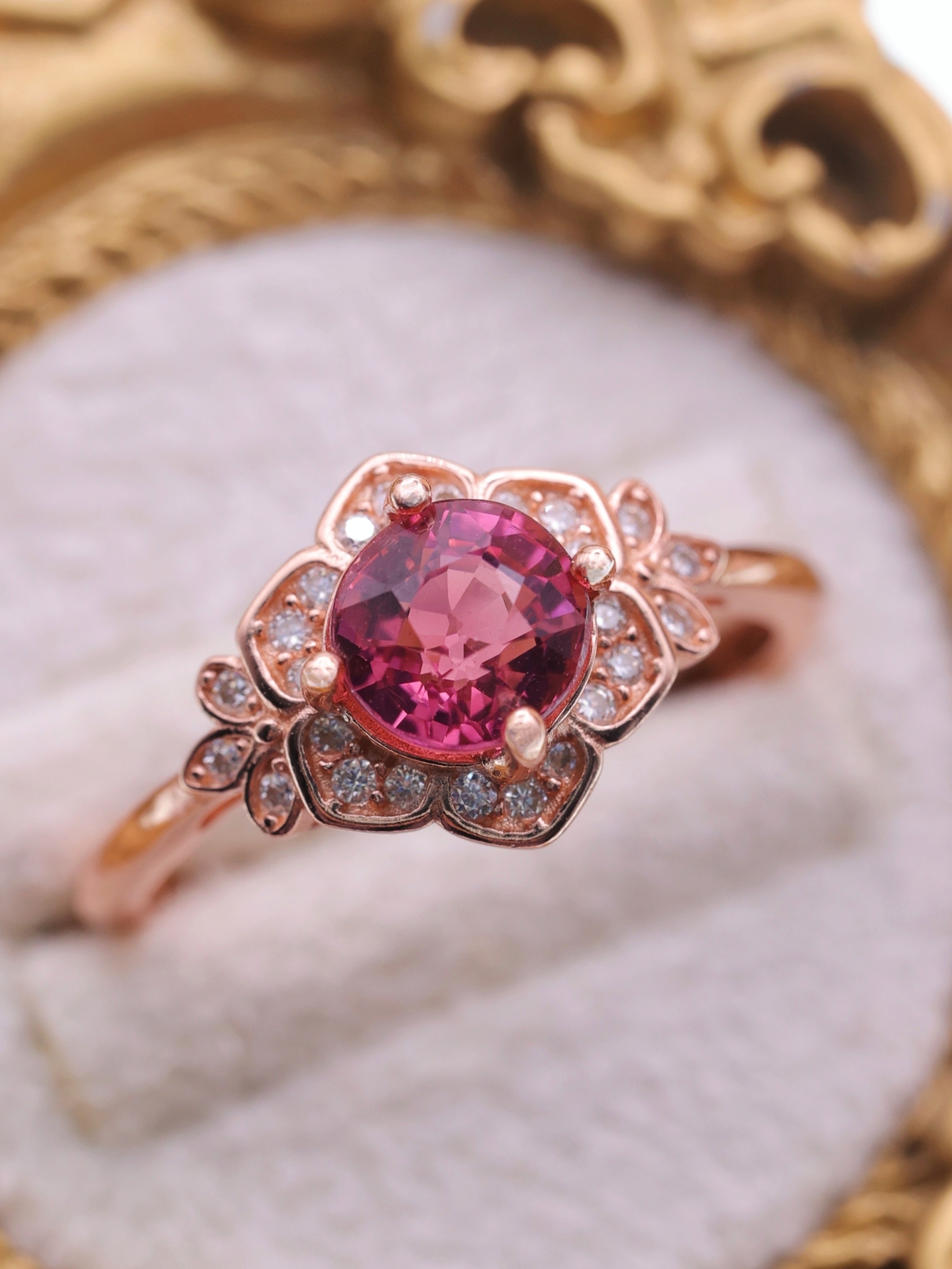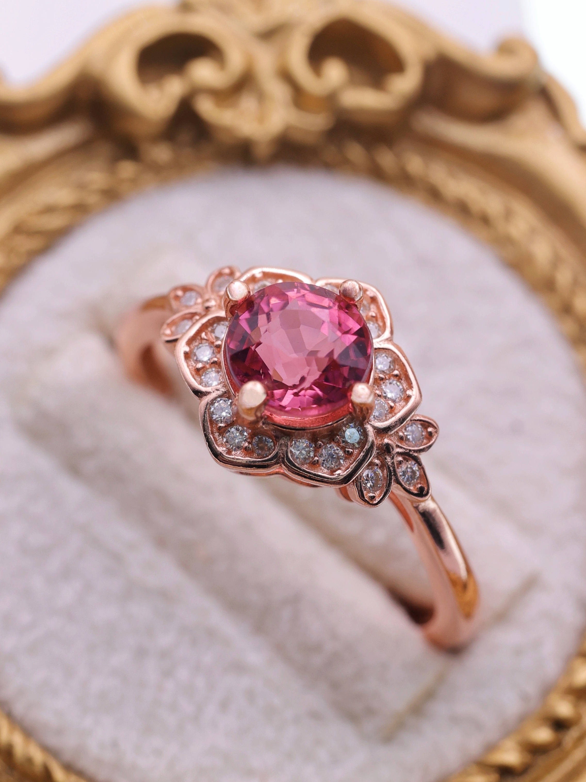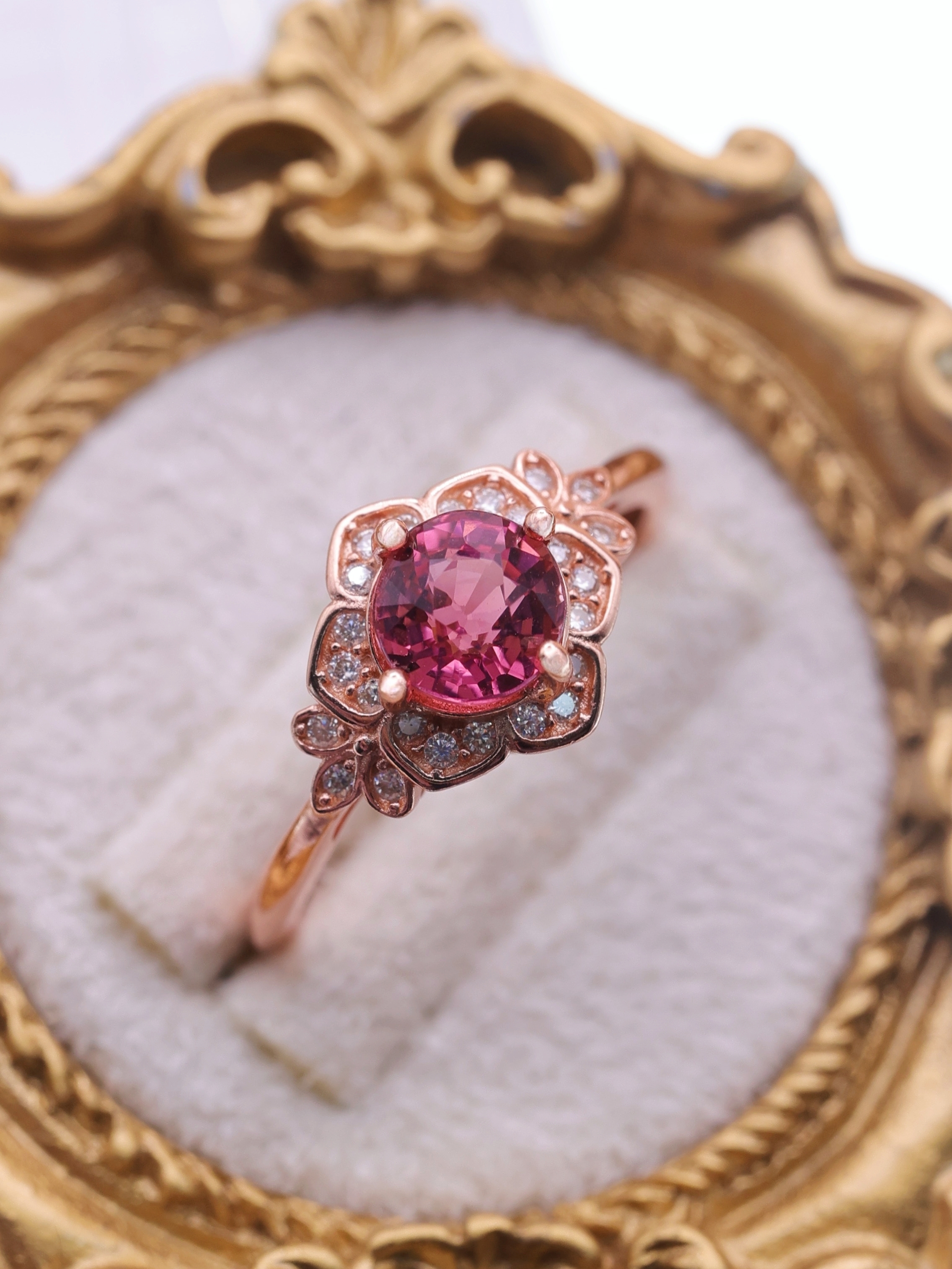 トルマリン特有の奥行きある色彩は、単調になりがちなピンク系とは一線を画し、角度や光量によって表情を変えながら、気品ある輝きを指元に添えます。