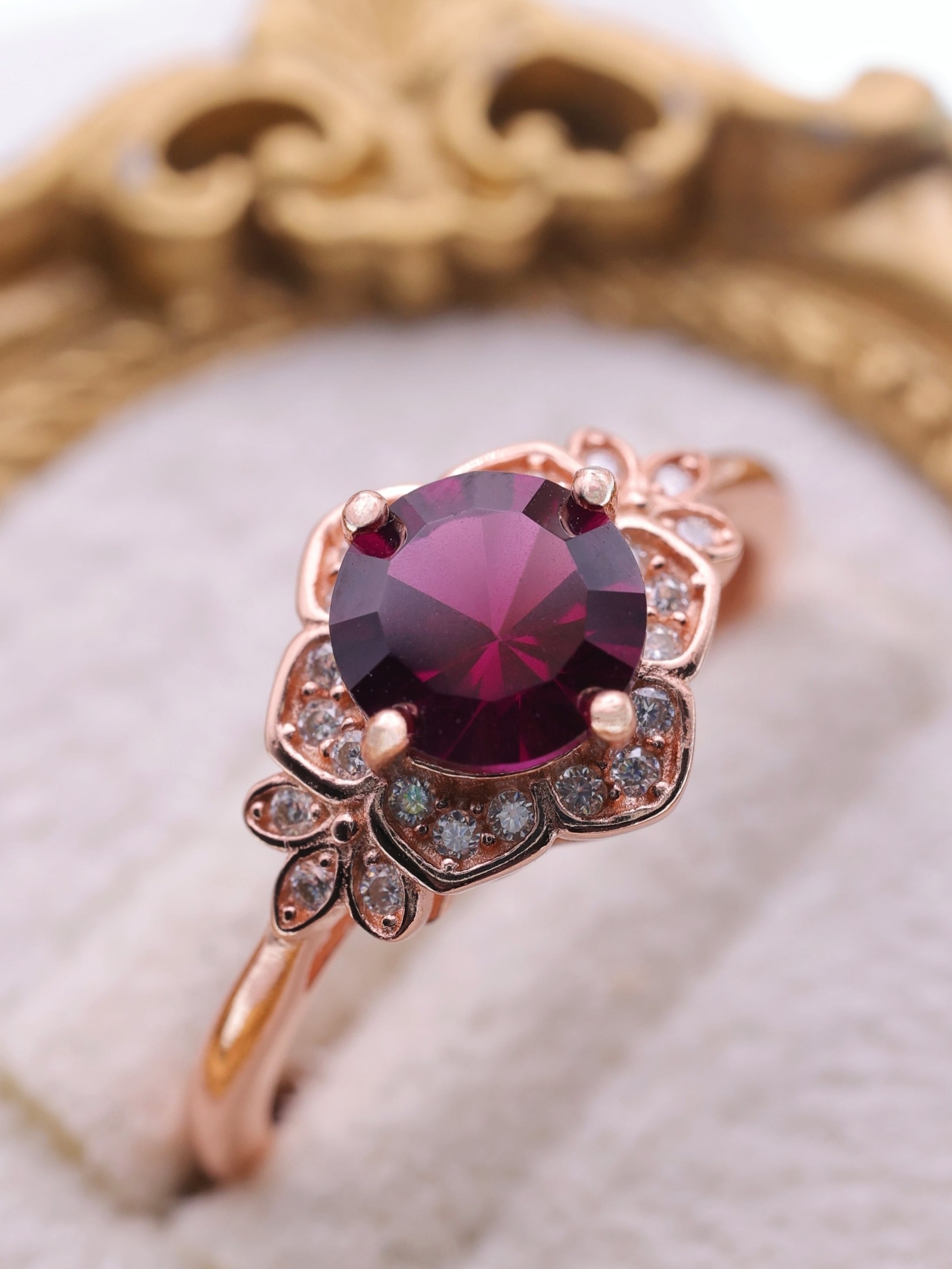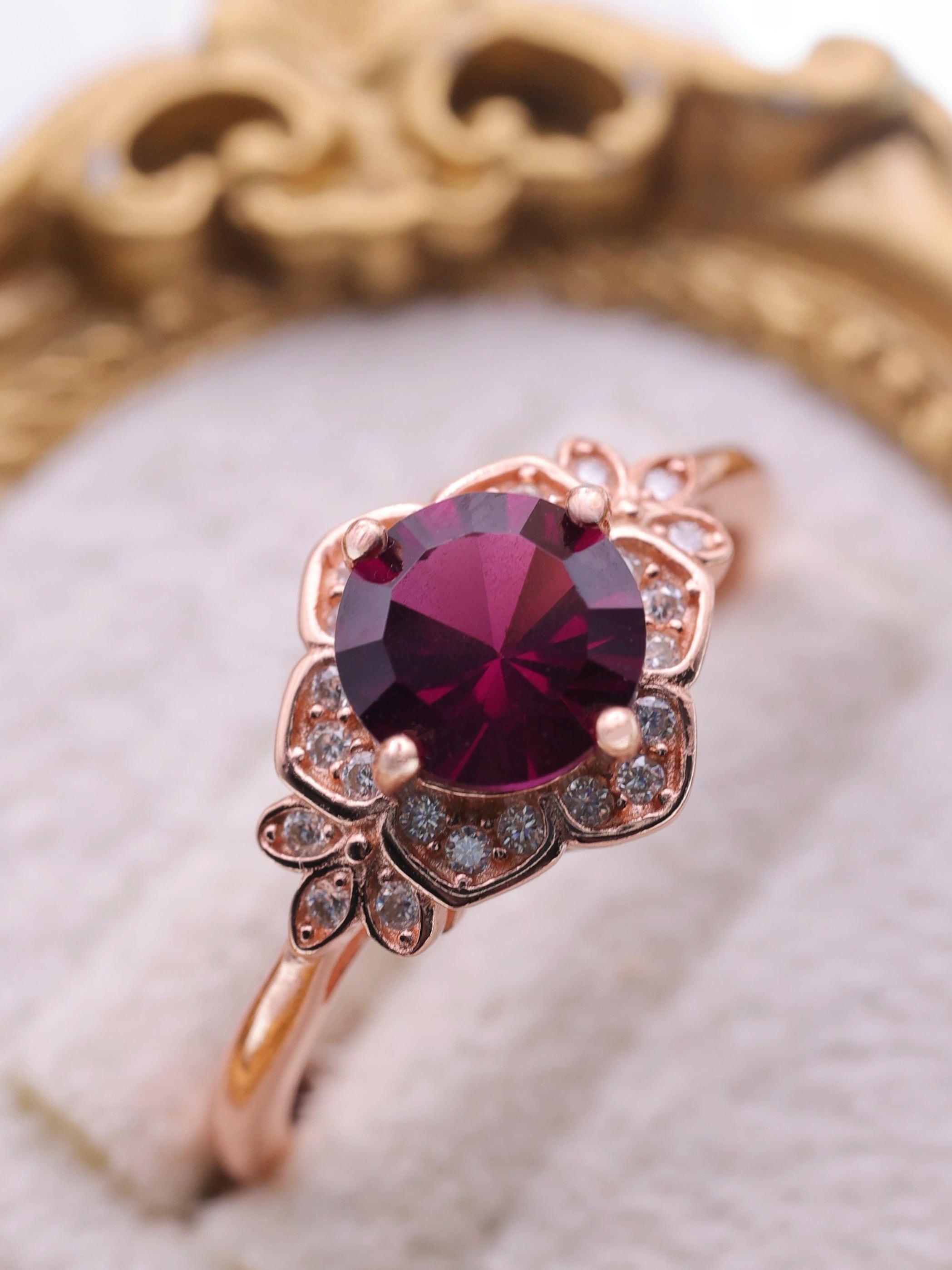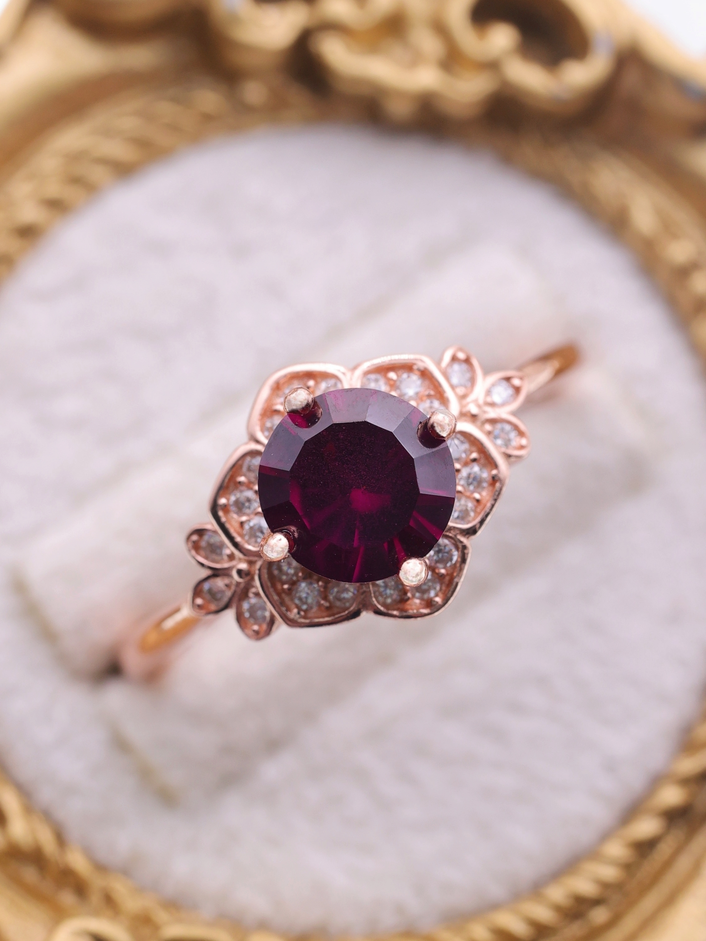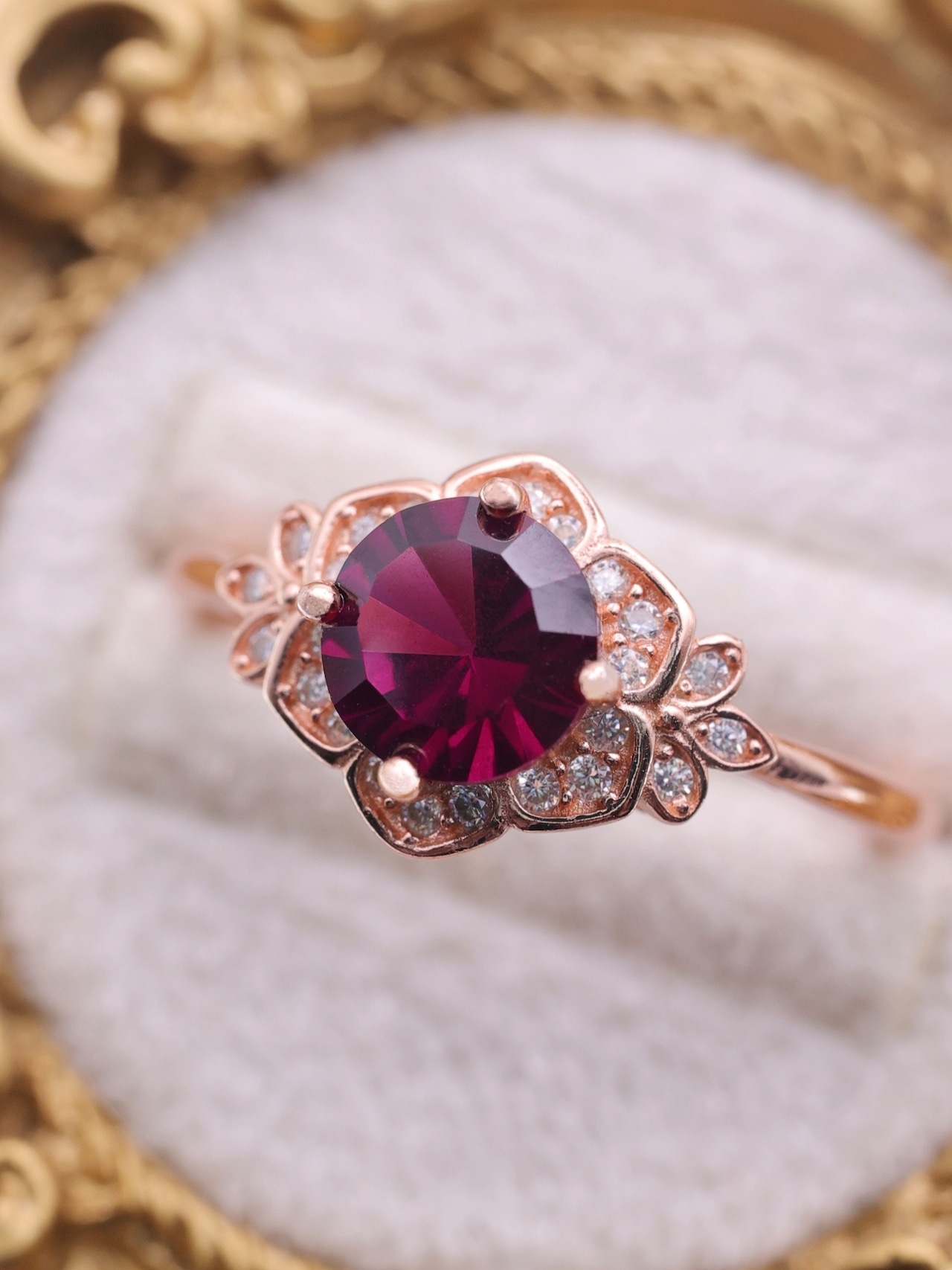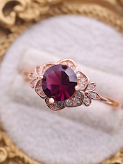 深みのあるロードライトガーネットの色調に、このコンケーブカットが加わることで、石の奥から赤紫の光が立体的に浮かび上がり、静かな中に確かな存在感を放つ表情に仕上がっています。