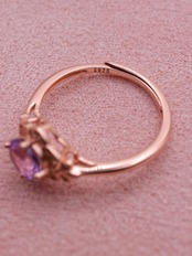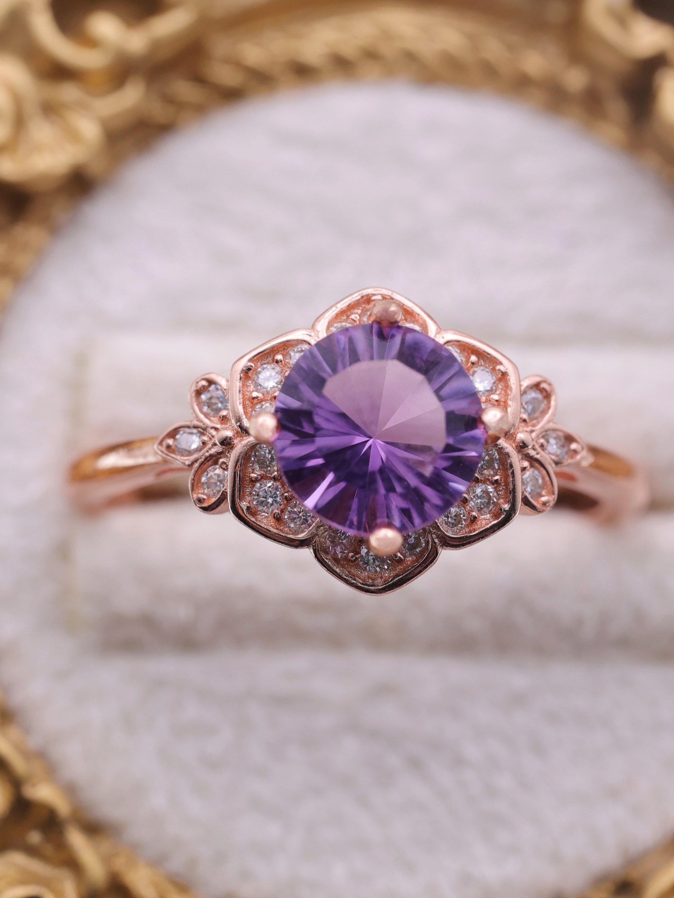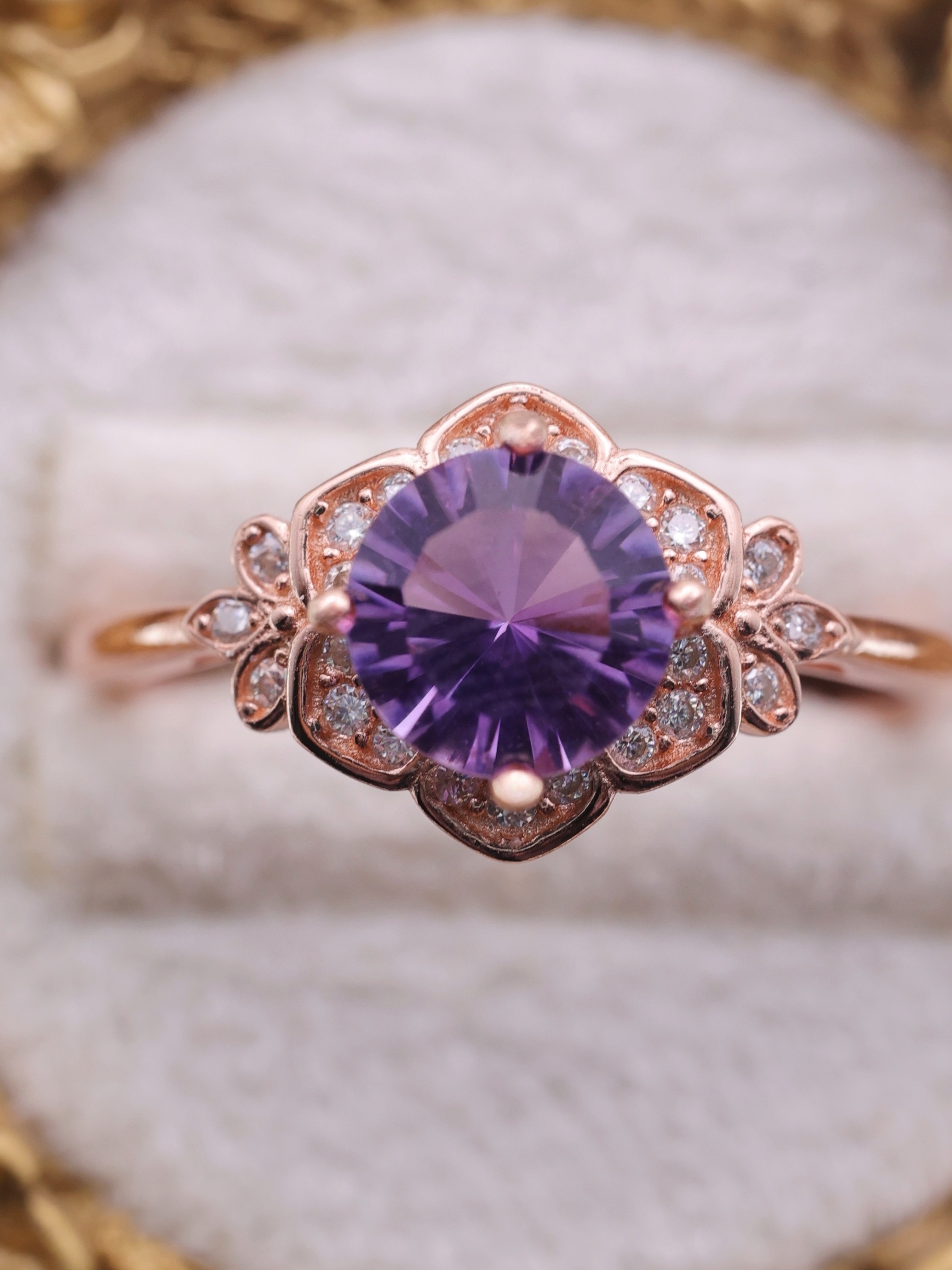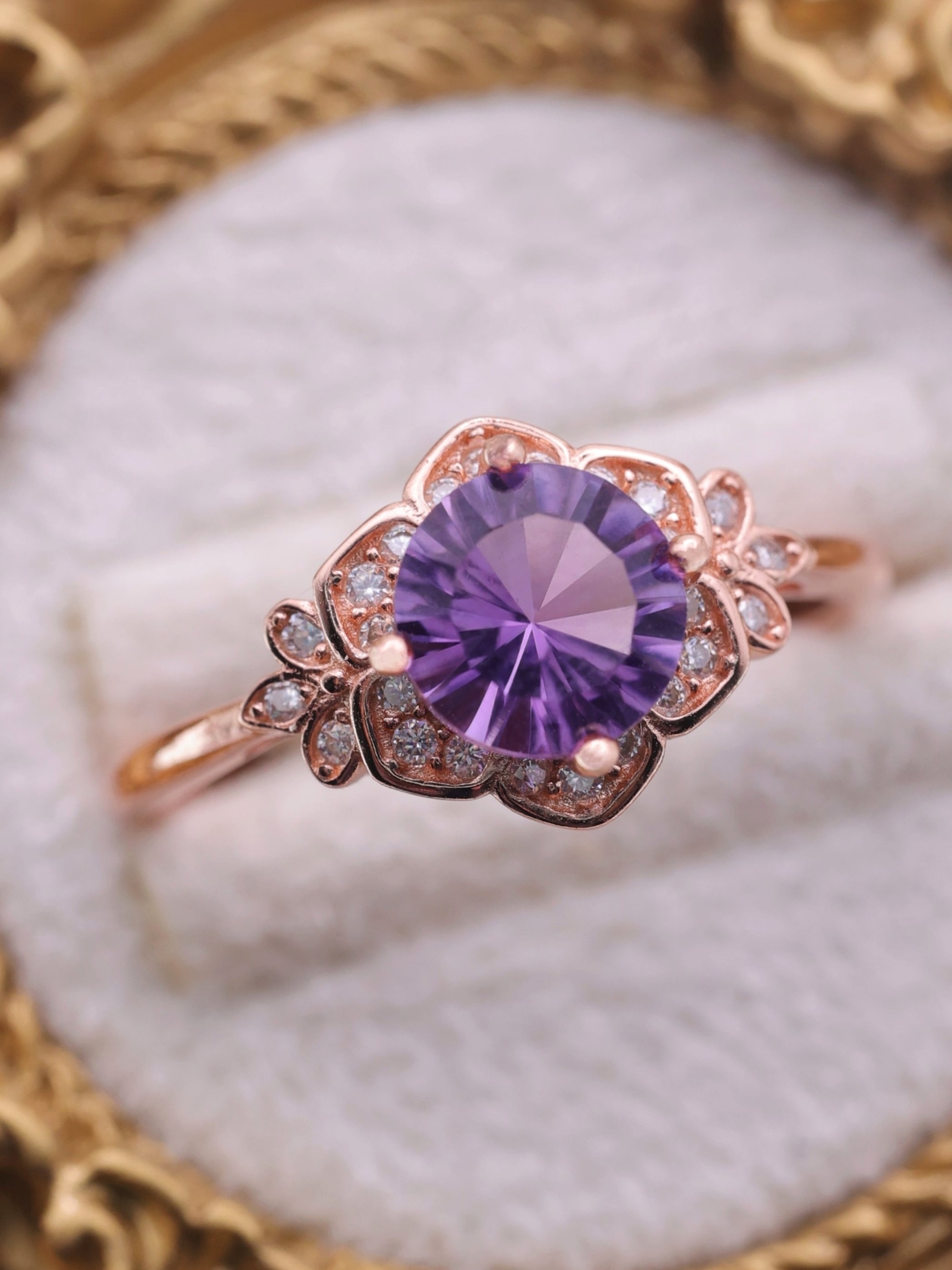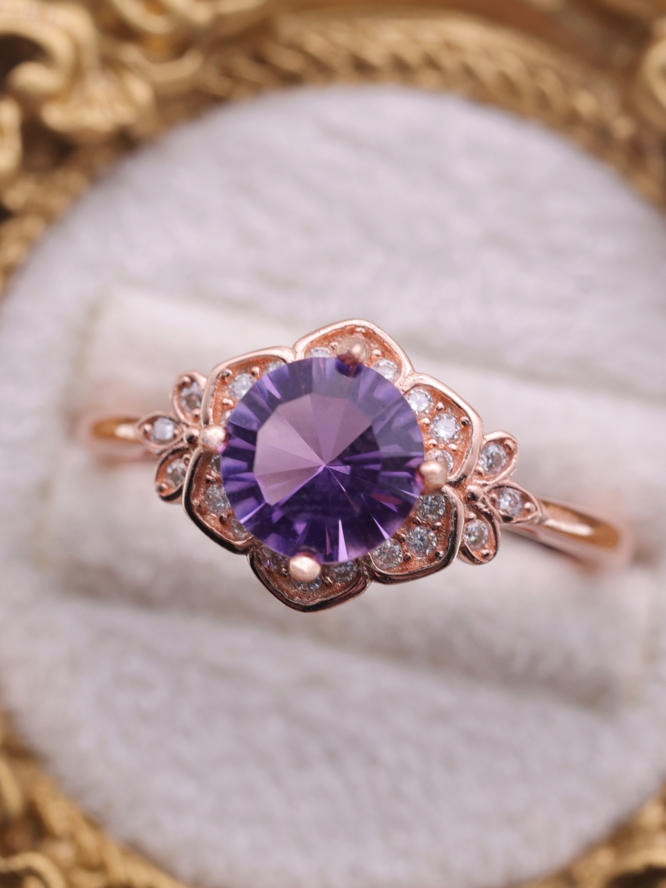 内部に曲面を描くように施されたカットが、光を多方向に反射し、アメジストの紫に奥行きと立体感をもたらしています。