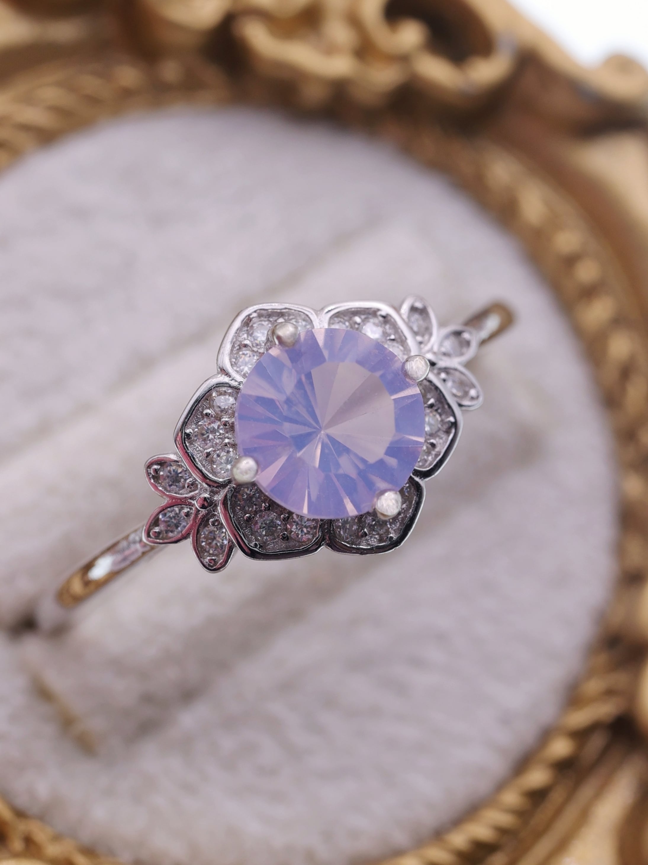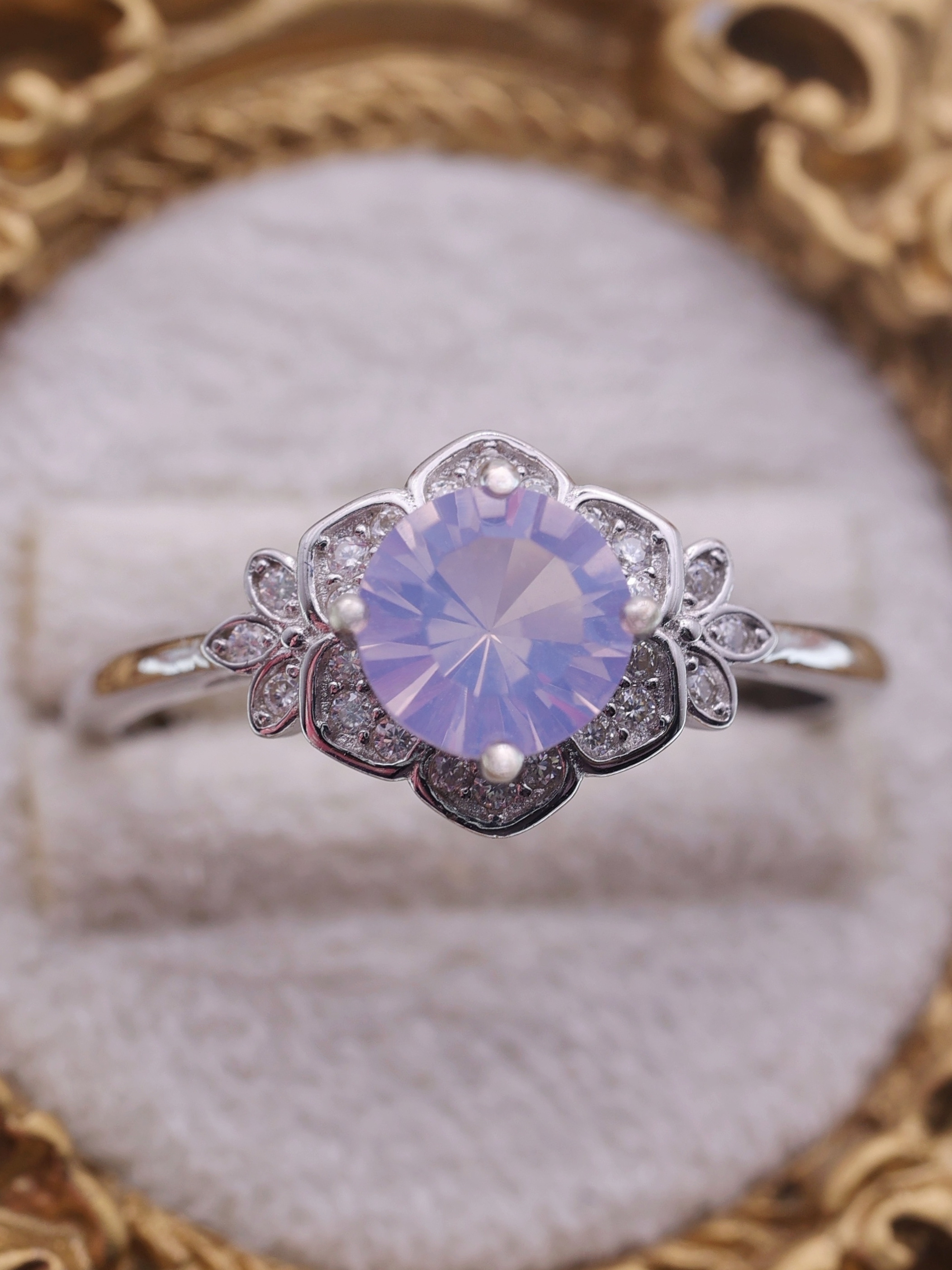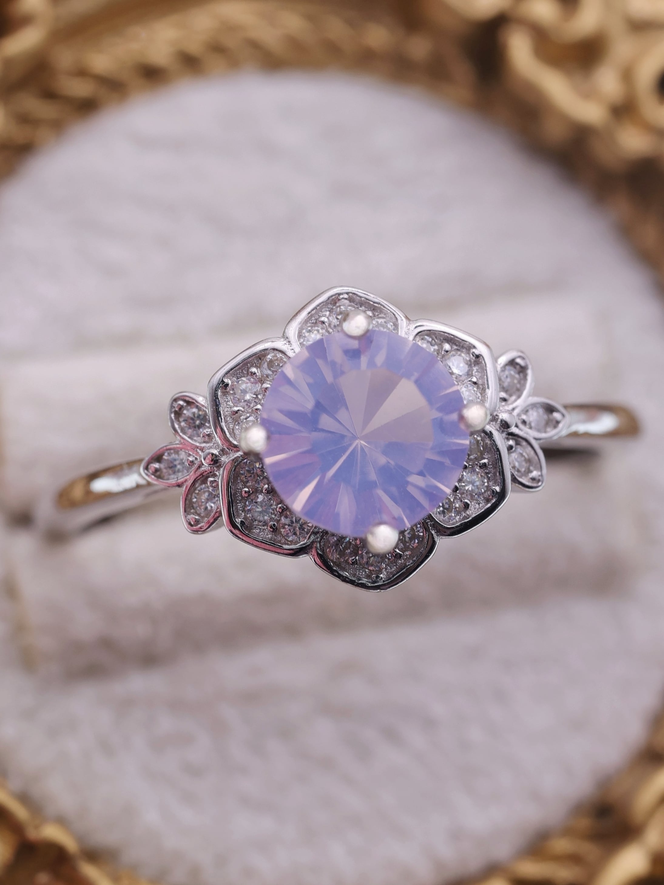 花弁を思わせる繊細なフレームは、石の柔らかさを損なわないよう、あくまで控えめに光を添える設計。
