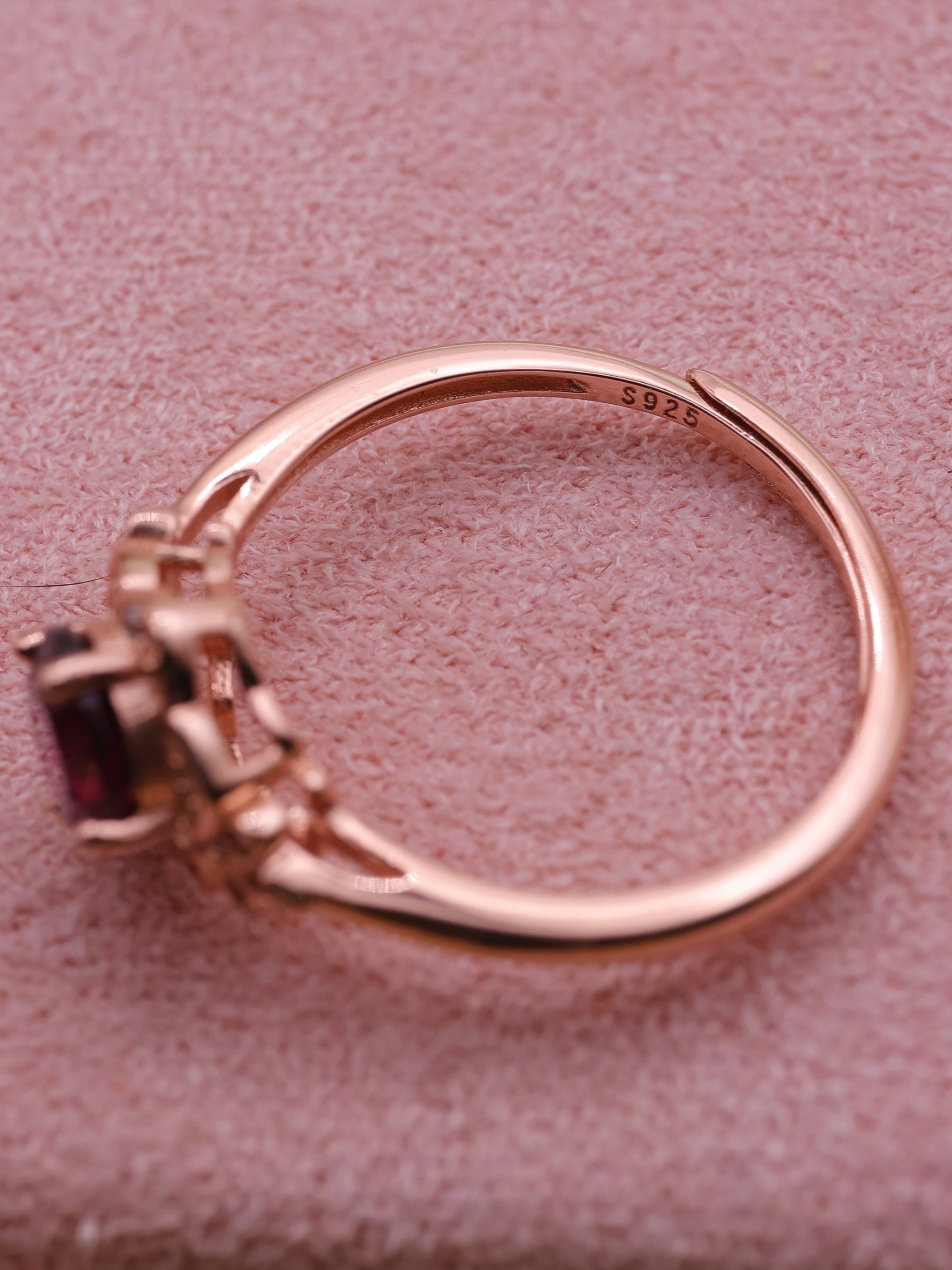 地金には、真紅のロードライトガーネットと相性の良いローズゴールドカラーを採用。