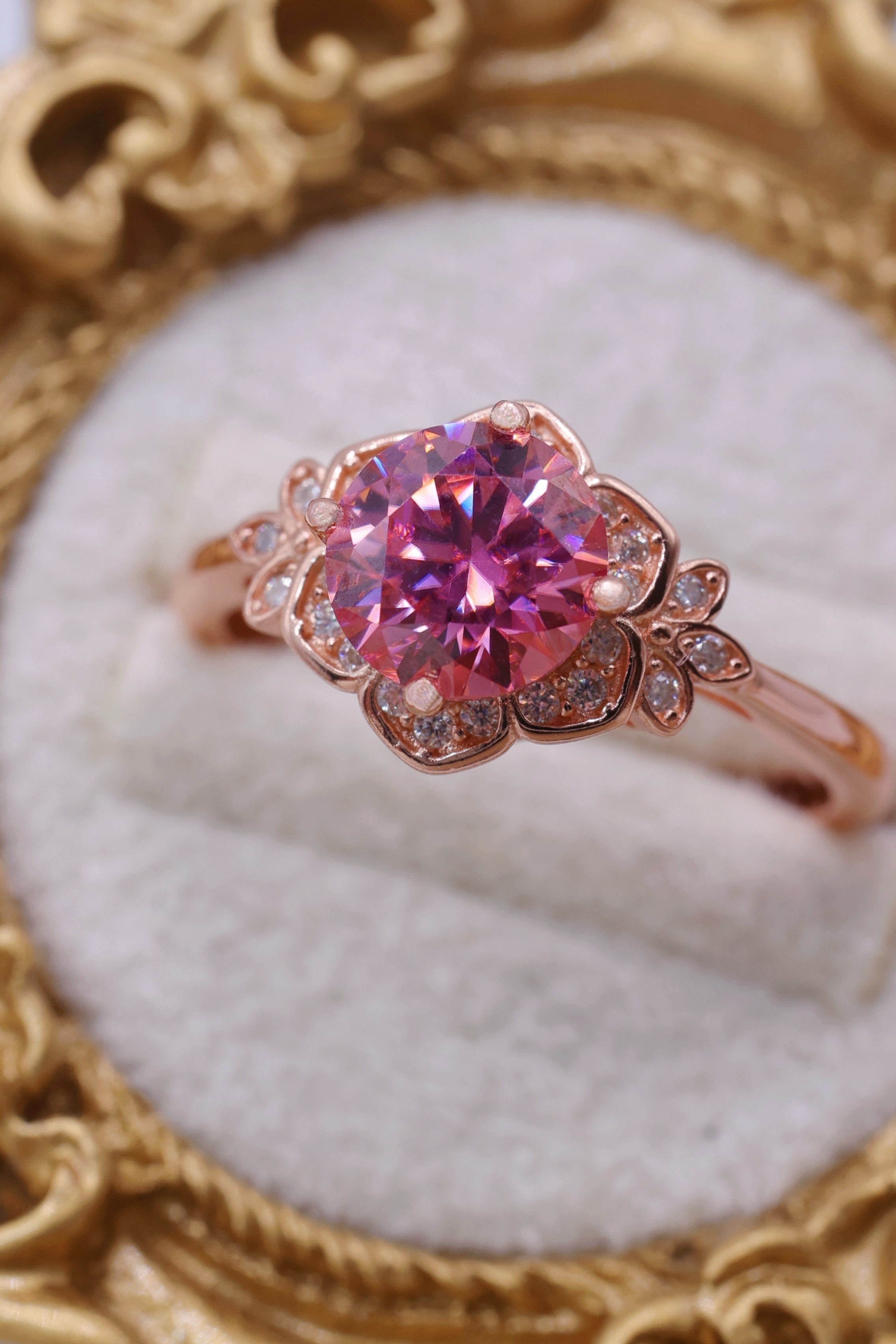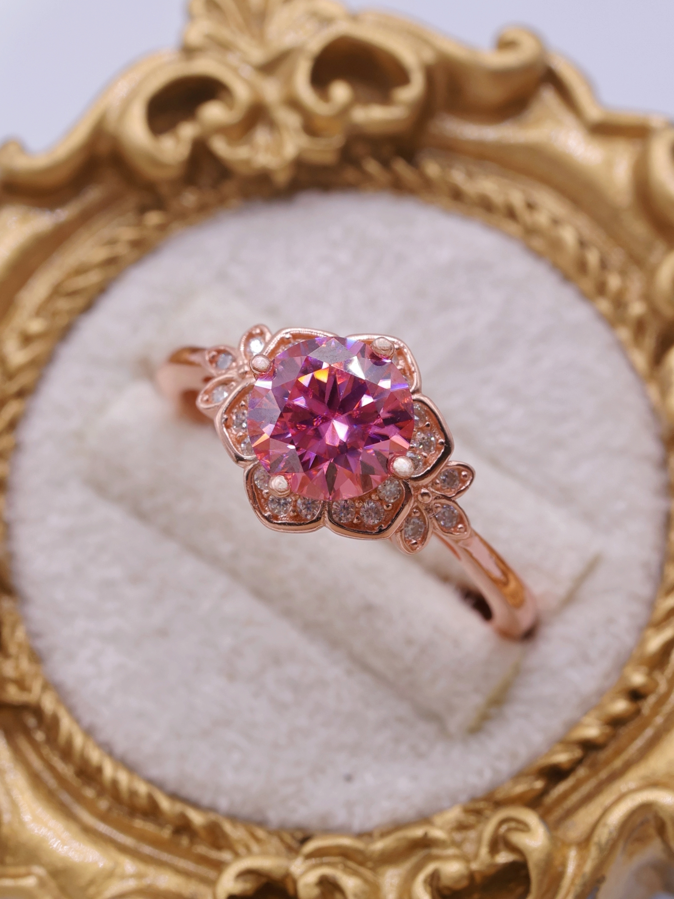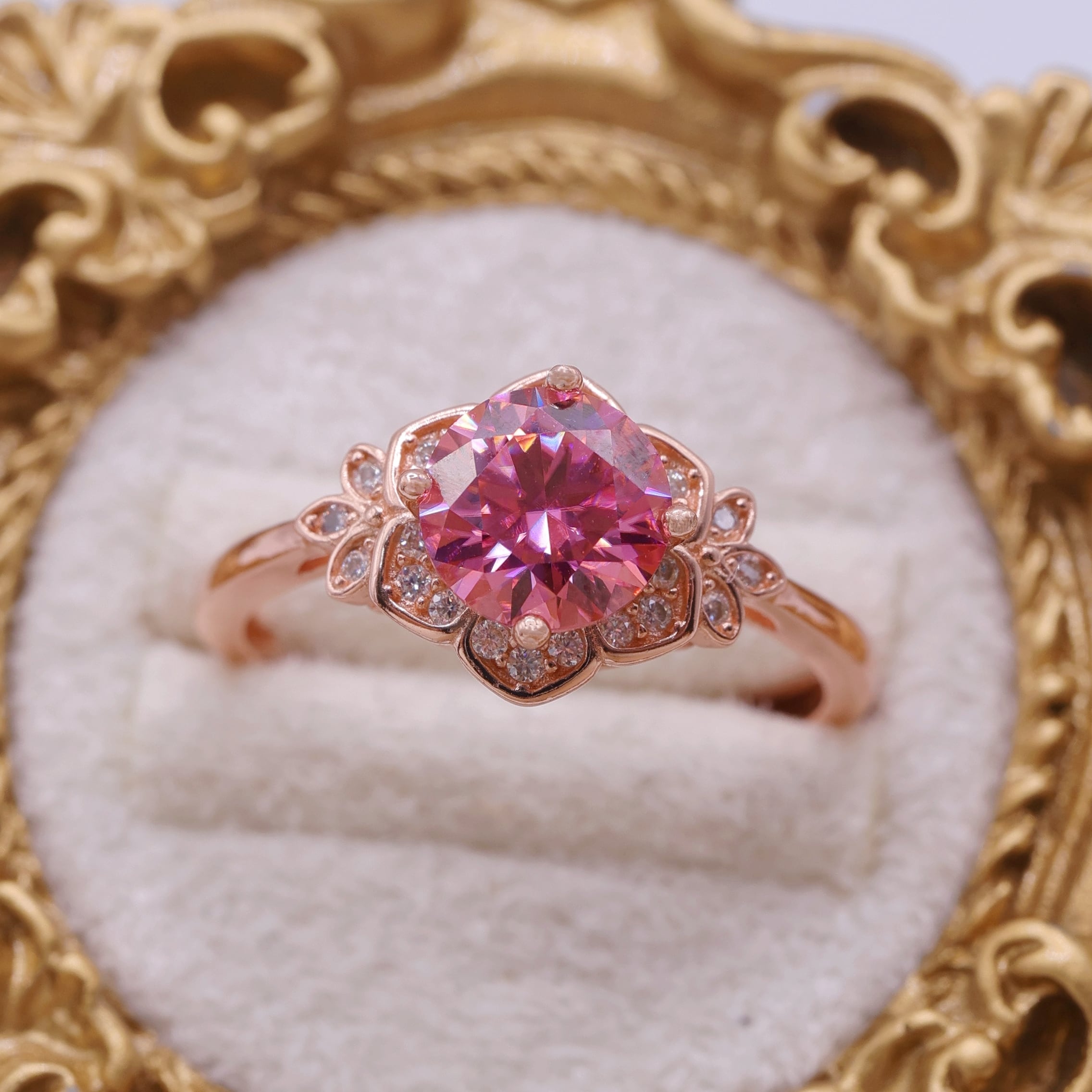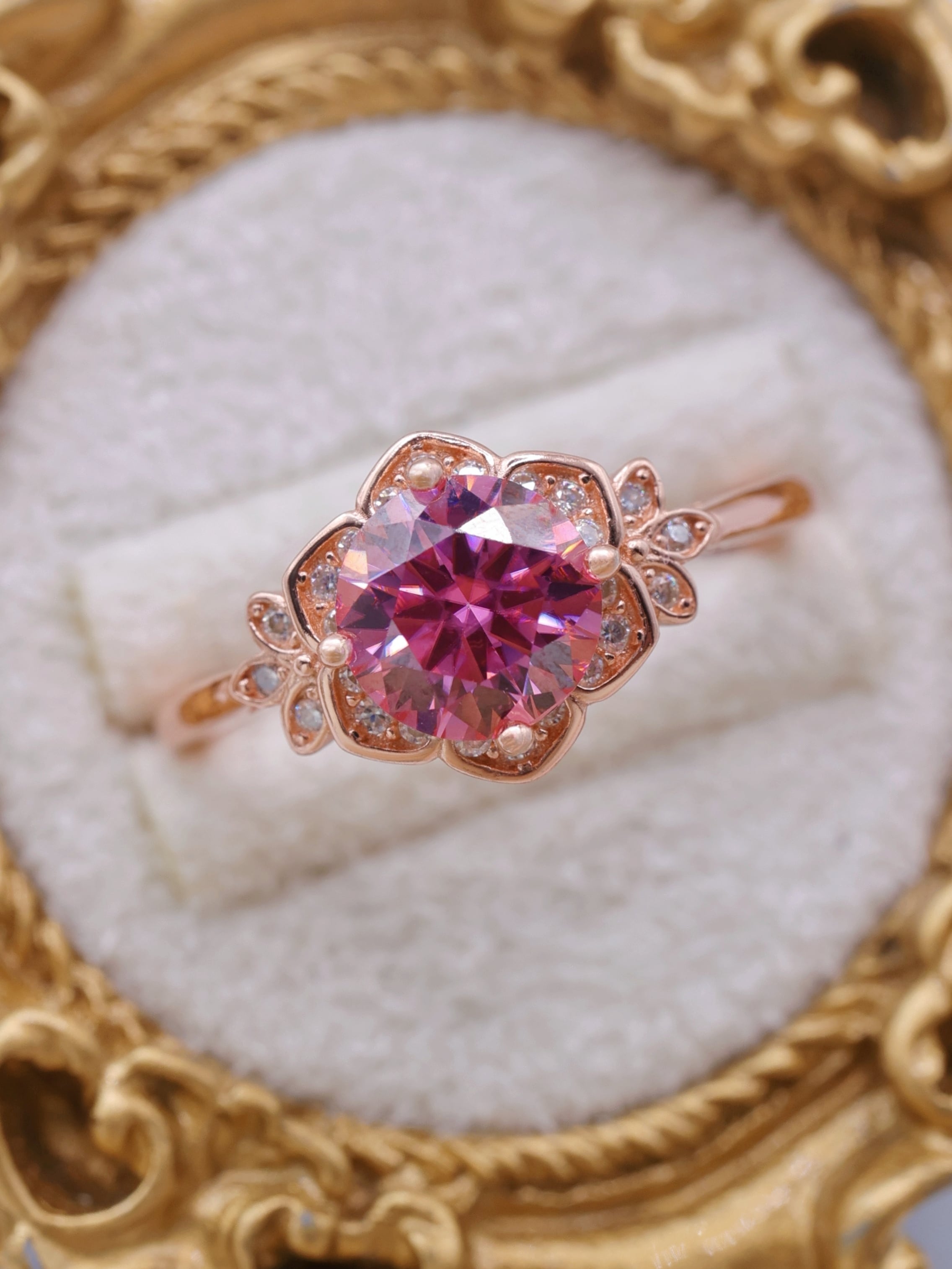 花弁部分には、メレ石としてモアッサナイトをセッティングし、主石のピンクの輝きを受け止めるように、繊細な煌めきを添えています。