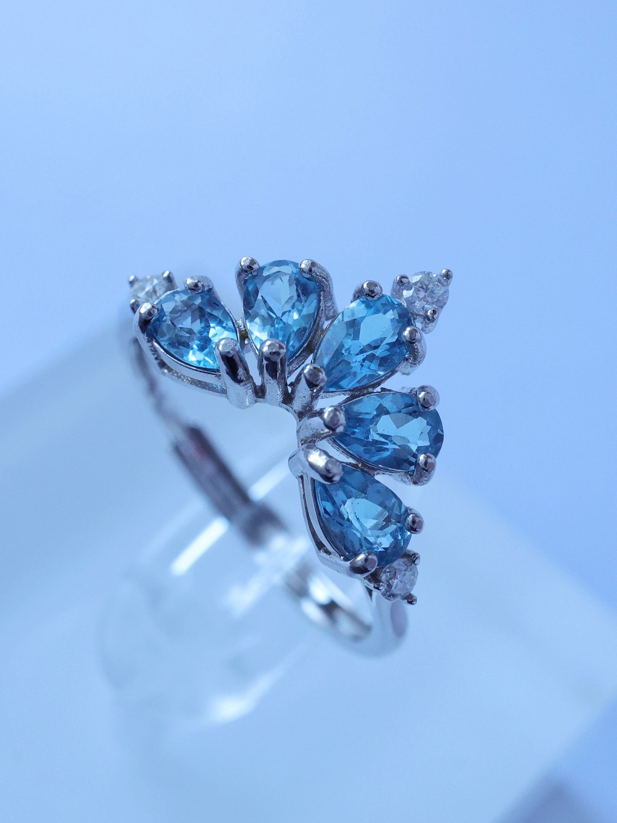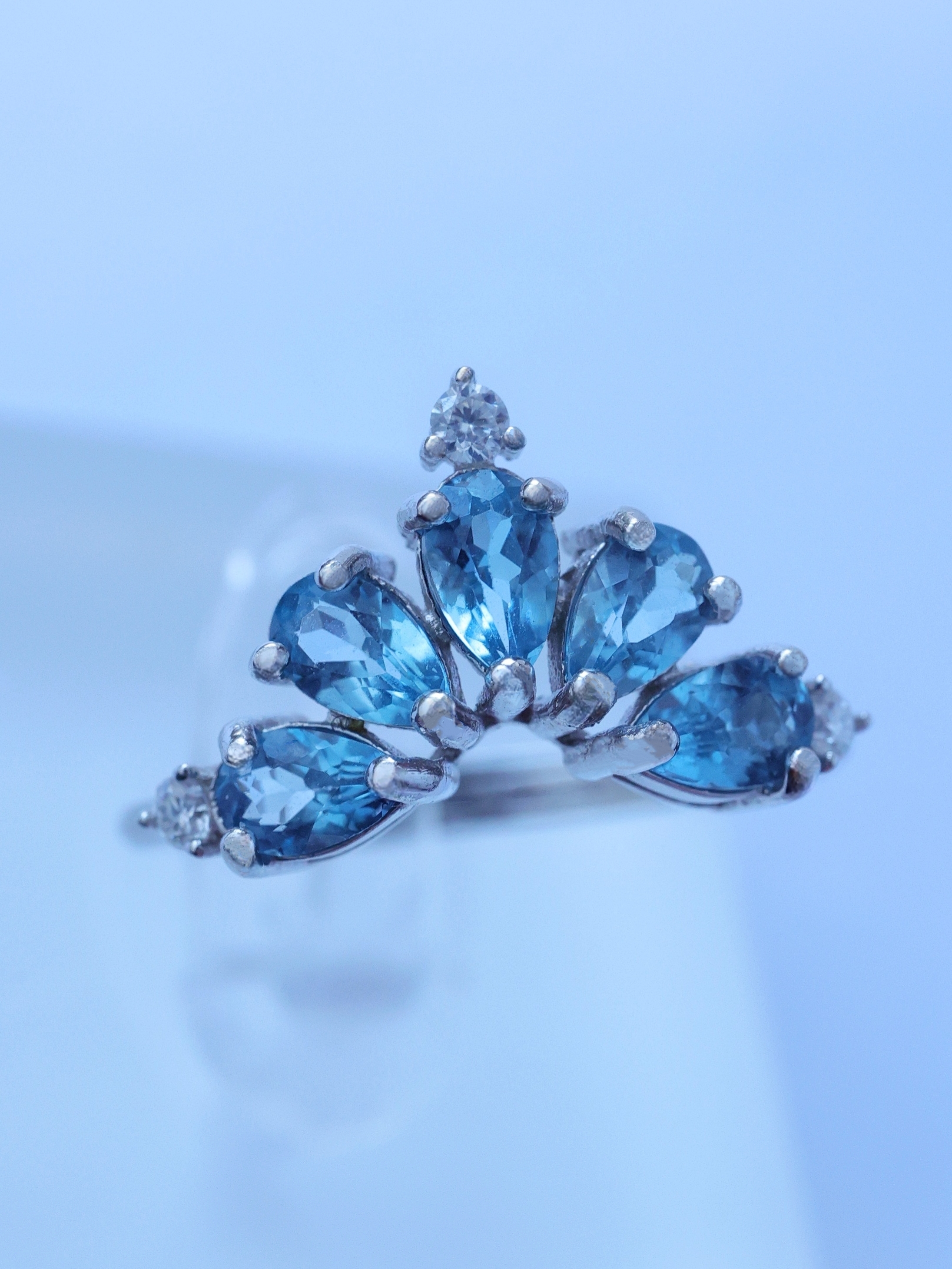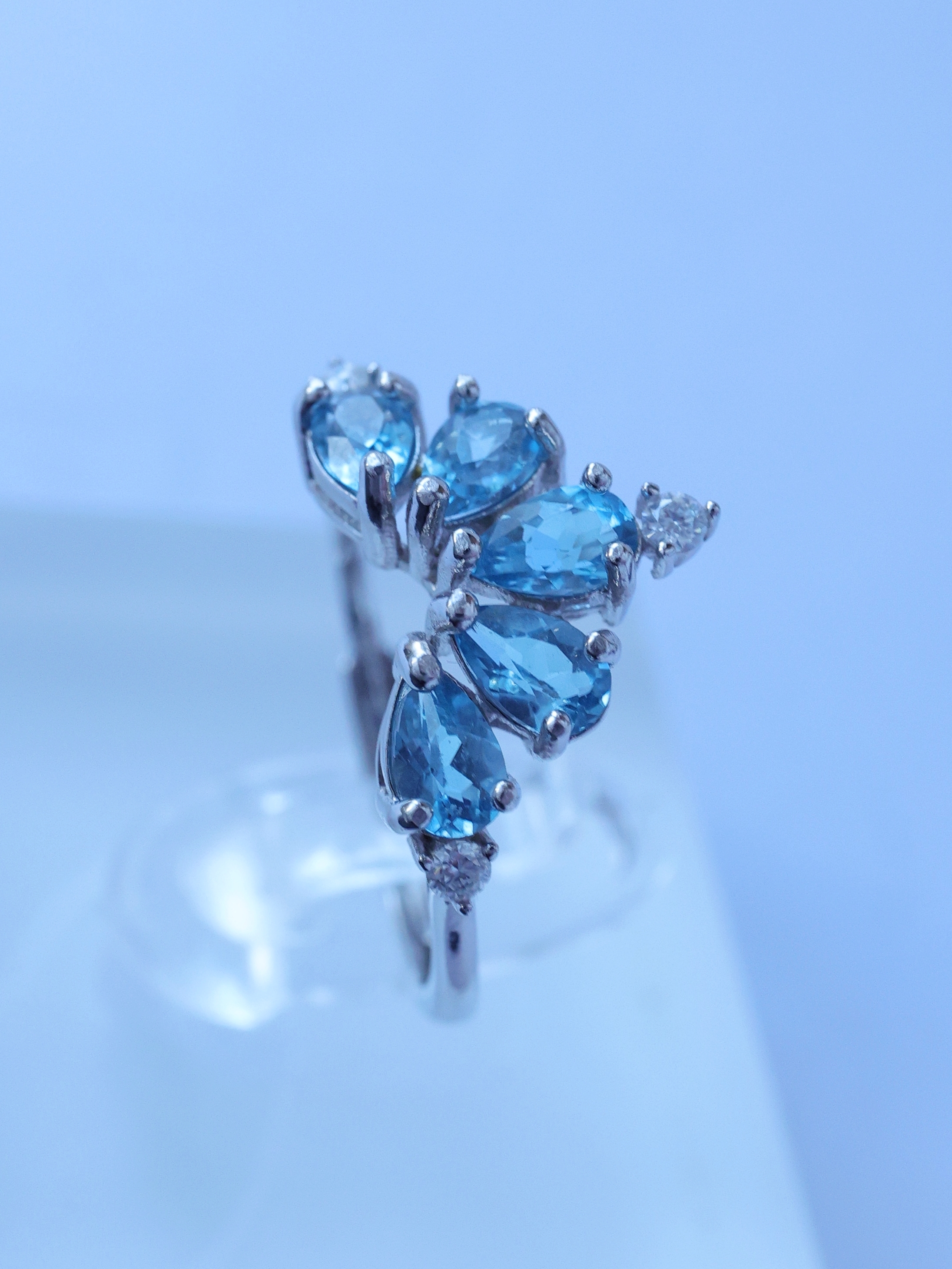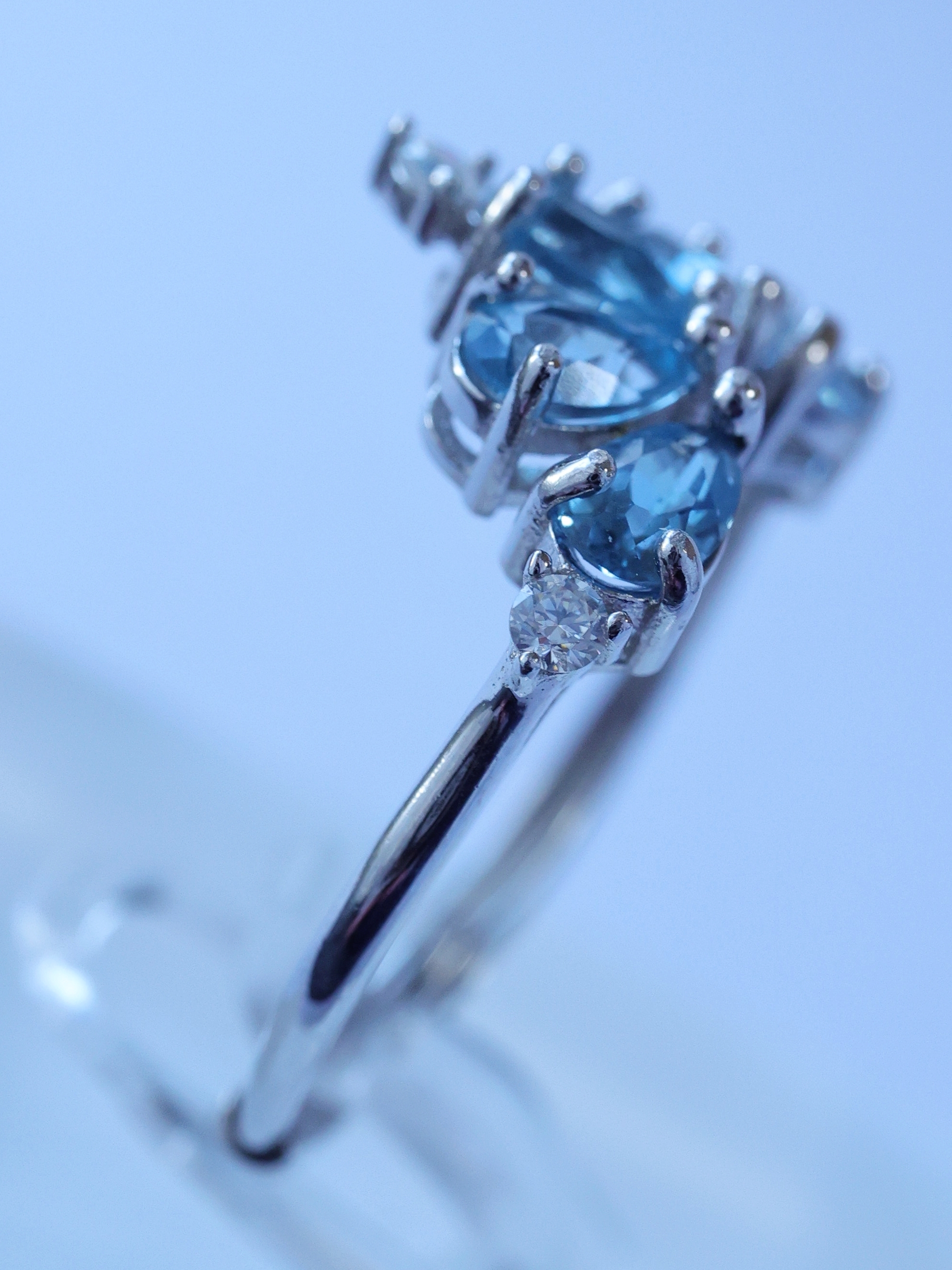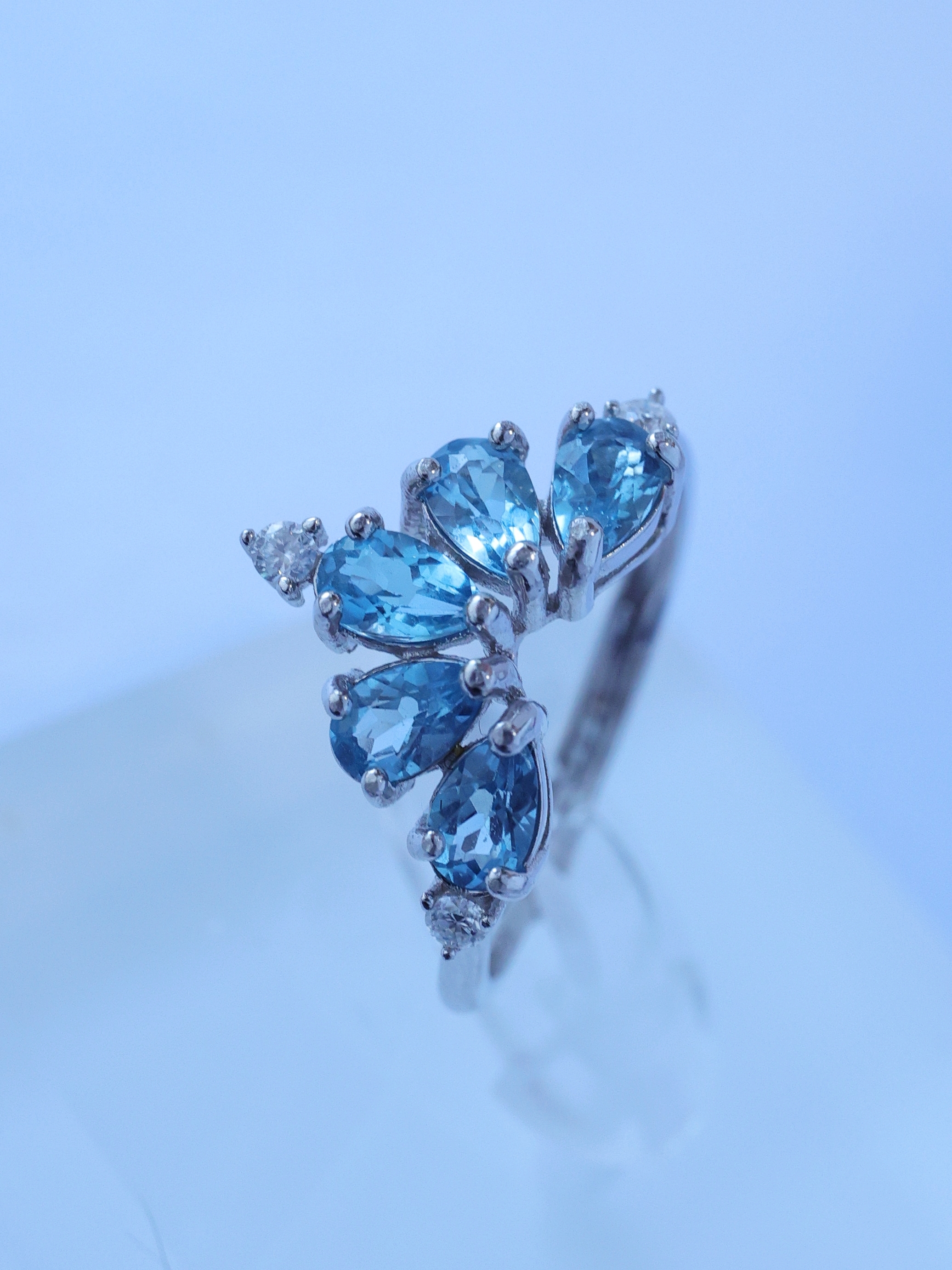 スイスブルートパーズ特有のクリアで冴えたブルーは、指元に凛とした華やかさを添えてくれます。