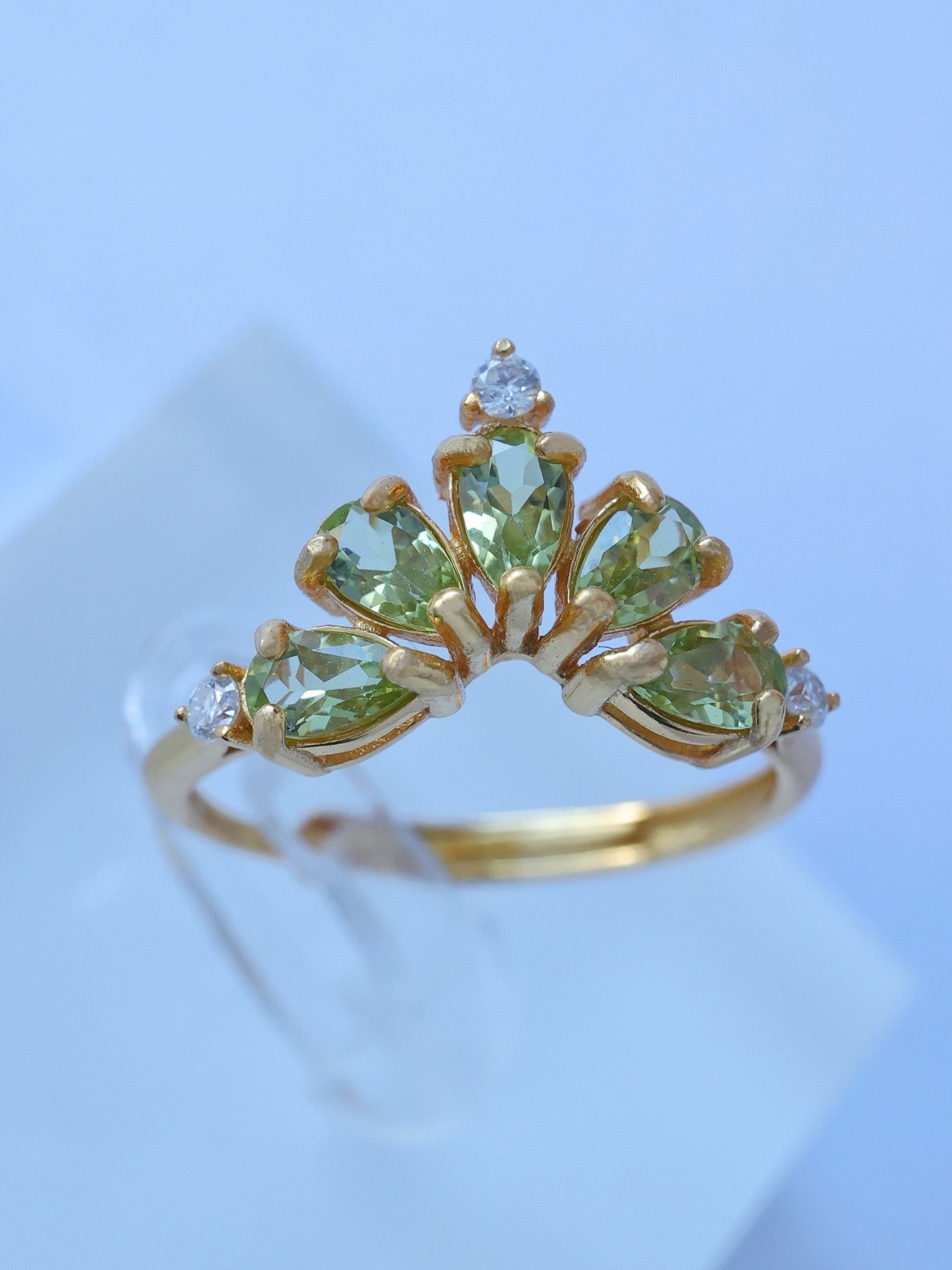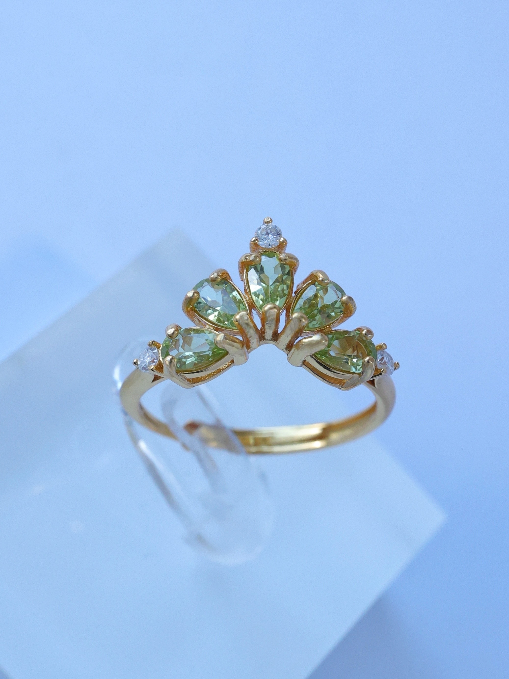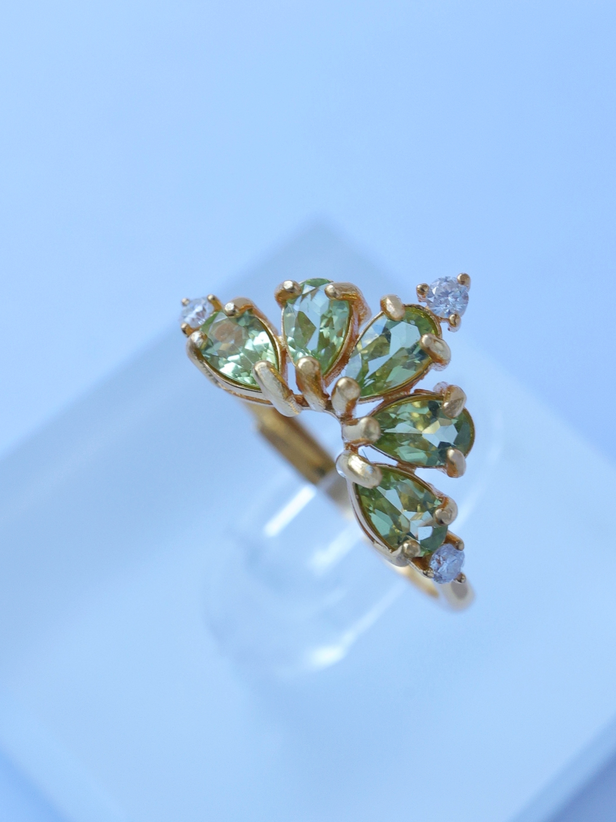 ティアドロップカットのルースを王冠のように扇状に配し、光を受けるたびに軽やかで生き生きとした輝きを指元に映し出します。