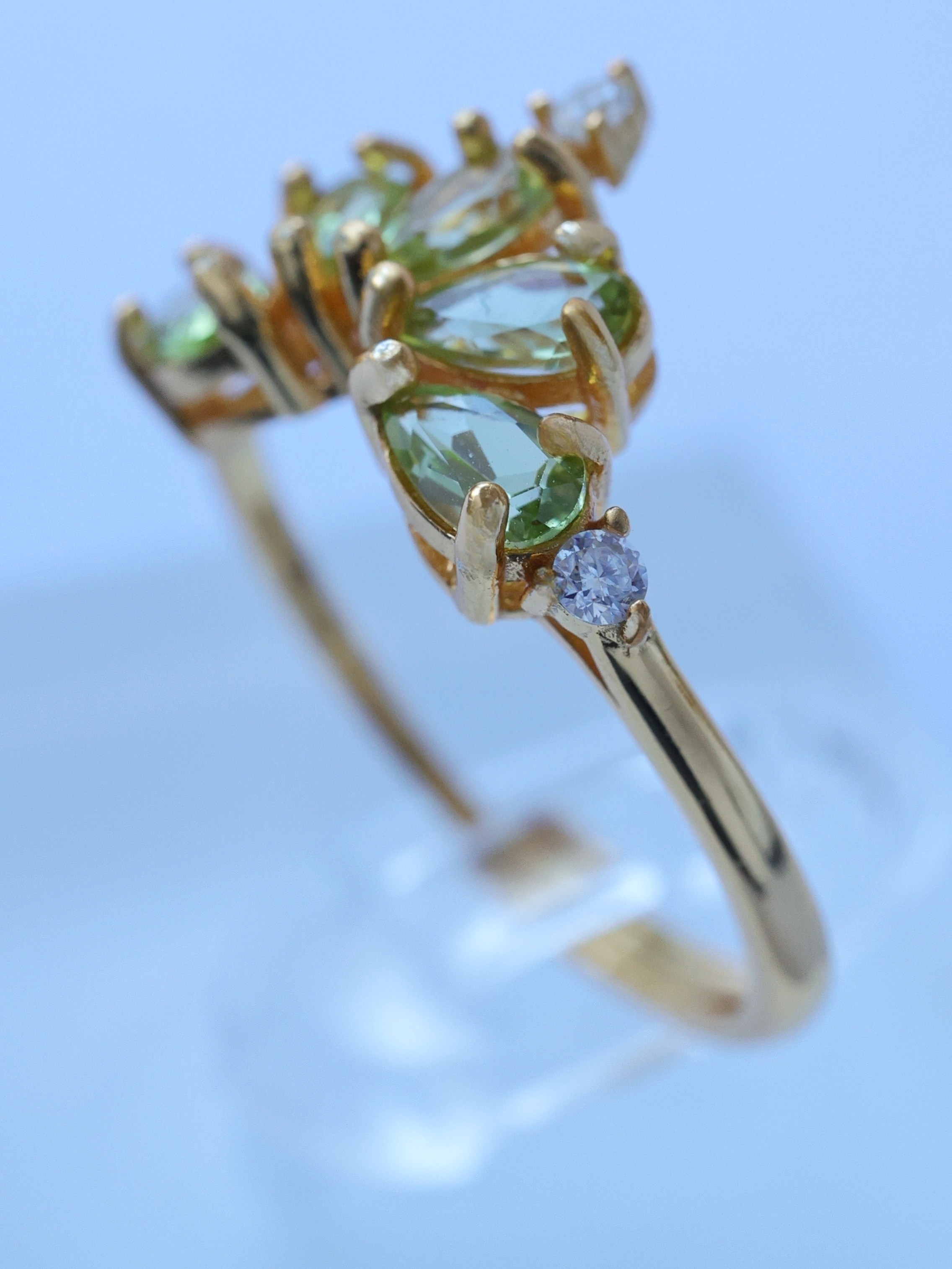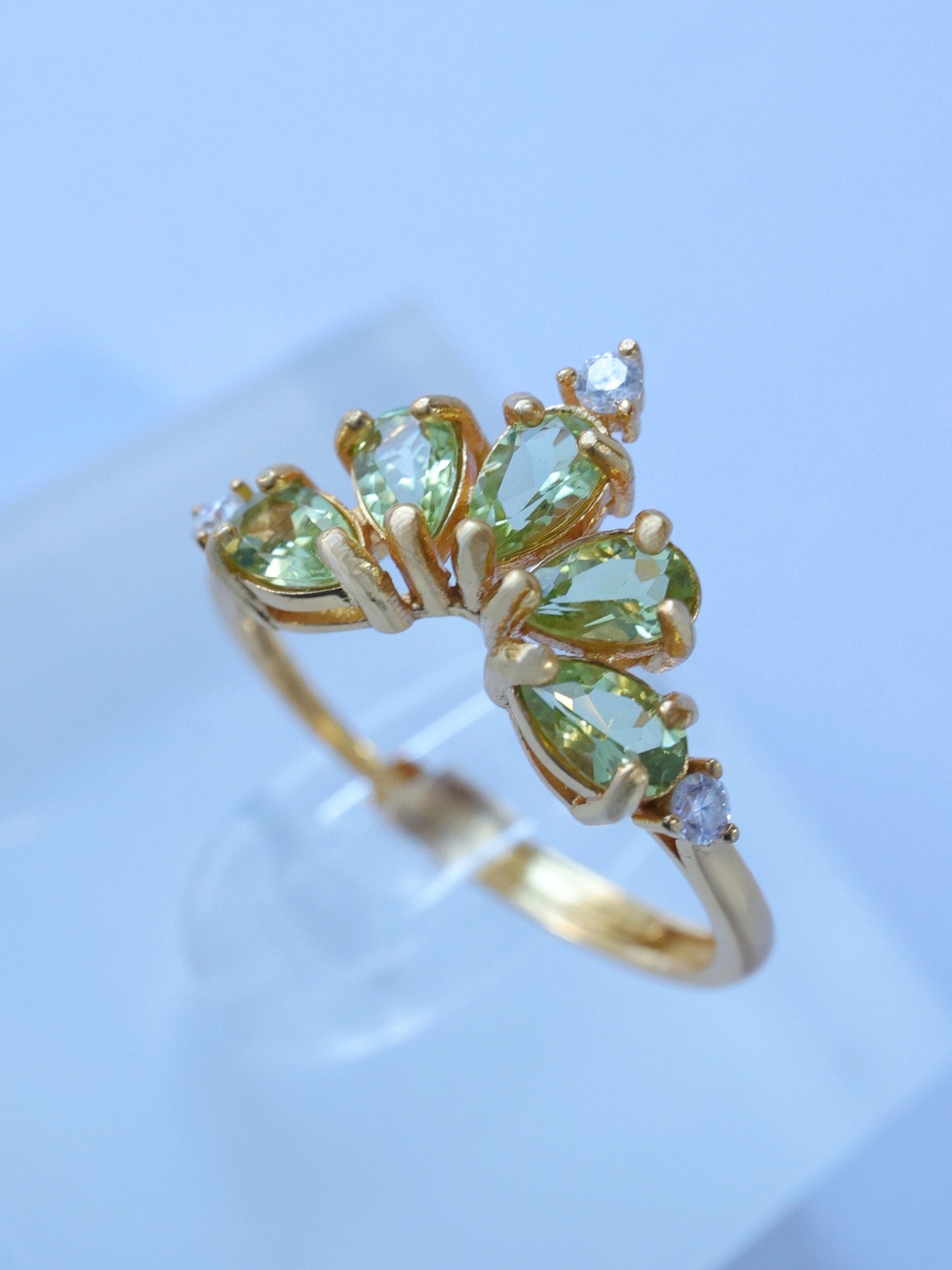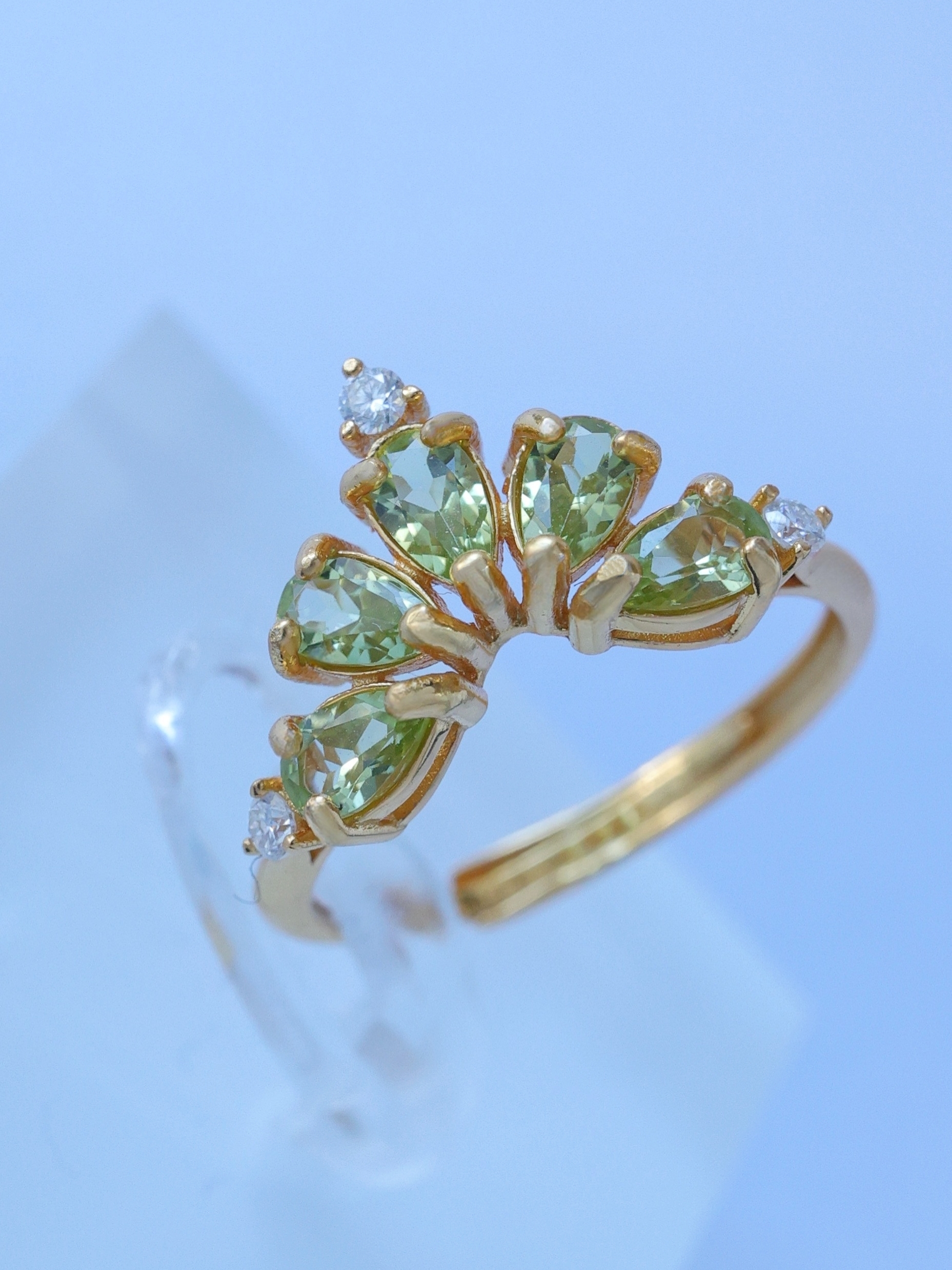 ティアドロップカットのルースを王冠のように扇状に配し、光を受けるたびに軽やかで生き生きとした輝きを指元に映し出します。