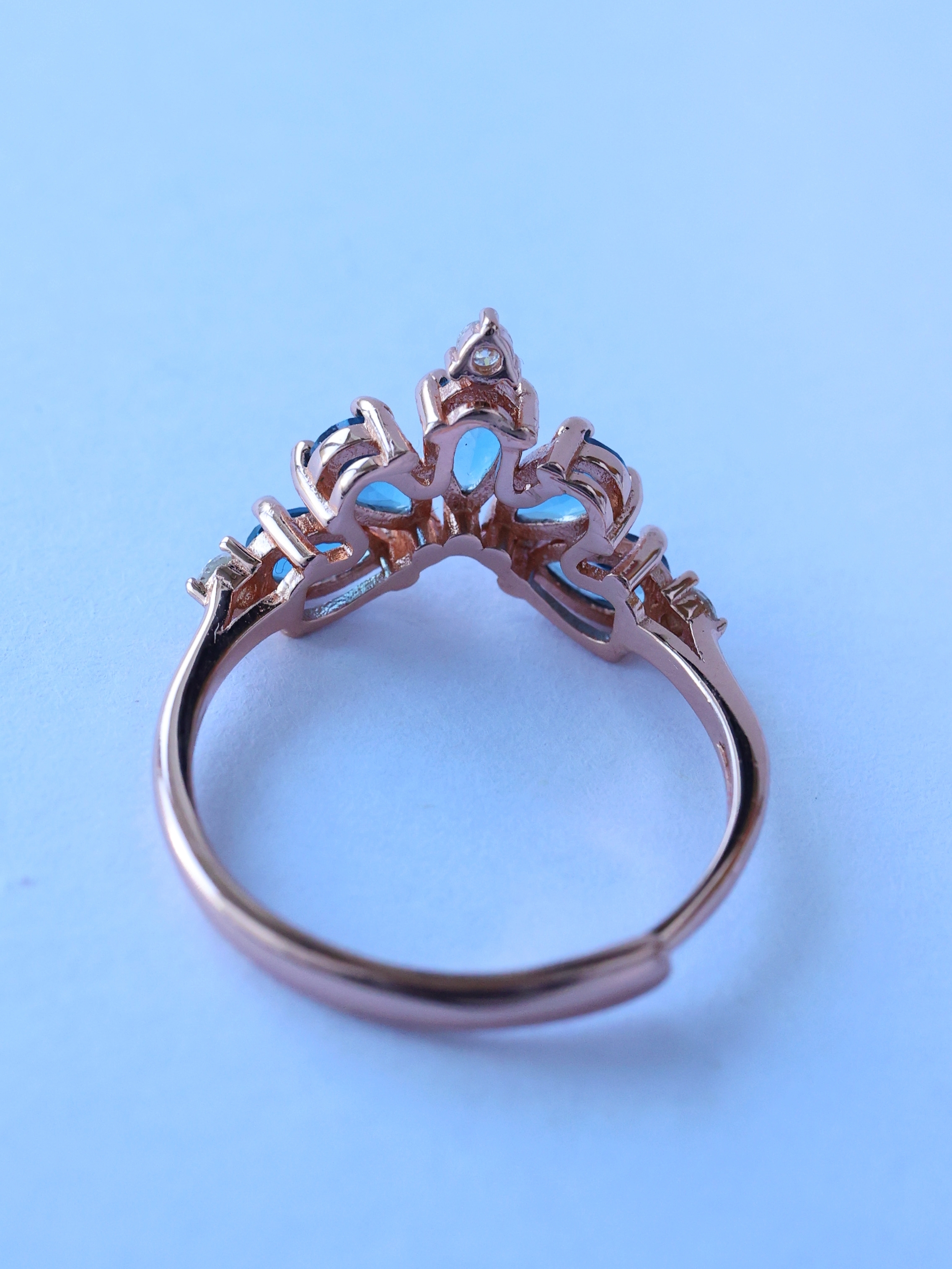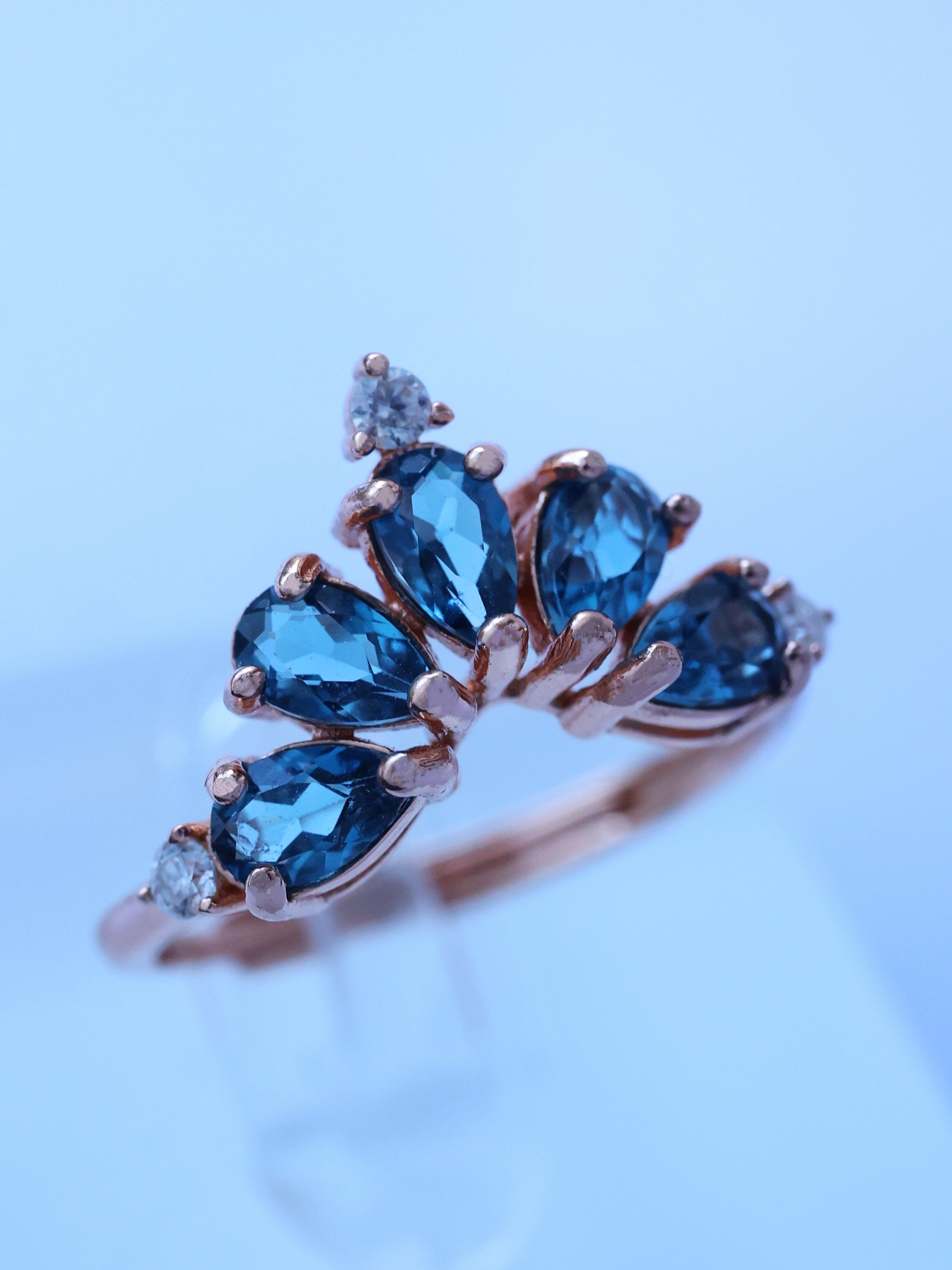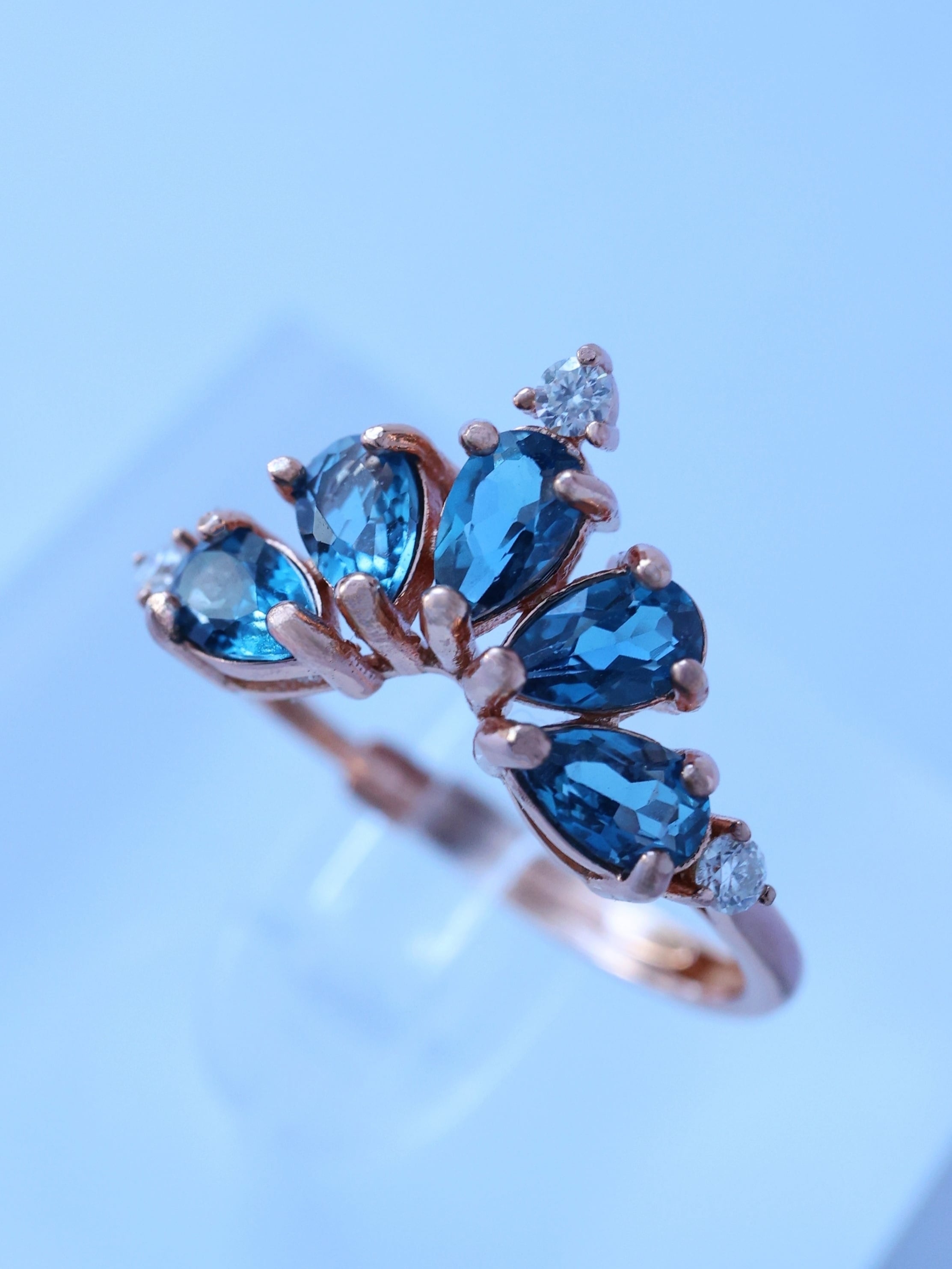 ペアシェイプカットのルースを王冠状に配することで、夜空のように奥行きのあるブルーに、立体感と品格を添えています。