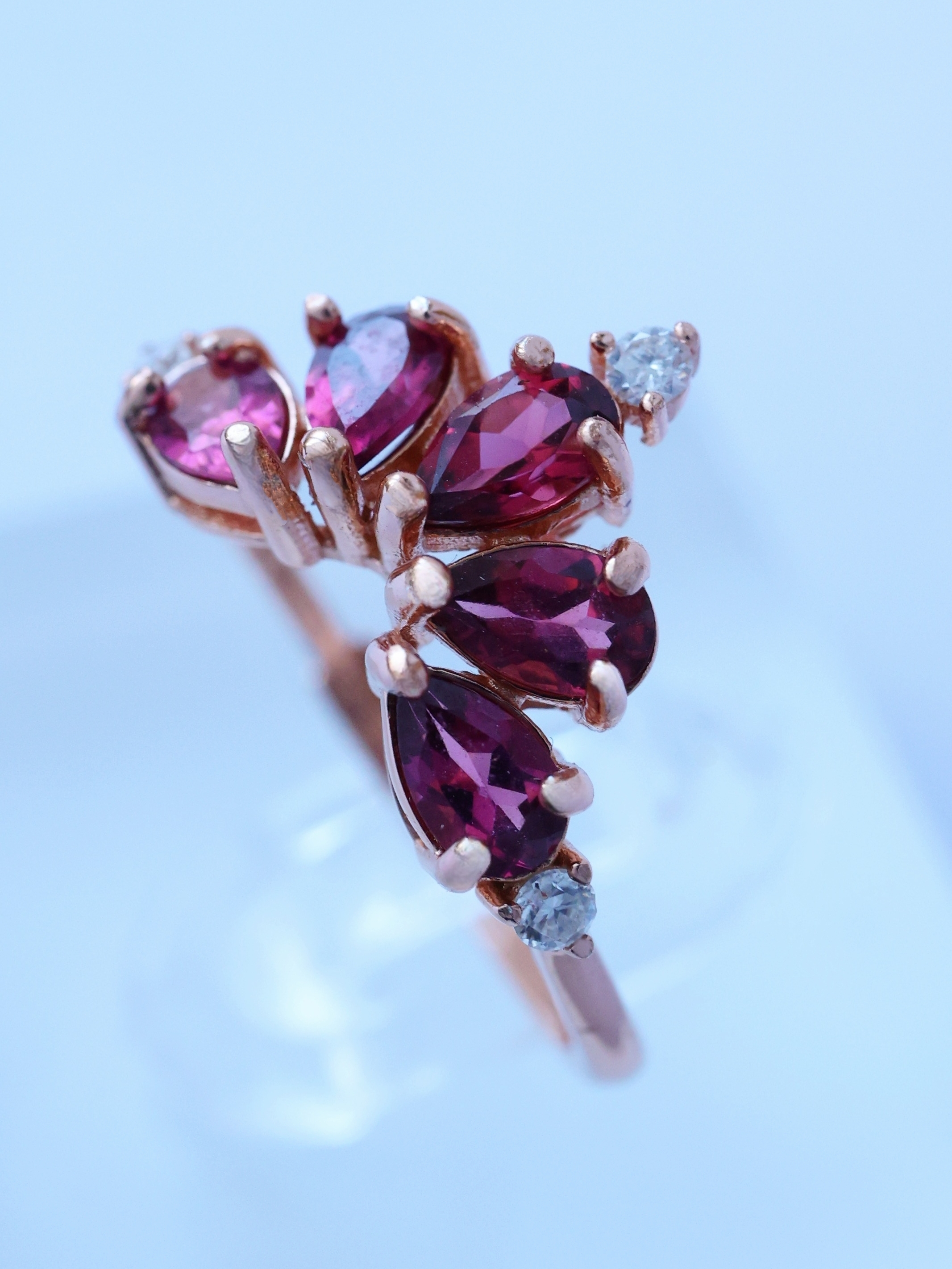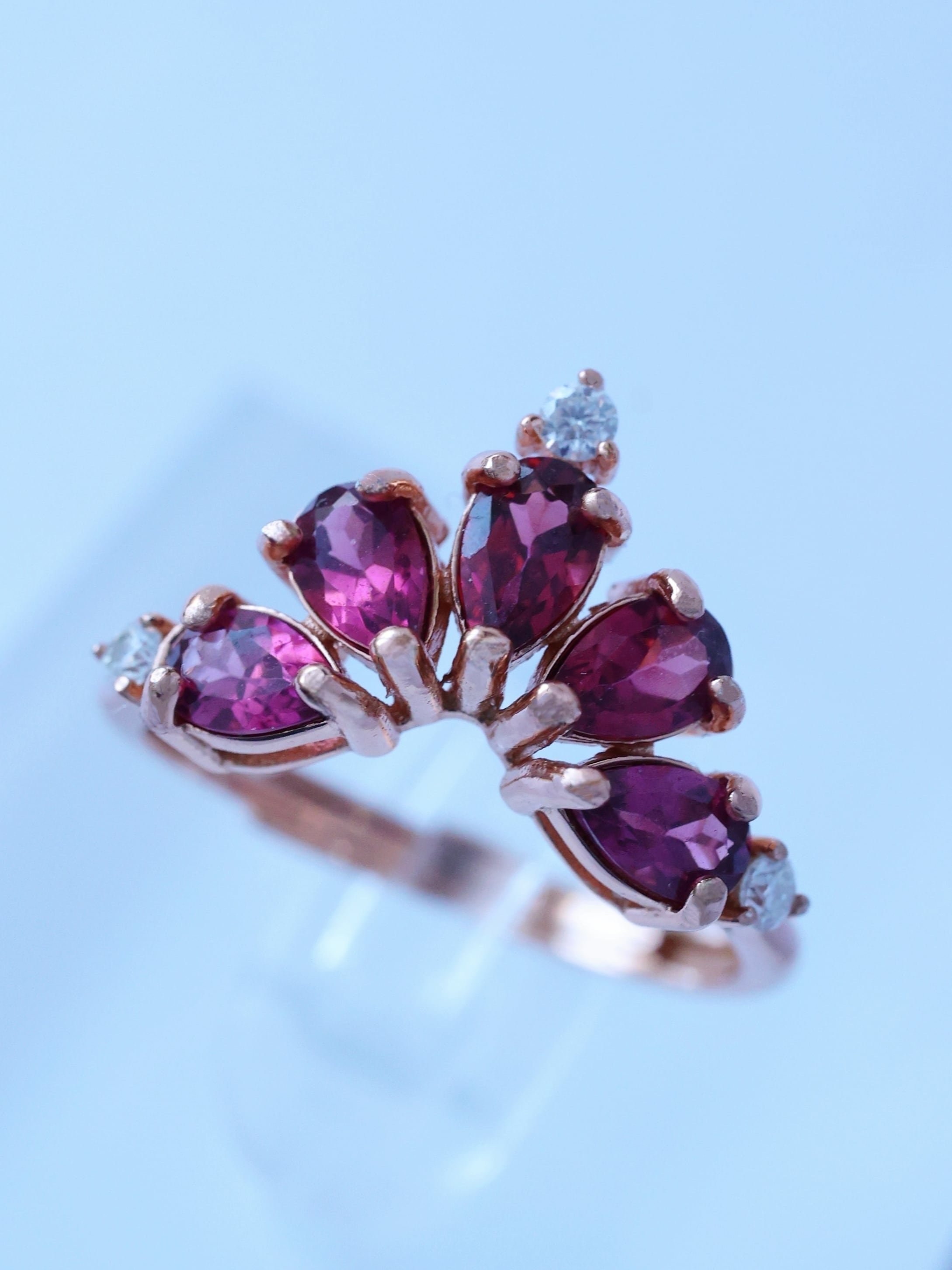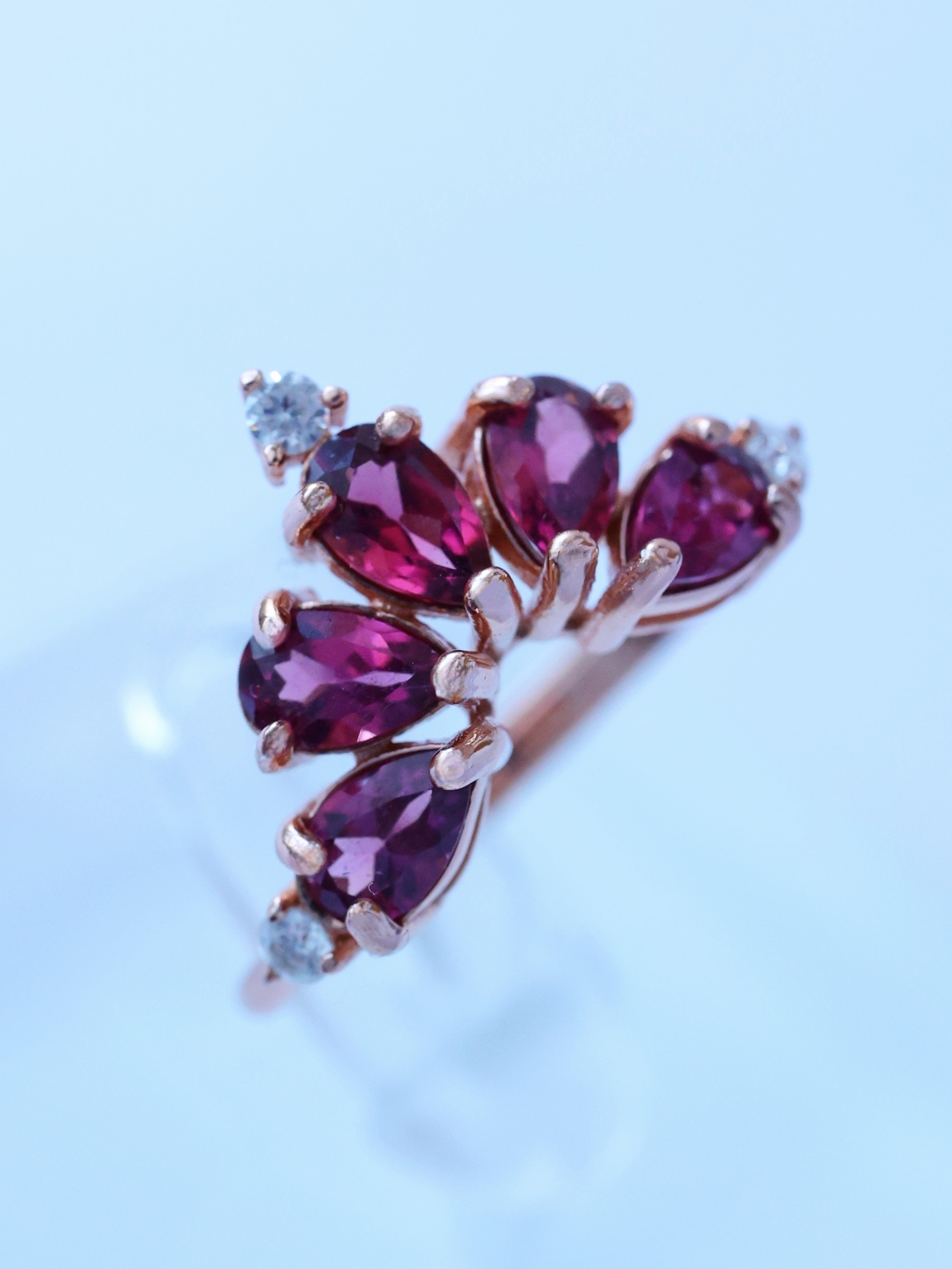 ピンクゴールドカラーの地金との組み合わせにより、ロードライトガーネットの持つ艶やかさがより引き立ち、優美さと温もりを感じさせる印象に。